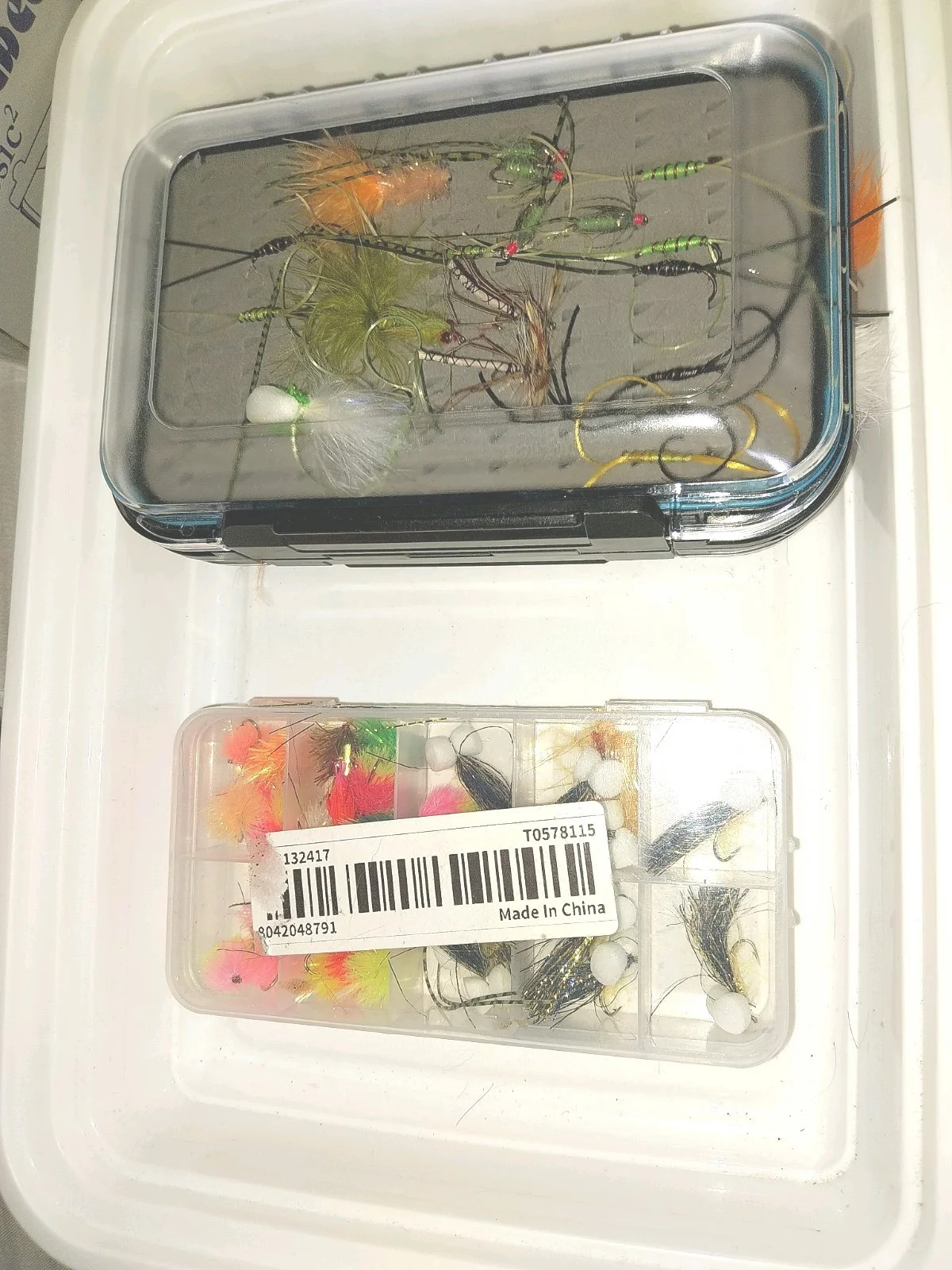 as per pictures 2 cases with various blobs and flies etc for fly fishing.approx 50 in total
