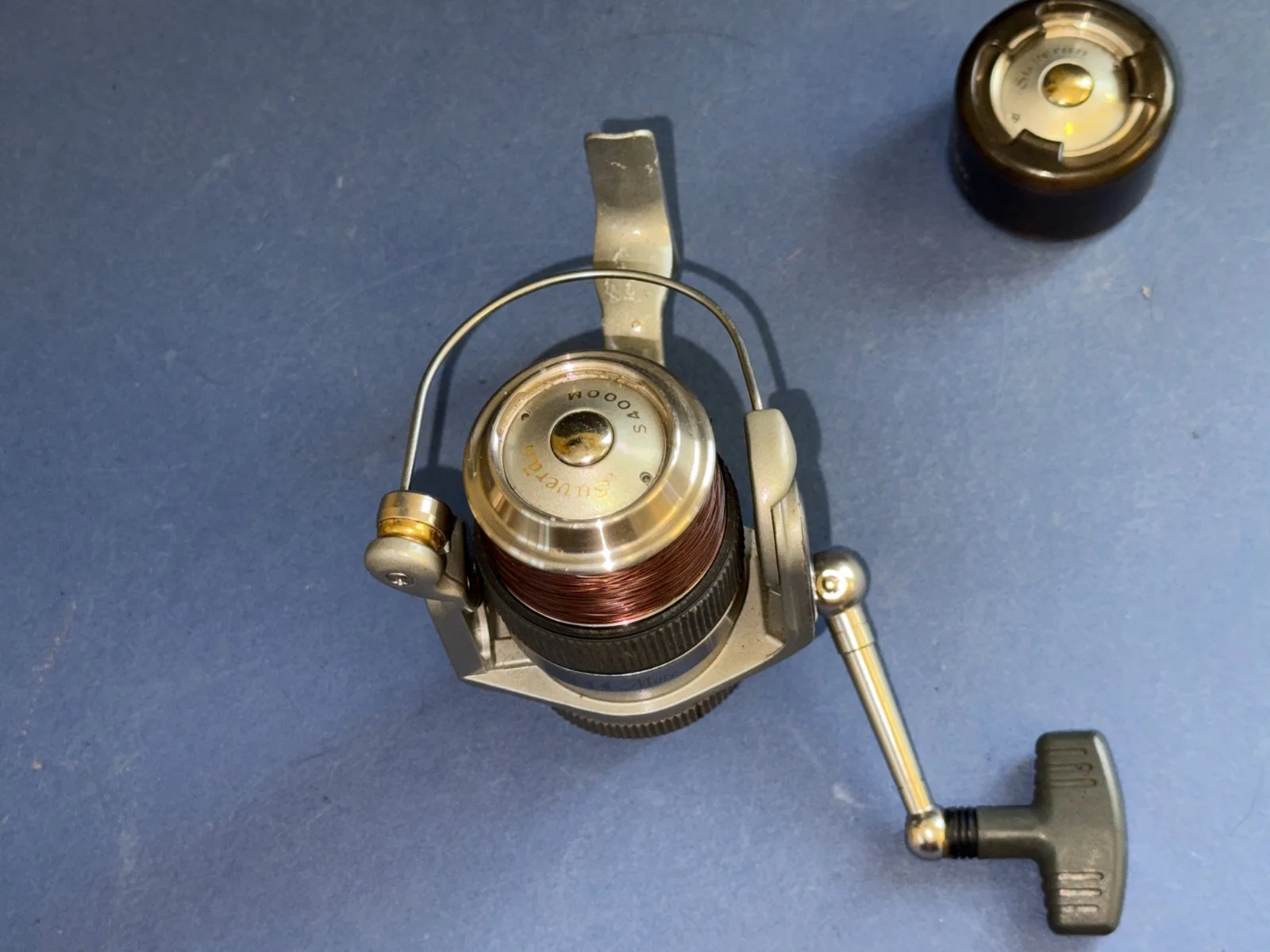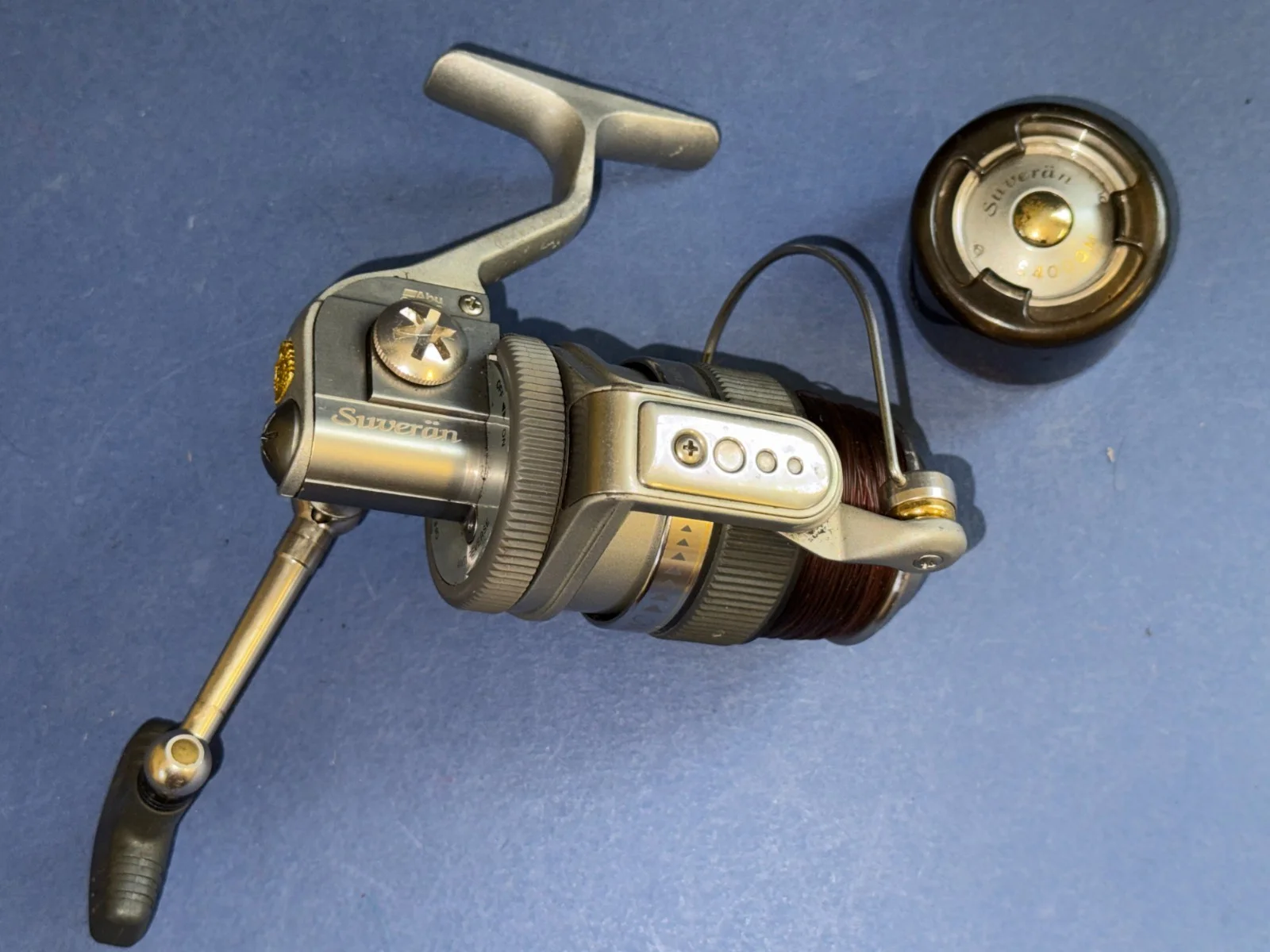 ABU GARCIA SUVERAN S4000M SPINNING REEL WITH SPARE SPOOLA GOOD WORKING REEL- SMOOTH ACTIONTHERE ARE MINOR SCRATCHES AND MARKS ON BOTH THE REEL AND SPOOL FROM USEPLEASE SEE IMAGES