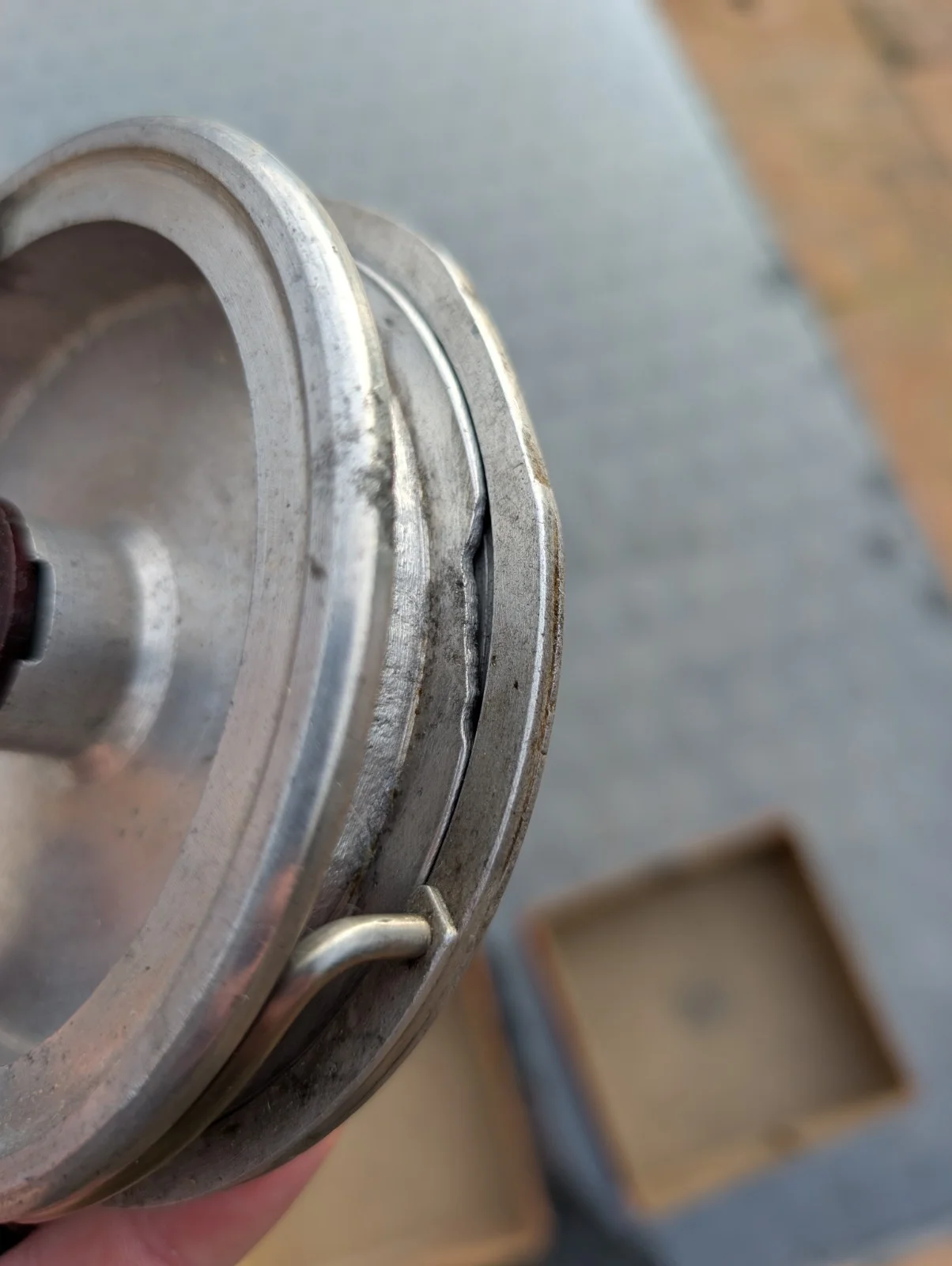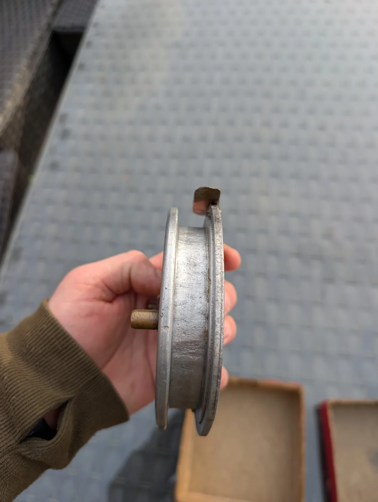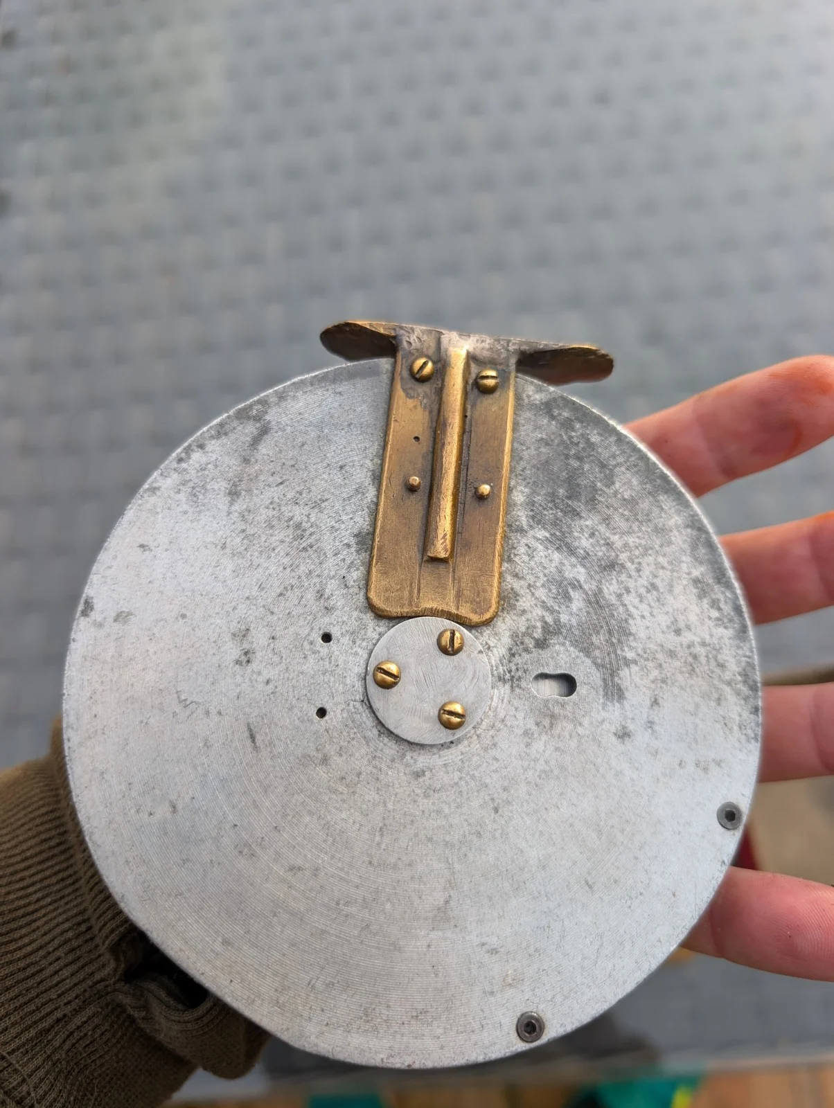 old aluminium centre pin reel, manufacturer unknown .It does have some good signs of wear and was previously a bit corroded but I have cleaned it up and it spins well with little resitance
