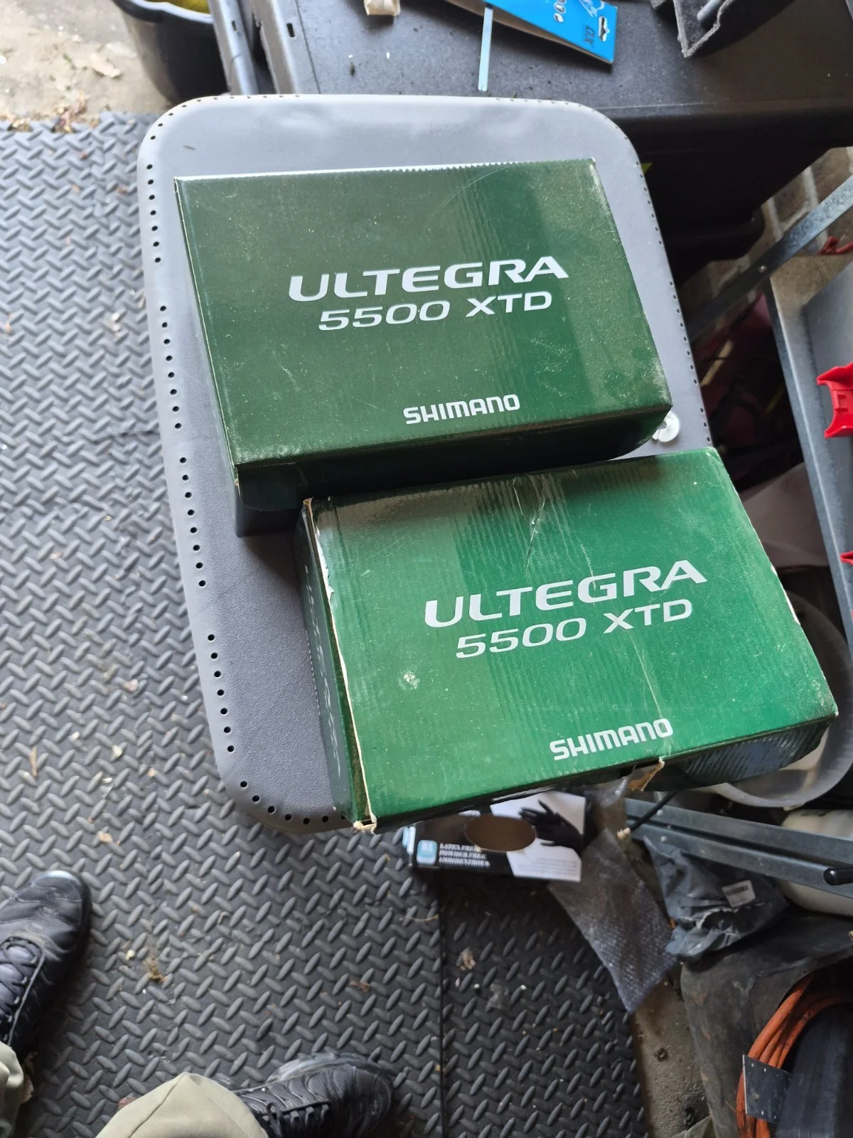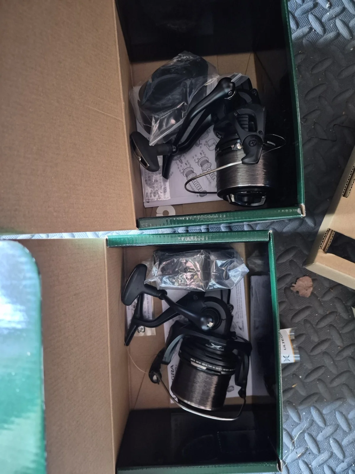 The Shimano Ultegra 5500 XTD Reels X 4come with boxes and reducers also 2 spare spools which currently have braid on one and floating line on other main reels are loaded with 15lb esp synchro line currently this may be taken off in next few days if i get my new reels as its fresh lineare a set of high-quality spinning reels designed for carp fishing. Made from aluminium, these reels feature a sleek black colour and a durable construction. With a gear ratio of 5.3:1, these reels offer smooth and reliable performance, while the front drag system allows for easy control. The 58 cm per turn line recovery ensures efficient retrieval, and the 30 lb/350 yd braid capacity provides ample strength for handling larger fish. Perfect for both left and right-hand retrieve, these reels are suitable for unisex adults and come with a 1-year manufacturer warranty.