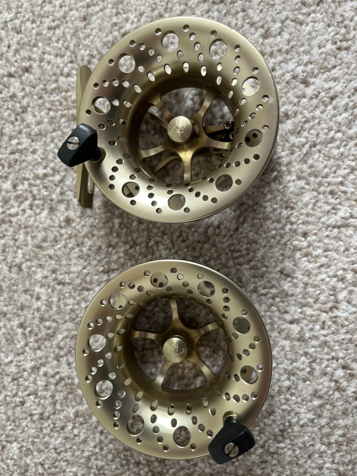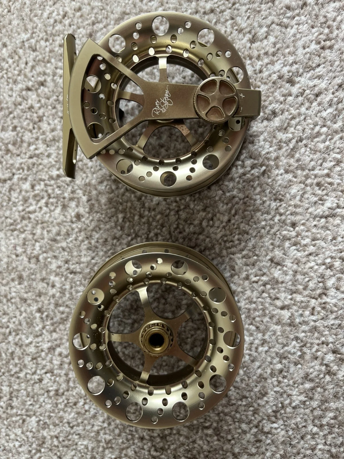 Wychwood River and Stream fly reel with spare spool # 4/5 in gunmetal colour. Hardly used and in very good condition. Delivered in their original boxes with pouches for both reel and spool.