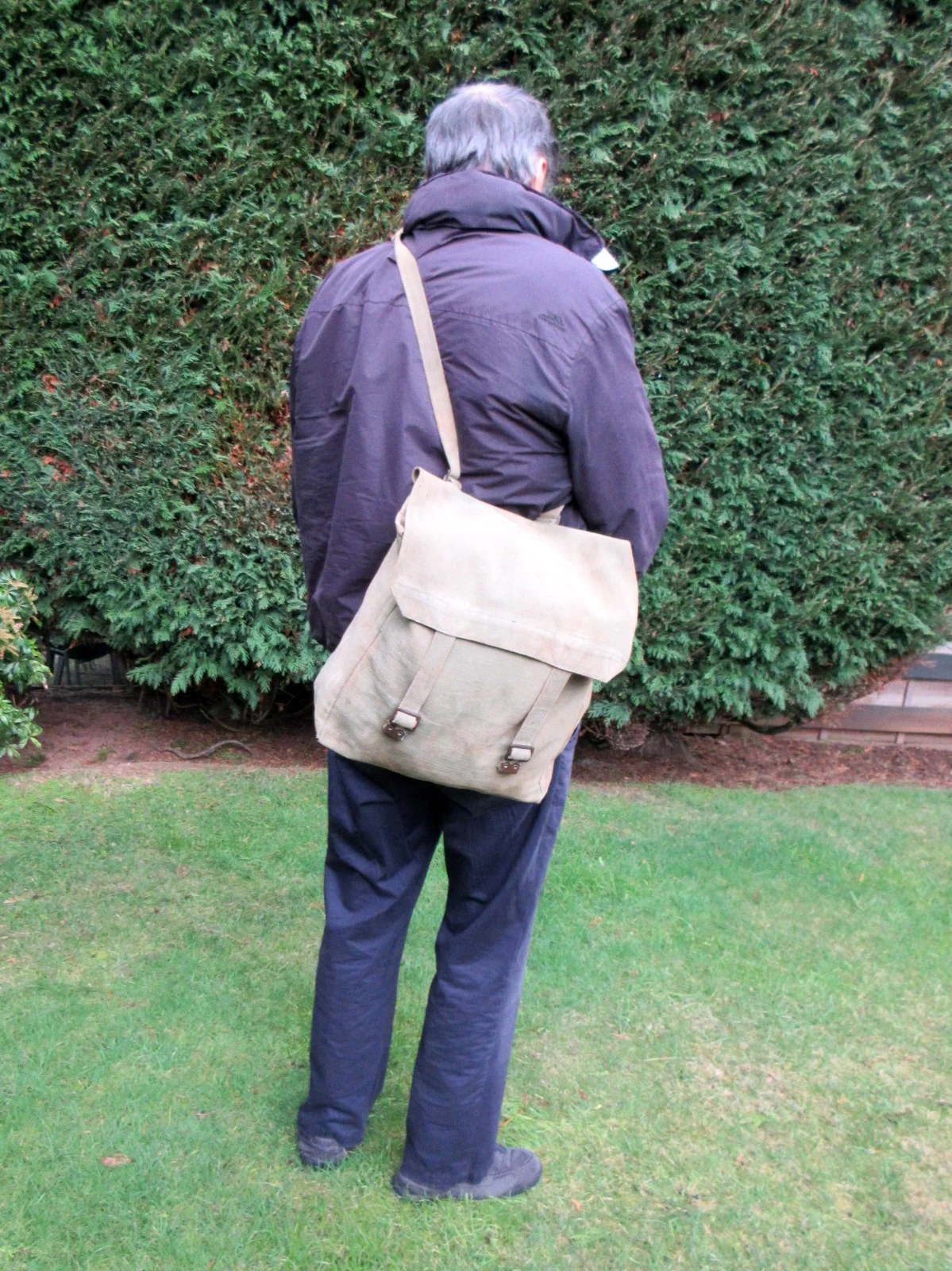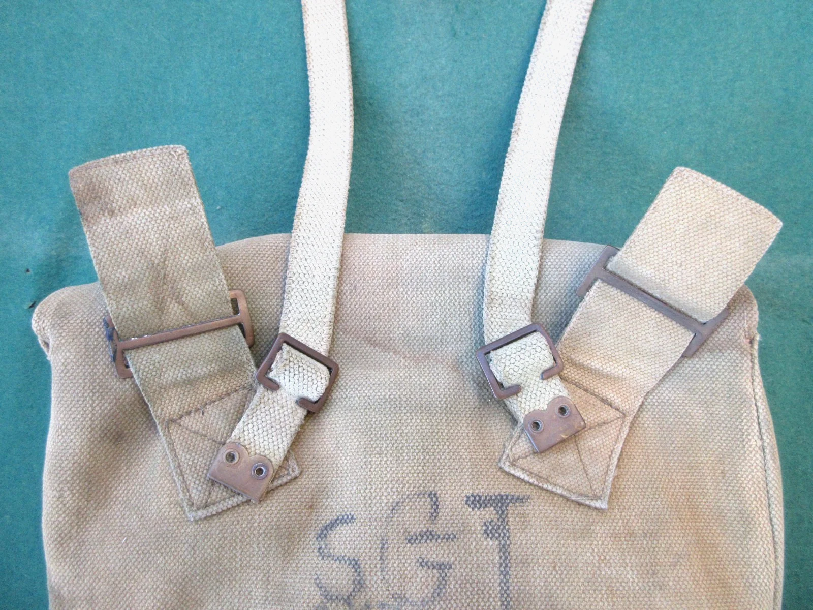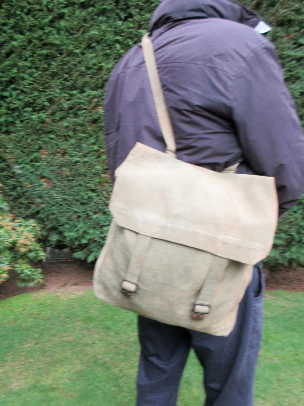 IF YOU ARE LOOKING FOR A FANCY BAG WITH LOADS OF POCKETS THEN LOOK ELSEWHERE. THIS IS A NO-FRILLS, SINGLE COMPARTMENT, EXCEPTIONALL STURDY THICK CANVAS SHOULDER BAG WHICH STARTED LIFE AS AN ARMY ISSUE - PROBABLY DURING WW2; HAVING SAID THAT IT IS STRUCTURALLY FAULTLESS AND WILL PROBABLY SERVE WHOEVER BUYS IT A LIFETIME. AS SHOULDER BAGS GO IT IS OF QUITE A LARGE SIZE (THE SPECTACLE CASE IN ONE OF THE PICTURES SHOULD GIVE AN IDEA OF SCALE), WITH A CAPACITY TO ACCOMMDATE ALL THE PARIPHINALIA THAT WE FISHERMEN TEND TO CARRY. (I HAVE BEEN USING A SMALLER VERSION OF THIS FOR THE PAST 60 YEARS AND IT IS STILL GOING STRONG!!). ON THE BACK THERE IS SOME STAINING AND "SGT. LLOYD" WRITTEN WITH BLACK FELT PEN (SEE LAST PICTURE), BUT LIKE I SAY IF YOU WANT A PRETTY LOOKING BAG THEN THIS IS NOT FOR YOU - THIS IS FOR SOMEONE WHO WANT A STRONG FUNCTIONAL ITEM THAT WILL LAST FOR MANY, MANY YEARS TO COME
