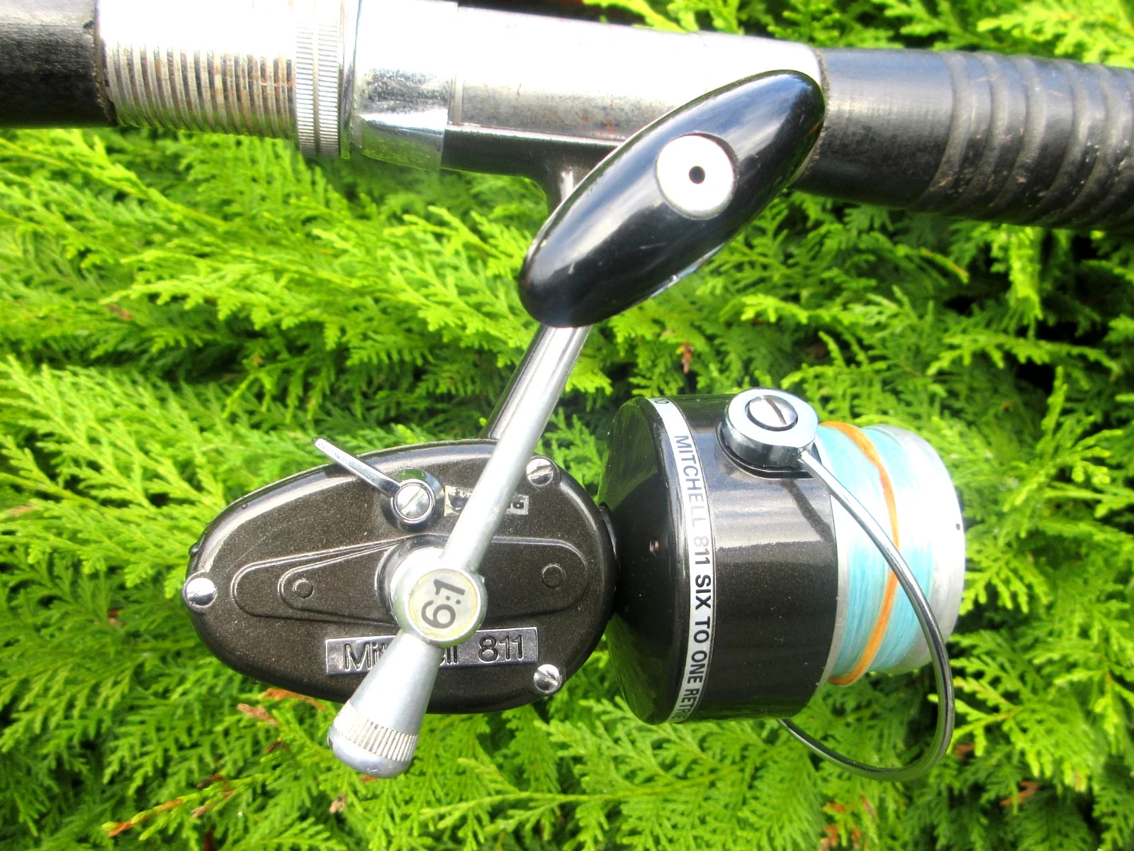 THIS ONE OF THE SCARCER MITCHELL REELS, WHICH I AM GIVEN TO UNDERSTAND WAS NOT AVAILABLE IN THIS COUNTRY. IT IS THEIR MODEL NO. 811 IN A VERY DEEP BRONZE COLOUR AND IT COMES COMPLETE WITH A SPARE SPOOL IN IT'S ORIGINAL PLASTIC CONTAINER, AND A CLOTH DRAW-STRING BAG (THIS IS NOT A MITCHELL BAG BUT DOES THE JOB FINE). FEATURES OF THE REEL INCLUDE AUTOMATIC RETURN BALE ARM, AN IMPRESSIVE 6 : 1 RETRIEVE RATIO, LARGE CAPACITY SPOOL, PRESS BUTTON FOR QUICK RELEASE OF THE SPOOL, ON/OFF LEVER FOR THE ANTI-REVERSE, AND FOLD AWAY HANDLE FOR EASE OF STORAGE. IT IS IN AN EXCELLENT CONDITION AND THE ONLY THING THAT PREVENTS ME DESCRIBING IT AS MINT IS A SMALL LOSS OF PAINT AT THE VERY ENDS OF THE FOOT AND SLIGHT WEAR TO THE TRANSFERS IN A COUPLE OF PLACES. I AM SELLING IT WITH AN UNCONDITIONAL GUARANTEE.