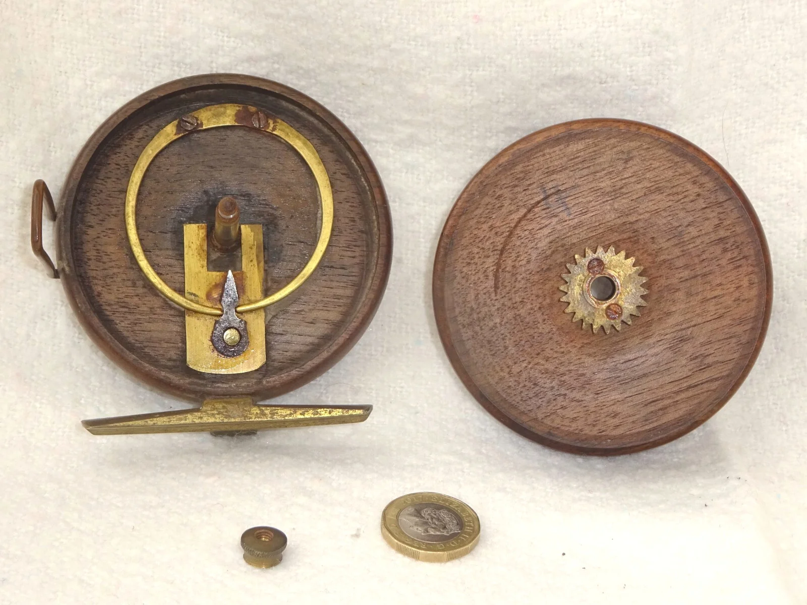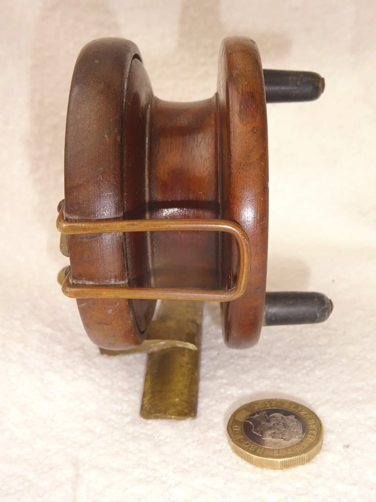 EXCELLENT 3.25" MAHOGANY & BRASS STARBACK CENTREPIN. WITH RATCHET & LINE GUIDE.
