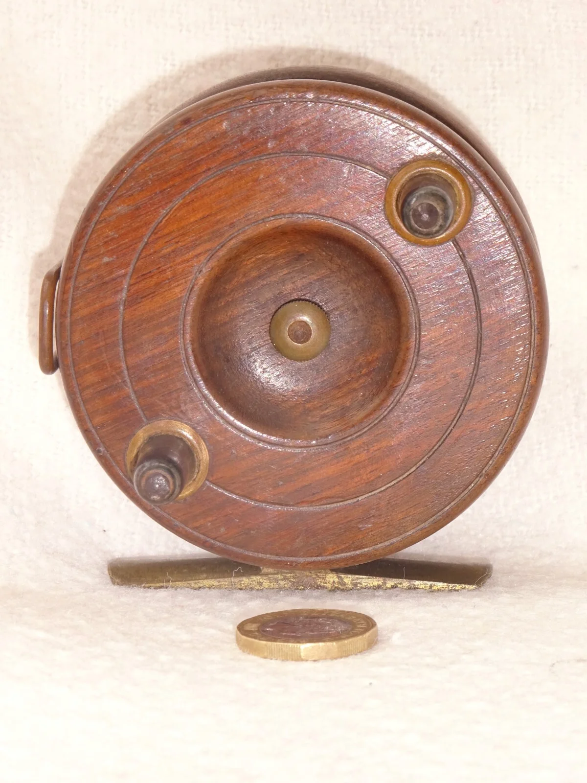 THIS IS A PARTICULARLY NICE OLD MAHOGANY AND BRASS CENTREPIN REEL IN AN ORIGINAL AND UNPOLISHED CONDITION. IT HAS A DIAMETER OF 3.25 INCHES (8 CMS) AND IS FITTED WITH TWIN COMPOSITE HANDLES WHICH REVOLVE FREELY OIN THEIR BRASS SEATS. IT ALSO HAS A BRASS LINE GUIDE, AND AN ON/OFF BUTTON FOR THE MARK 1 CLICK-CHECK MECHANISM. IT IS IN AN EXCELLENT CONDITION AND I AM SELLING IT WITH AN UNCONDITIONAL MONEY BACK GUARANTEE.