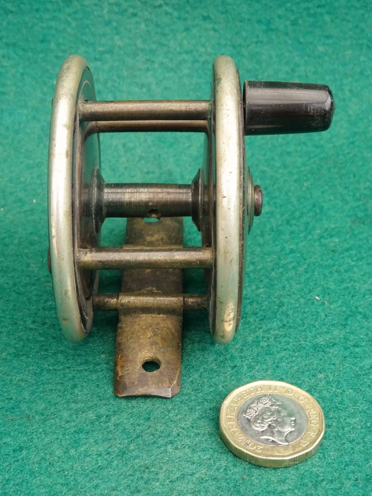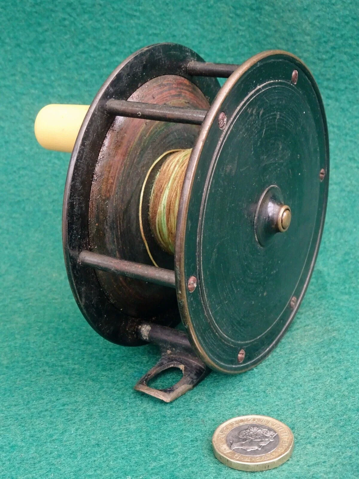 THIS HERCULES PATTERN REEL DATES FROM THE LATE 1800's AND IS A REAL BEAST OF A THING WITH A FOUR INCH DIAMETER AND WEIGHING IN AT 0.5 KG - CLEARLY INTENDED FOR USE ON THE HEAVY OLD GREENHEART SALMON RODS OF OUR ANCESTORS. WHEN I BOUGHT THIS REEL MANY YEARS AGO I WAS ASSURED THAT IT WAS MADE BY DAVID SLATER OF NEWARK, AND THE NAME ON THE FACEPLATE "H.MOORE, LIVERPOOL" WAS THE RETAILER - PERHAPS SOMEONE OUT THERE CAN CONFIRM THIS AND IF SO PLEASE LET ME KNOW. THE REEL IS IN A REMARKABLY FINE CONDITION WITH MUCH OF THE ORIGINAL ANODISED COATING STILL ON THE BRASS. AND FEATURES OF THE REEL INCLUDE A WHITE COMPOSITE HANDLE WHICH SPINS FREELY ON IT'S SPINDLE, A GOOD STRONG CONSTANT CLICK-CHECK MECHANISM ON THE SMOOTH WINDING SPOOL, AND A WAISTED FOOT WITH HOLES AT EACH END AS ORIGINALLY MANUFACTURED; HOWEVER PLEASE NOTE THE VERY SLIGHT NARROWING FILED AT THE ENDS OF THE FOOT. MANY YEARS AGO. IT IS NEVERTHELESS A LOVELY REEL IN OUTSTANDING CONDITION. THE £1 COIN IN THE PICTURES IS TO GIVE AN IDEA OF SCALE. I HAVE BEEN COLLECTING VINTAGE FISHING TACKLE FOR MANY YEARS BUT WILL BE SELLING MY COLLECTION OF REELS OVER THE COMING WEEKS ON EBAY. I HAVE ALWAYS TRIED TO BUY GOOD QUALITY ITEMS IN FINE CONDITION, BUT WHERE AN ITEM FALLS SHORT I WILL POINT OUT ANY SHORTCOMINGS. I WILL COMBINE POSTAGE FOR MULTIPLE PURCHASES AND ALL MY ITEMS ARE UNCONDITIONALLY GUARANTEED.INTERNATIONAL BUYERS PLEASE NOTE THE POSTAGE COST QUOTED IS FOR COUNTRIES OUTSIDE EUROPE; EUROPEAN COUNTRIES WILL BE CHEAPER - PLEASE ASK BEFORE BIDDING., .