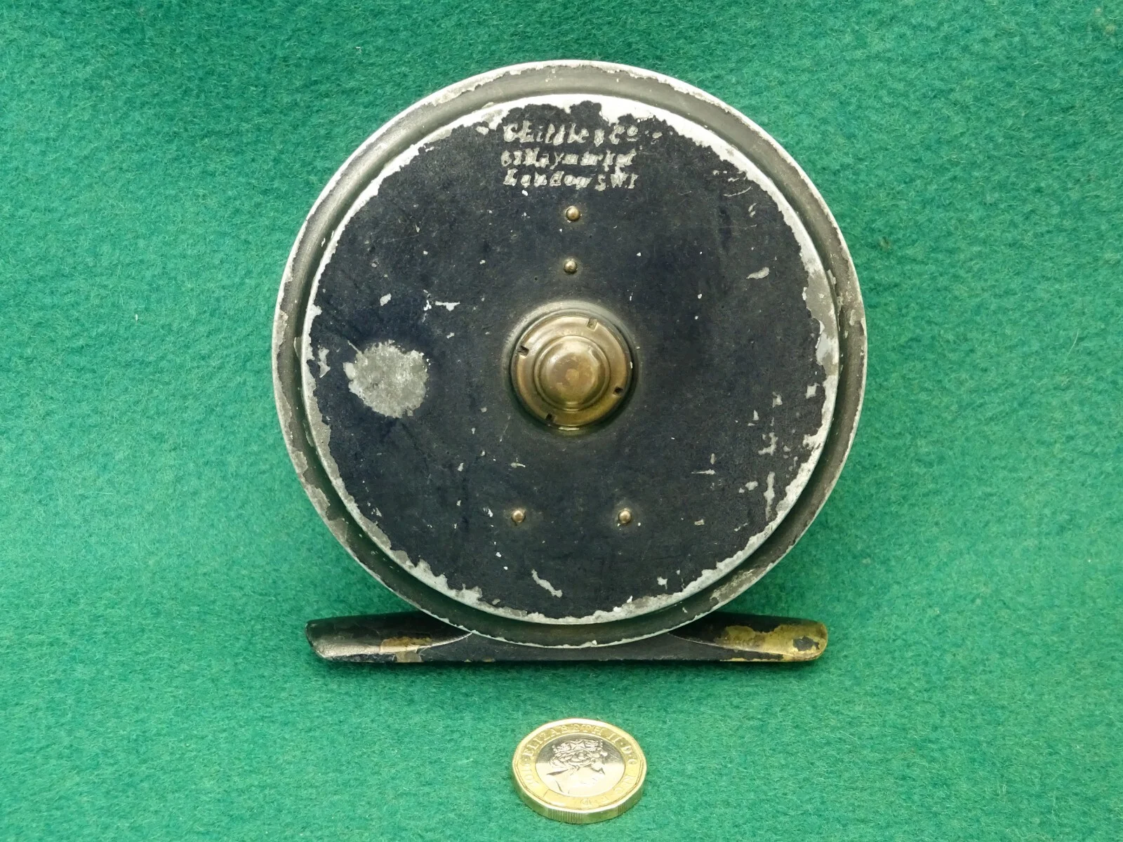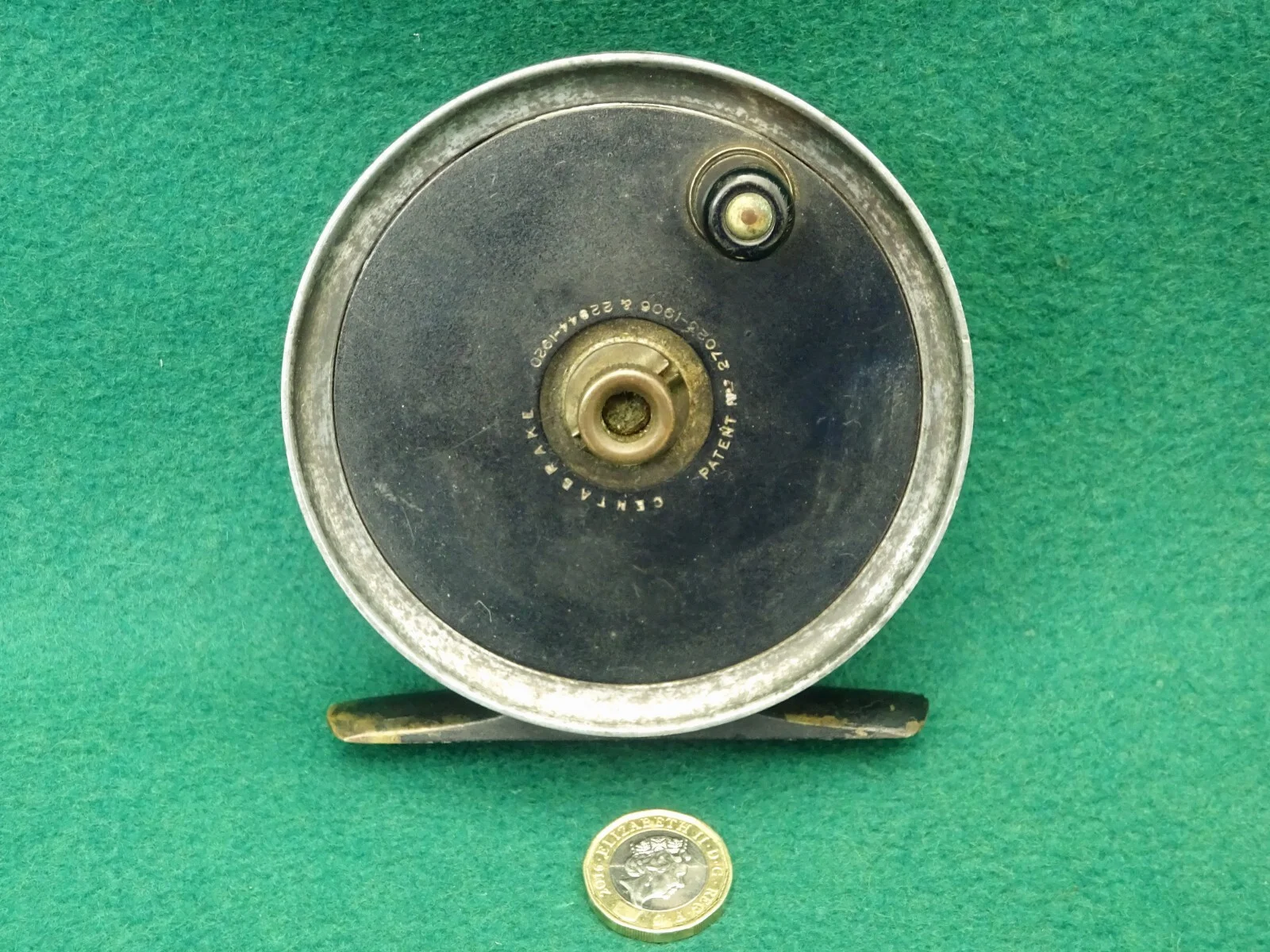 THIS REEL IS FOR THE SERIOUS COLLECTOR OF ANTIQUE FISHING TACKLE - IT IS BY A SCARCE MAKER , OVER 100 YEARS OLD, AND OTHER THAN GOOD HONEST WEAR TO THE PAINT FINISH IT IS IN A FINE CONDITION WITH NO DAMAGE AND EVERYTHING WORKING PERFECTLY. IT IS A GUNMETAL SALMON FLY REEL WITH A FOUR INCH DIAMETER, AND INSCRIBED WITH THE MAKER'S DETAILS - "G.LITTLE & CO., 67, HAYMARKET, LONDON S.W.1" - PLEASE NOTE THAT THIS COMPANY OPERATED AT 67, HAYMARKET FROM 1886 TO 1925 ONLY!! FEATURES OF THE REEL INCLUDE AN EBONITE HANDLE ON A METAL SEAT - THIS SPINS SMOOTHLY ON IT'S SPINDLE, A THREE-PIECE BRASS MECHANISM WHICH SECURES THE SPOOL AND AND DOUBLES AS A VERY GOOD (UNUSUAL) TENSION ADJUSTER, A CONSTANT CLICK-CHECK, AND A FULL LENGTH BRASS FOOT. YOU WILL SEE IN THE PHOTOS THAT THERE IS WEAR TO THE BLACK PAINT FINISH - MOSTLY AROUND THE RIMS, BUT THERE IS NO DAMAGE AT ALL AND THE SPOOL TURNS VERY SWEETLY. THE BACKPLATE IS INSCRIBED WITH THE MAKER'S DETAILS AND THE FRONT PLATE BEARS "CENTRABRAKE. PATENT NO. 27023 - 1906 AND 22044 - 1920". IT COMES COMPLETE WITH A DRAW STRING PROTECTIVE CLOTH POUCH WHICH IS NOT ORIGINAL BUT DOES THE JOB FINE (SEE LAST PICTURE). THE £1 COIN IN THE PICTURES IS TO GIVE AN IDEA OF SCALE. I HAVE BEEN COLLECTING VINTAGE FISHING TACKLE FOR MANY YEARS BUT WILL BE SELLING MY COLLECTION OF REELS OVER THE COMING WEEKS ON EBAY. I HAVE ALWAYS TRIED TO BUY GOOD QUALITY ITEMS IN FINE CONDITION, BUT WHERE AN ITEM FALLS SHORT I WILL POINT OUT ANY SHORTCOMINGS. I WILL COMBINE POSTAGE FOR MULTIPLE PURCHASES AND ALL MY ITEMS ARE UNCONDITIONALLY GUARANTEED.