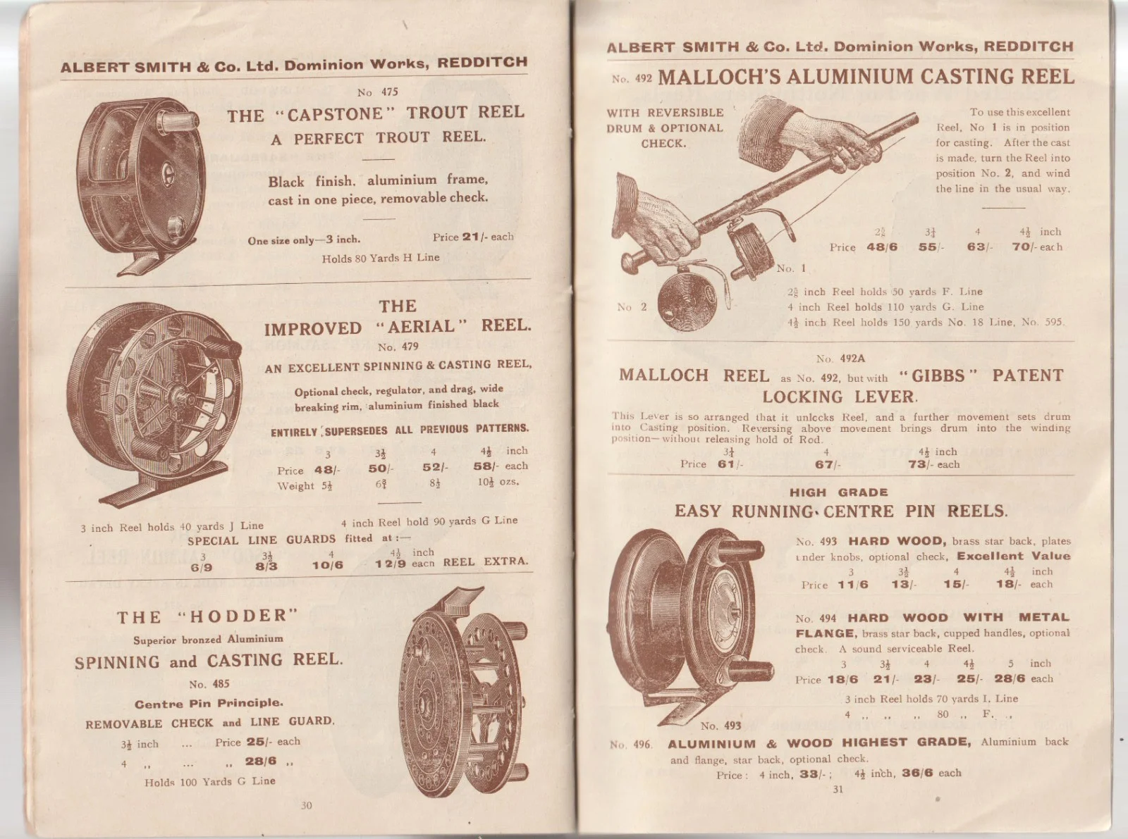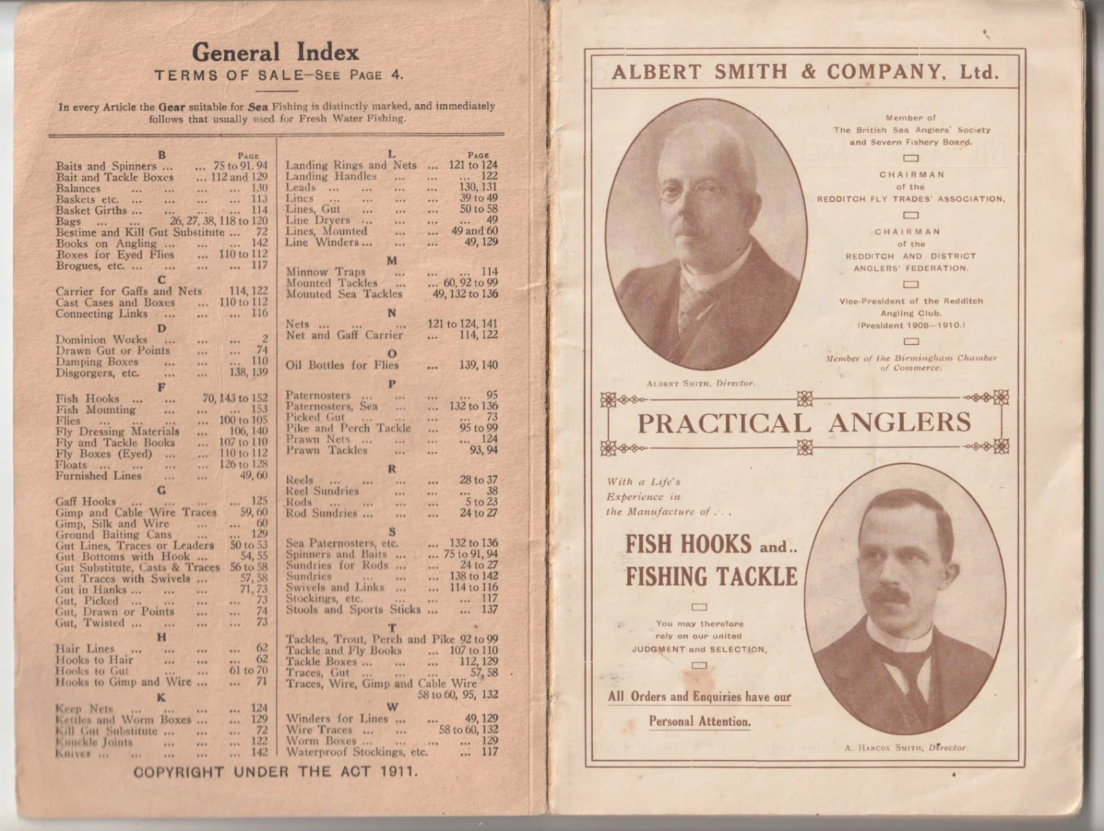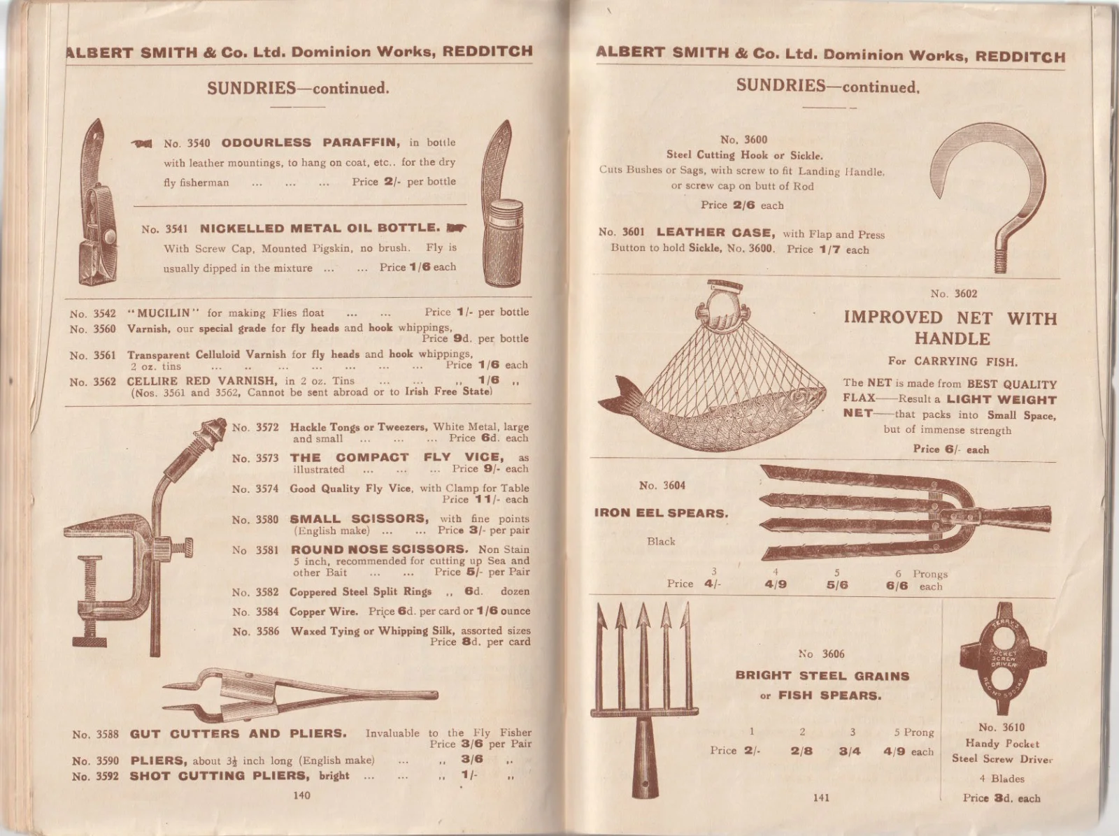 THIS IS AN 96 YEAR OLD CATALOGUE FROM ONE OF THE LESSER KNOWN TOP QUALITY TACKLE MAKERS BASED IN REDDITCH - ALBERT SMITH & CO. LTD.; IT IS UNDATED, BUT AN INTRODUCTORY LETTER AT THE FRONT FROM THE OWNERS IS DATED APRIL, 1929. IT IS S SOFTBACK BOOK OF AN IMPRESSIVE 156 PAGES ILLUSTRATED THROUGHTOUT IN MONOTONE, INCLUDING PRICES OF ALL THE ITEMS, AND IN AN EXCELLENT CONDITION FOR IT'S AGE WITH NO INSCRIPTIONS OR OTHER FAULTS. A PARTICULARLY SCARCE AND COLLECTABLE ITEM WHICH I AM SELLING WITH AN UNCONDITIONAL GUARANTEE.