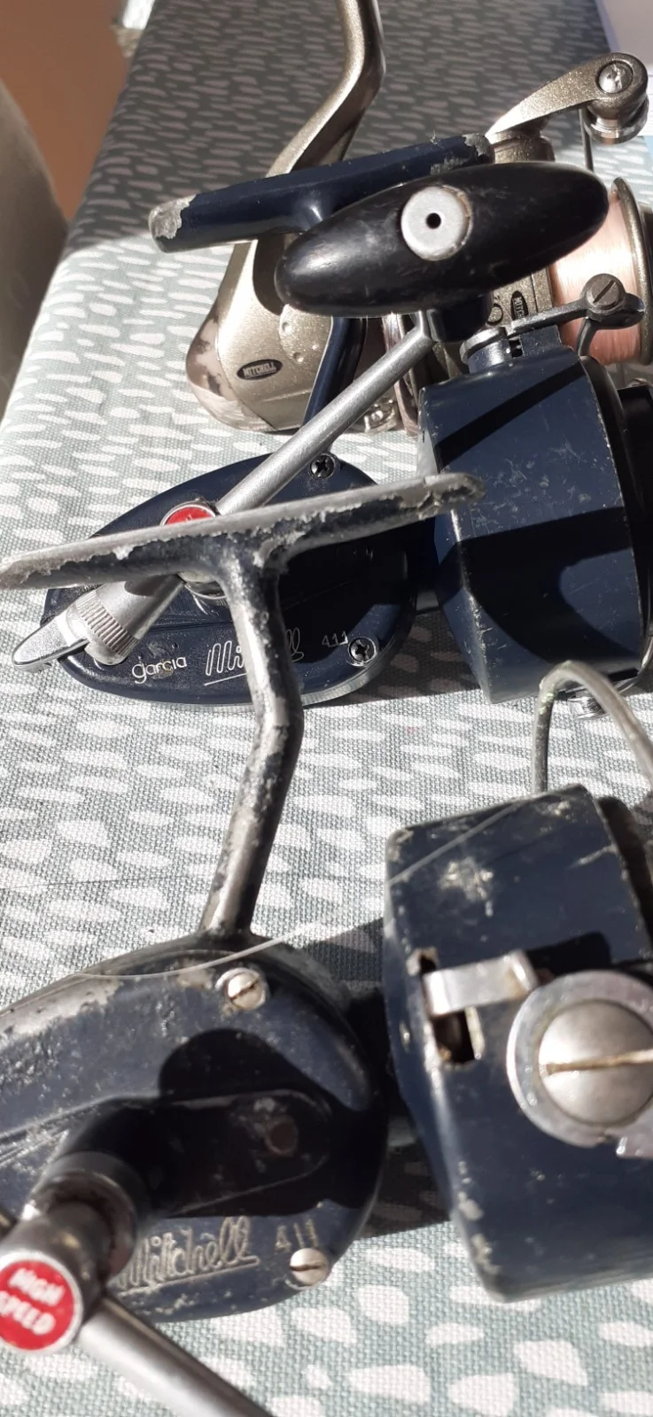 3 x vintage mitchell reels, 411 in very good condition. an Avocet in very good condition. and a 411 which although it works needs a bit of tlc.