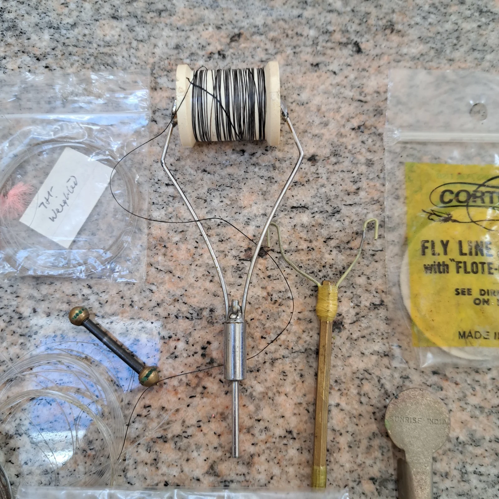 This collection of vintage fly fishing items includes a variety of fly fishing equipment and accessories, with a focus on fly fishing for trout. The assortment of items from brands like Sunrise India caters to vintage fishing enthusiasts looking to add unique and classic pieces to their fishing gear. Whether for display or practical use, this assortment of vintage fly fishing items is perfect for anglers passionate about the sport of fishing.Includes a sunrise india hackle guard,fly tying bobbin holder and Fly Tying Bobbin etc. Sold as seen as a have no knowledge of this sport.The photos clearly show the condition of the items.