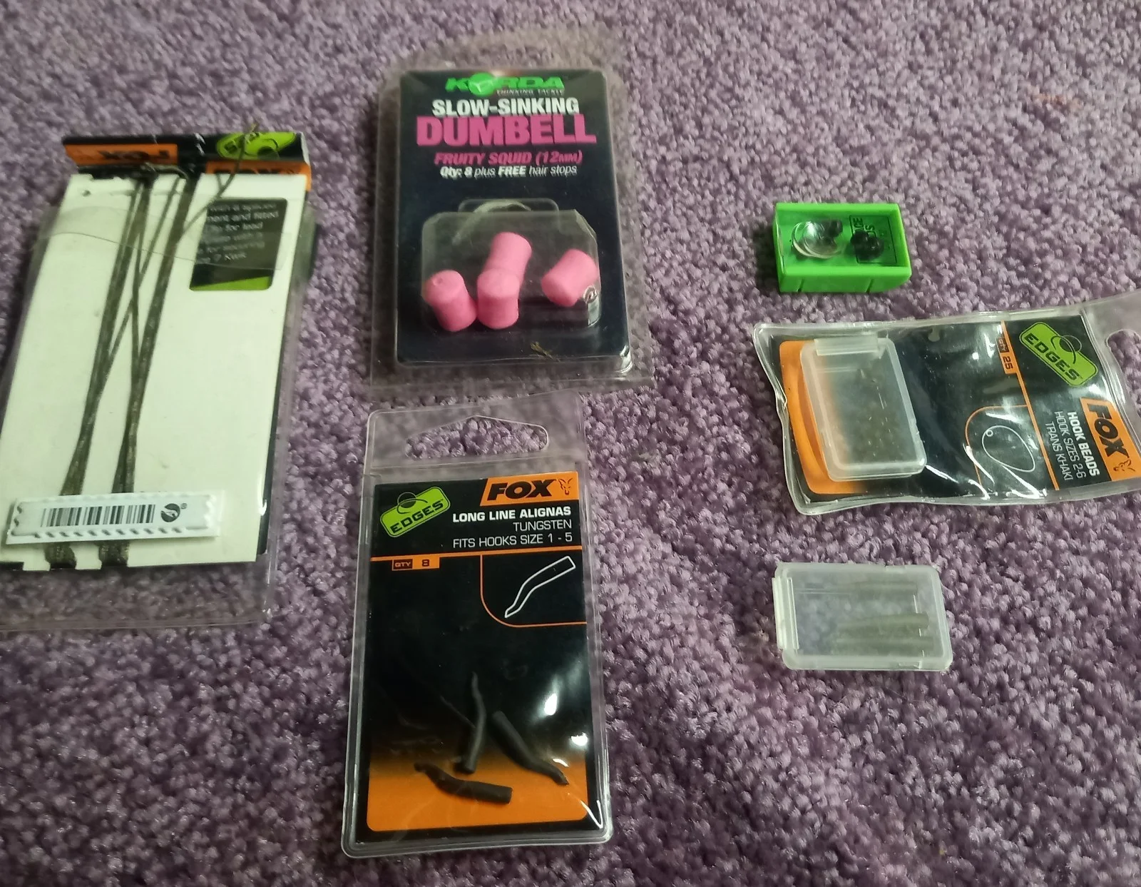 Mixed fishing bits , Magnetic Quick Release connectors x 4 , in black , great for bite Alarms, Bivvy Storm Poles , Bite Alarms, Rod rests . And E.S.P Catapult , ( Needs Elastic ) Gas Canister Cover , Fox Hook Beads x25 Size 2 to 6 , Korda no trace beads , Fox long line Alignas tungsten , x3 Size 1 to 5 . E.S.P. Lead Core x2 . Korda slow sinking Dumbbells , Fruity Squid x4 . Two pots of Pop Ups , not sure but think they are Essential Baits . And x5 Lead Wights . See photos , cannot fish much now , so clearing some stuff out . Please take alook at my other items for sale . All with free postage , comes from a smoke free home.