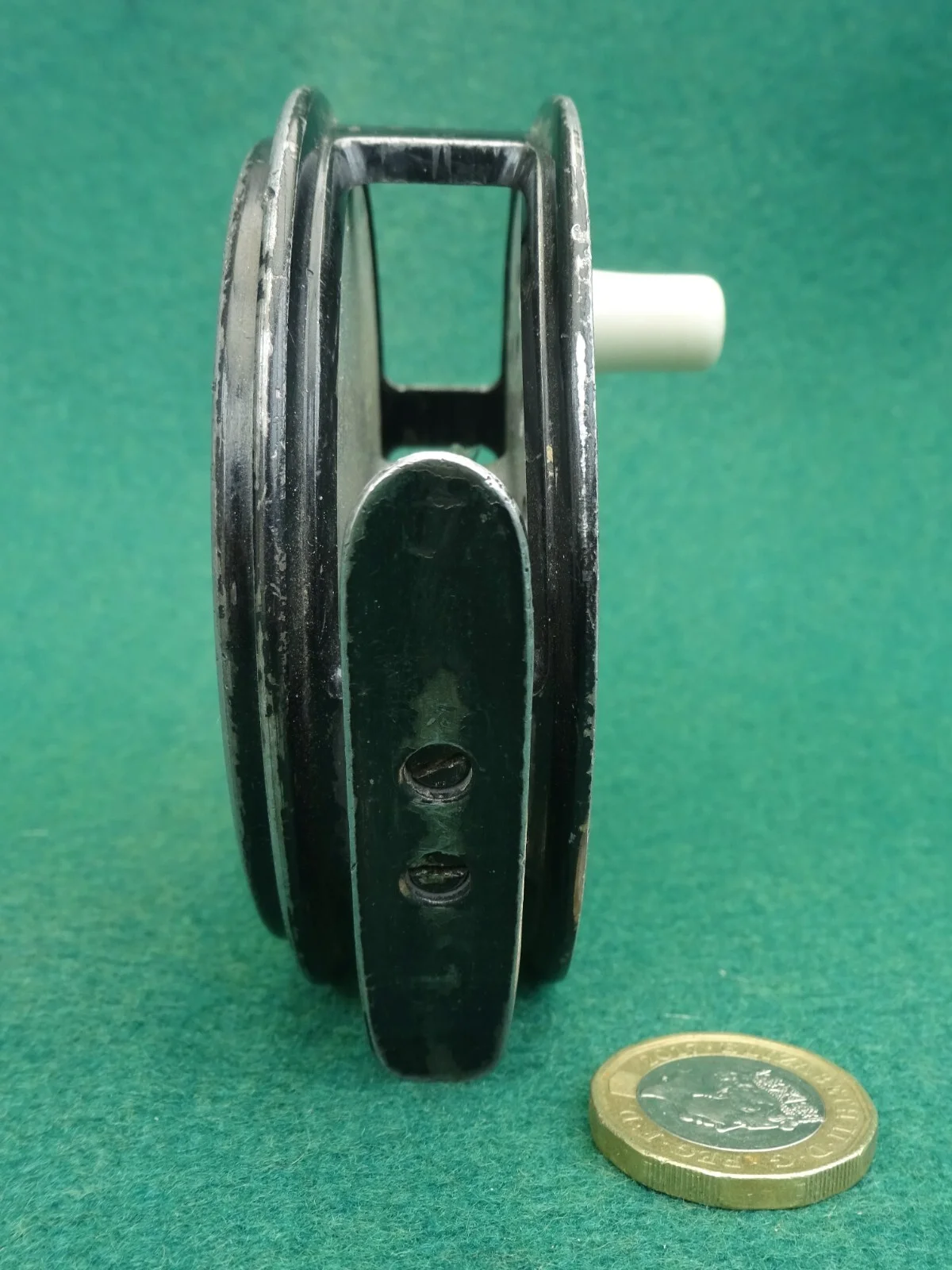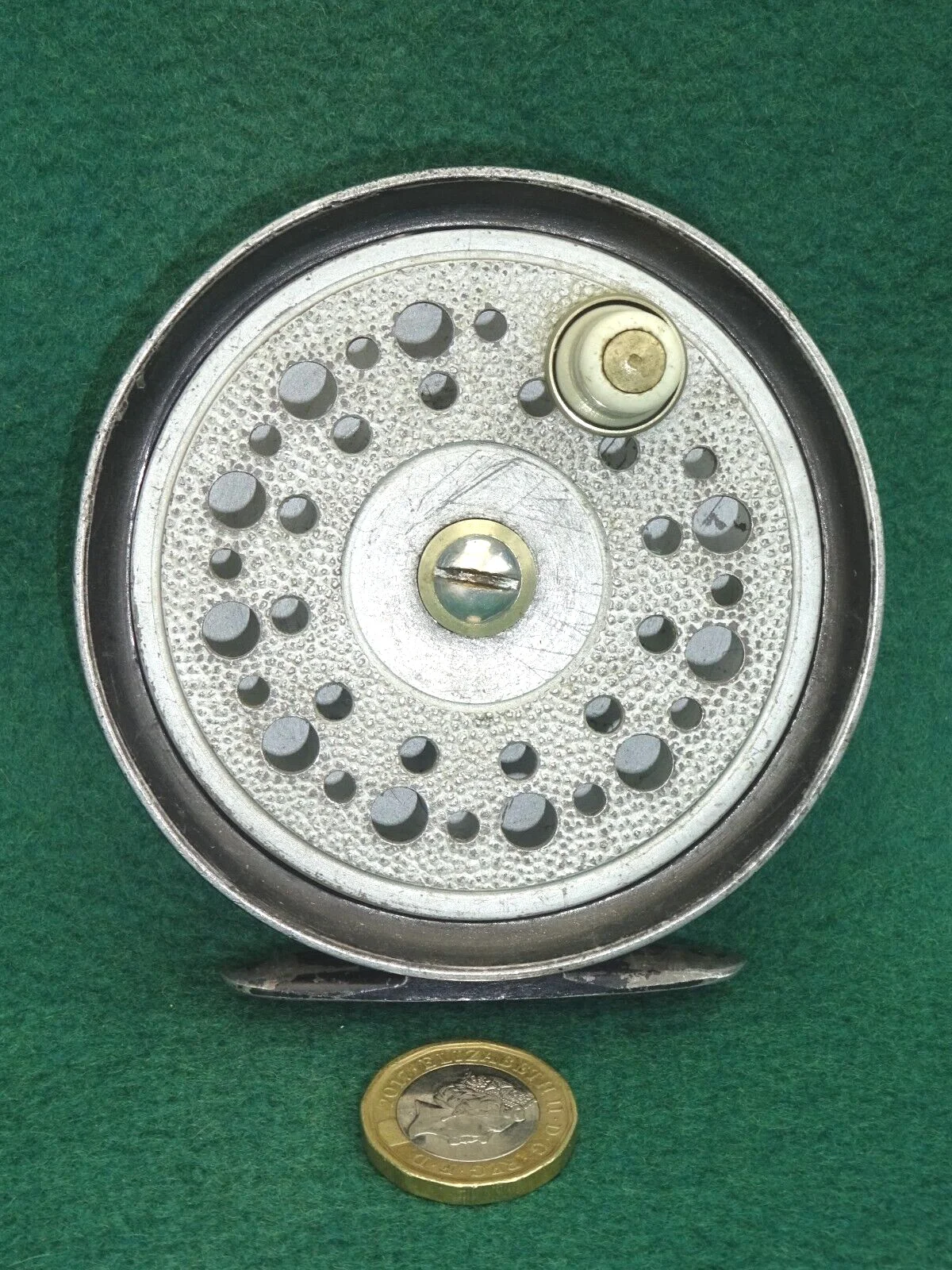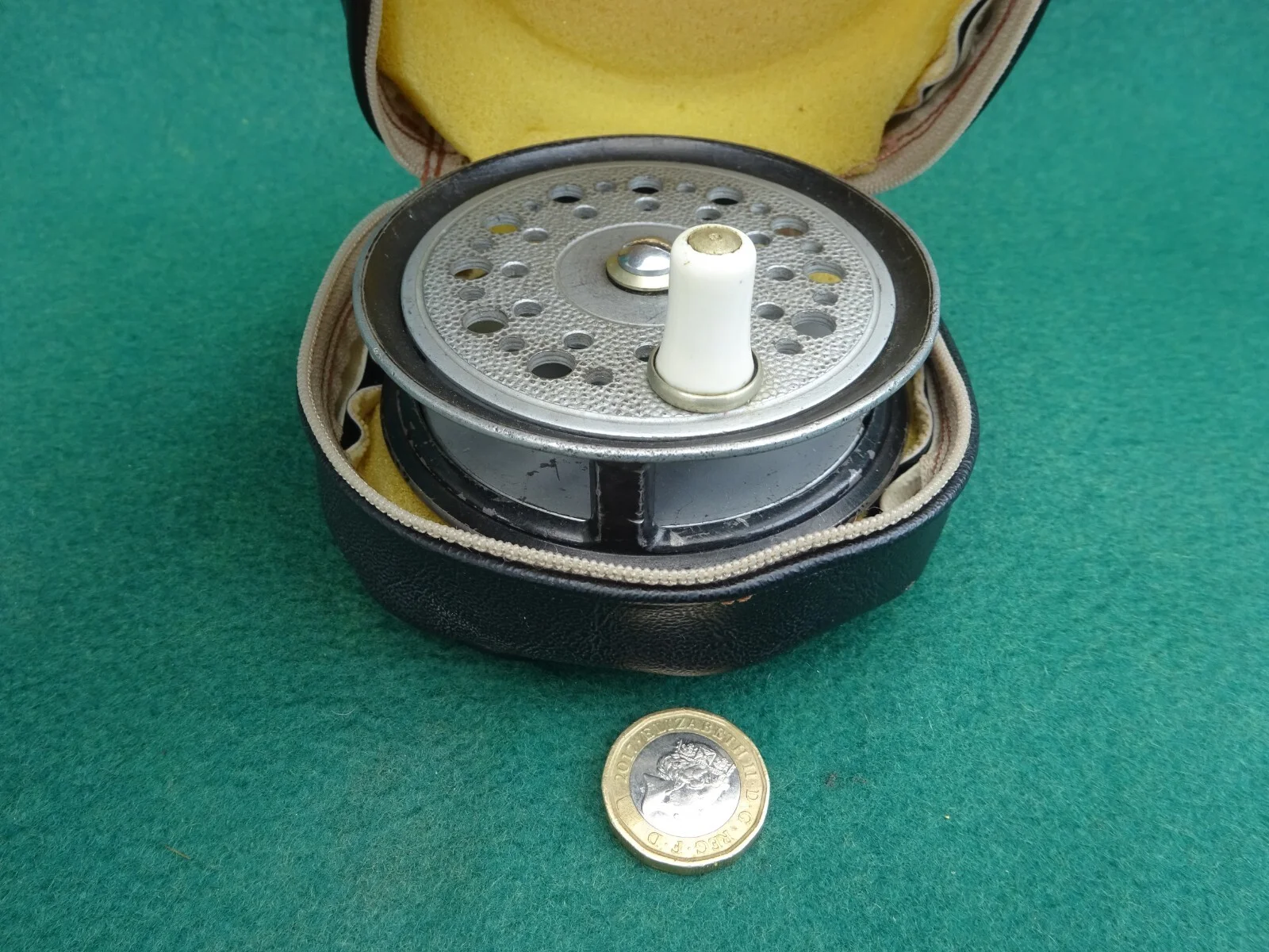EDGAR SEALEY WERE ONE OF THE EXCELLENT TACKLE DEALERS BASED IN REDDITCH, ENGLAND, AND WERE A MAJOR PLAYER DURING THE MIDDLE OF THE 1900's. THIS REEL IS THEIR "FLYMAN" MODEL - A 3.5ins DIAMETER FLY REEL, OF NON-RUSTING ALLOY CONSTRUCTION, EQUIPPED WITH COMPOSITE HANDLE ON AN ALLOY SEAT, AND A CONSTANT CLICK-CHECK MECHANISM. INSIDE THE BACKPLATE IS STAMPED THE DATE OF PRODUCTION - "2/64". IT COMES COMPLETE WITH A NICE FAUX LEATHER REEL CASE IN FINE CONDITION THE £1 COIN IN THE PICTURES IS TO GIVE AN IDEA OF SCALE. I HAVE BEEN COLLECTING VINTAGE FISHING TACKLE FOR MANY YEARS BUT WILL BE SELLING MY COLLECTION OF REELS OVER THE COMING WEEKS ON EBAY. I HAVE ALWAYS TRIED TO BUY GOOD QUALITY ITEMS IN FINE CONDITION, BUT WHERE AN ITEM FALLS SHORT I WILL POINT OUT ANY SHORTCOMINGS. I WILL COMBINE POSTAGE FOR MULTIPLE PURCHASES AND ALL MY ITEMS ARE UNCONDITIONALLY GUARANTEED.