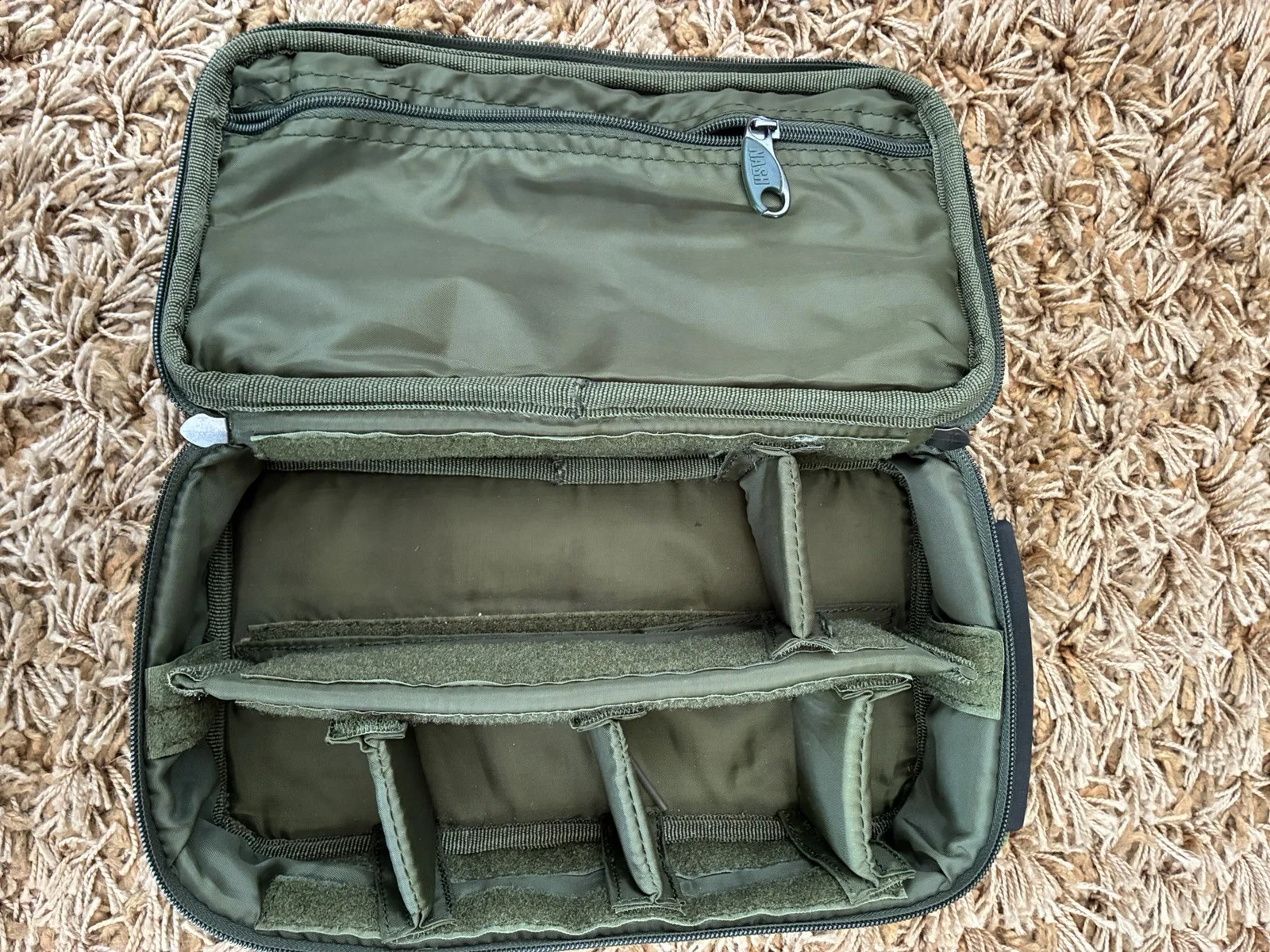 The Nash Tackle Handy Pouch is a convenient accessory for carp fishing, featuring four dividers and one spacious pocket made from durable polyester material. The green pouch, with dimensions of 30cm in length, 8cm in height, and 16cm in width, is designed by the trusted brand Nash. This compact tackle bag is perfect for keeping essential fishing items organized and easily accessible during your fishing adventures. All zips in good working order.