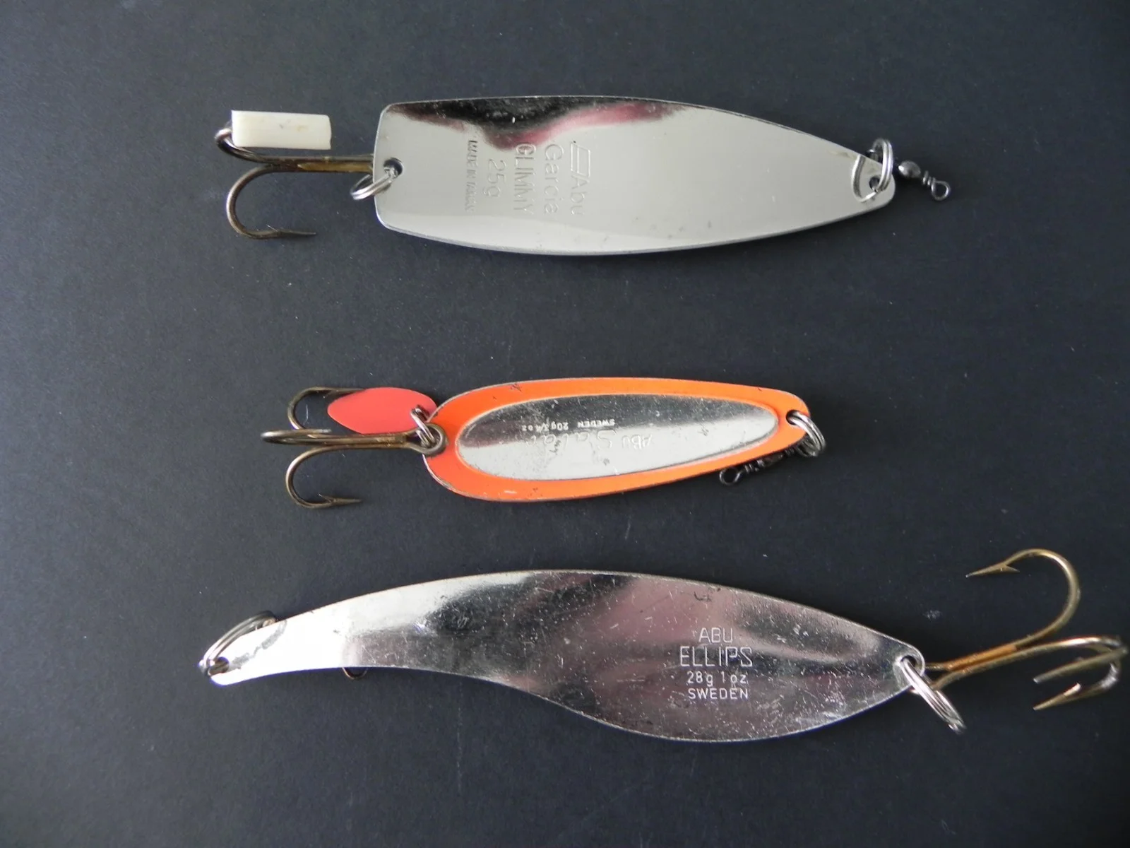 For sale 1 new ABU Glimmy 25g 9cms long 1 vintage ABU ELLIPS 28g 11cms long1 Vintage ABU SALAR 20gm 6.5cms long all lures made in Sweden and in excellent condition