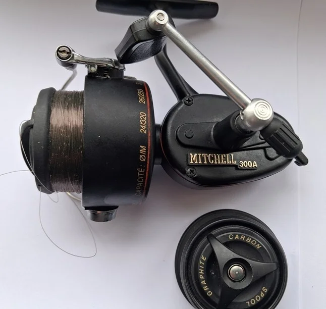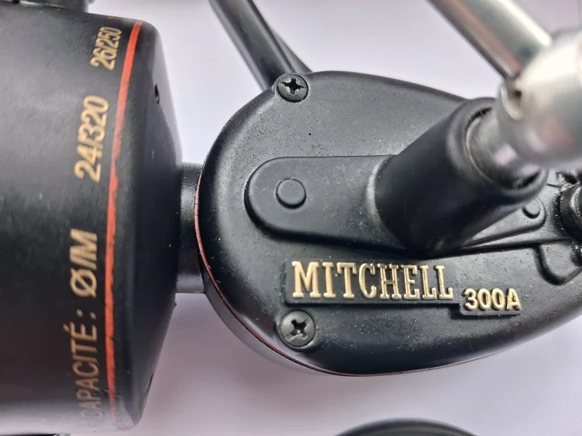A superb Boxed Mitchell 300A fishing reel . A near mint little used Mitchell 300A with spare spool and brochures and guarantee in the box with the outer printed protection case too. Its been on a rod but rare to find one in this condition. The lettering is in gold not the usual white. Comes with graphite carbon spools . Number on top of foot T.6. indicating that it was possibly one of the last made in 1989. Not to be missed.