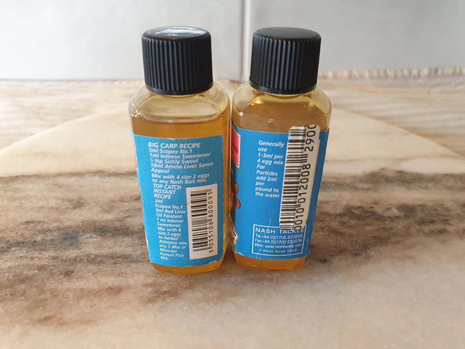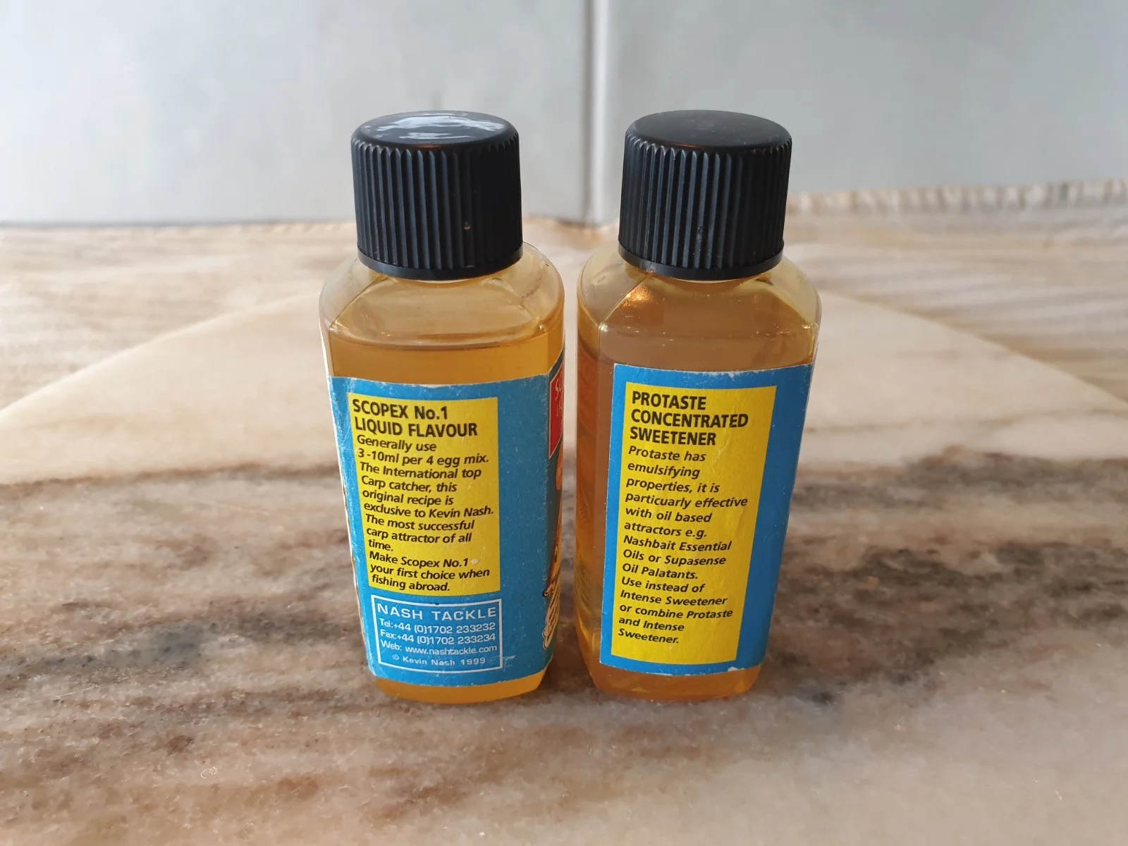 For sale I have a 50ml bottle of the original nash baits scopex no1 liquid flavour and a 50ml bottle of the original protaste concentrated sweetener.The scopex is almost full, from memory I only used roughly 3ml of flavour for one batch of popups.the Protaste I would estimate to be at minimum 90% full.both have been stored in air tight containers in the dark at stable temperature.