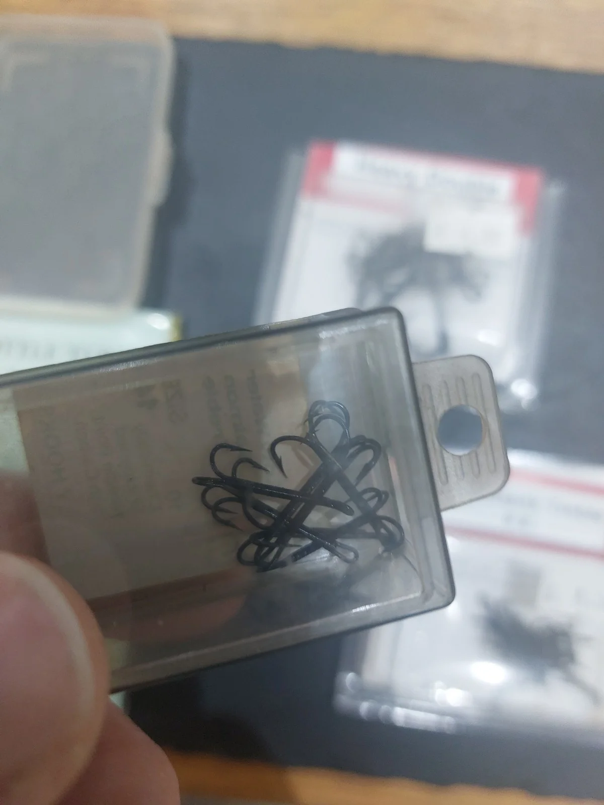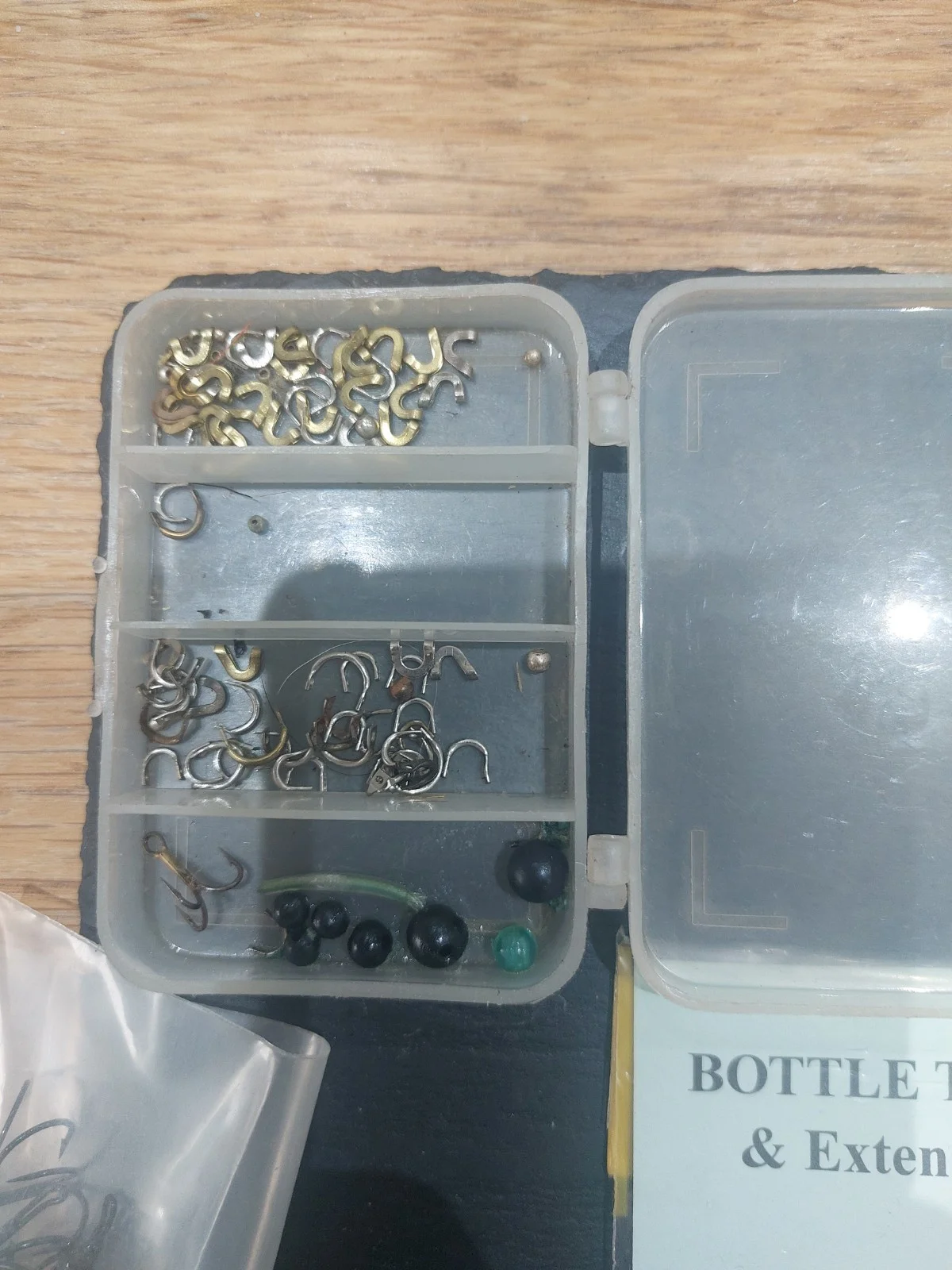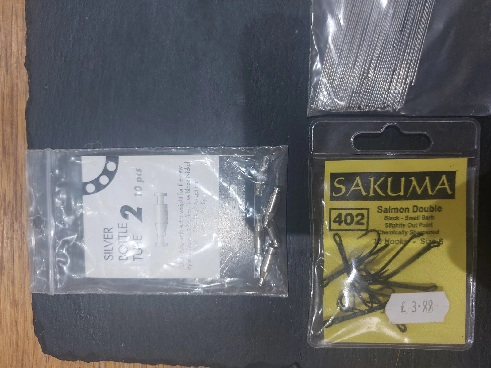 selection of double and treble hooks, part packs but a fair amount. also included 22mm ali bottle tubes 6off, 5off short tubes, plus wire. any questions please ask.