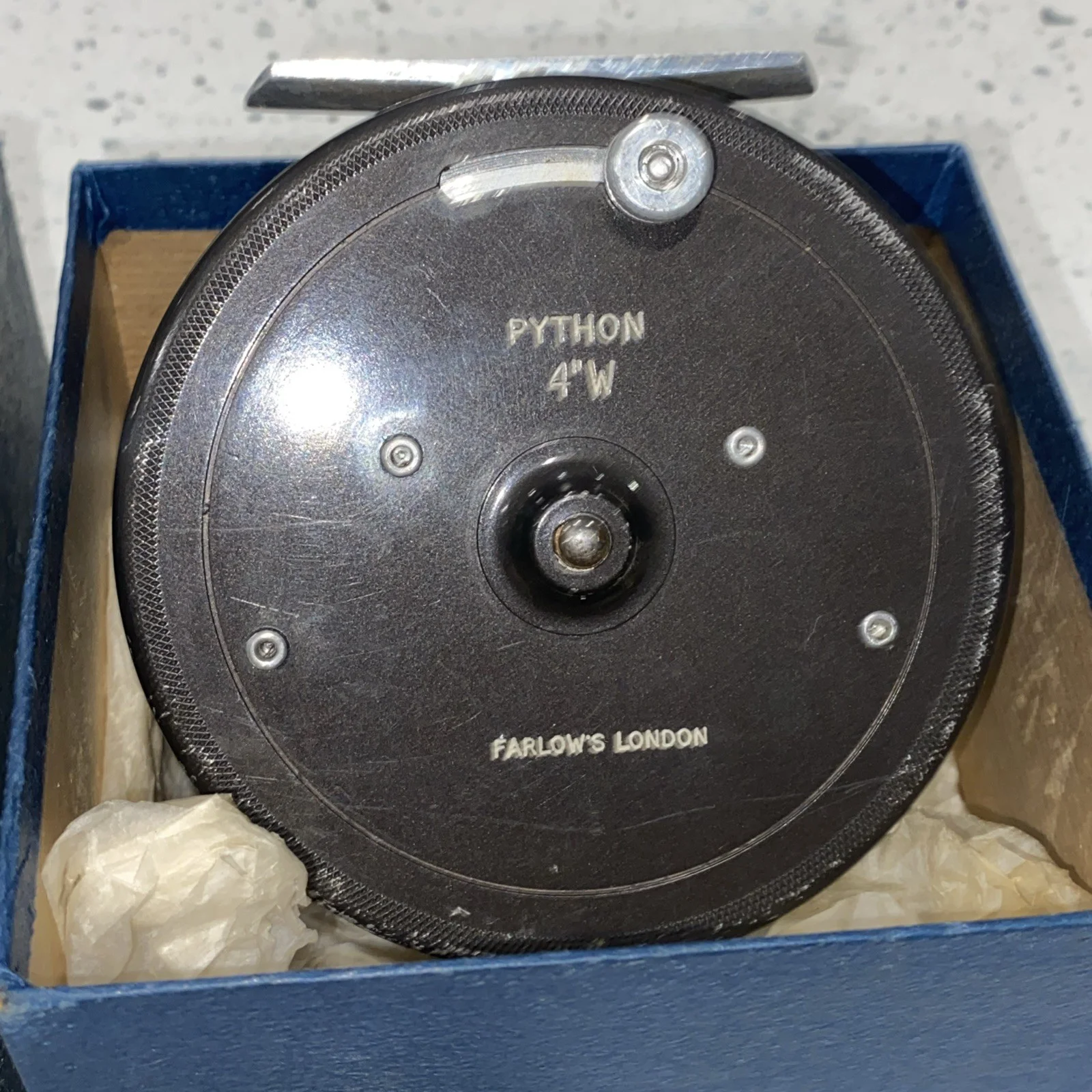 Vintage Farlow's Python 4" W Fly Fishing Reel good condition & original boxSee my other vintage fishing tackle No returns