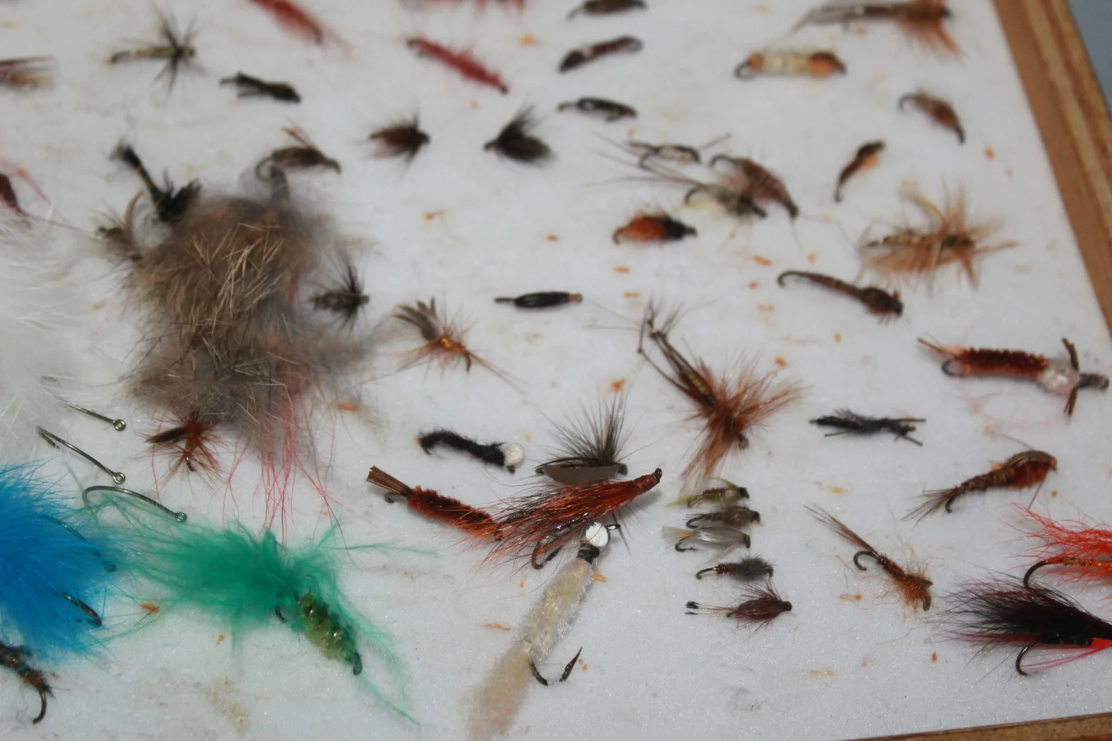 FLY FISHING WOODEN CASE WITH LARGE SELECTION OF FLIES PIKE / TROUT etc