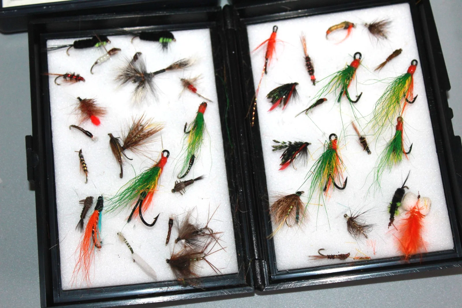 FOX BOX FLY BOX + ANOTHER FLY CASE WITH SELECTION OF TROUT / SALMON FLIES Fox Box hard plastic fly case plus un named plastic fly case with selection of fliesgood used conditionPlease look at the photos as these form part of the description. Use the zoom to look closely at the item showing the condition of the item before bidding. Item shown in photos is the item for sale.All items unless stated are antique or vintage and will therefore by definition not be in new condition and may have signs of age or use, please be assured that we always endeavour to offer the most accurate description possible of the item's condition with illustrative photographs, please use zoom to take a closer look at photographs. Fishing reels and rods may have faults / damage that we may have missed. Any major faults will be listed. Some minor surface marks or flaws etc consistent with age and use and manufacture etc may not be mentioned unless they cause a problem on the whole to the item. If you need further information on condition please email us.We do combine postage costs but please wait for a combined invoice to be sent before paying for multiple purchases. We do not allow collection in person. PLEASE READPaymentPayment accepted by Ebay paymentsPostageGoods are posted upon cleared payment. Postage Postal charges include a small charge for packing materials. We post within three working days of cleared payment, Proof of posting is always obtained, Overseas buyers please allow for a reasonable time for your package to arrive as airmail delivery times can vary from country to country.UK Postage & packaging will be combined to keep costs down wherever possible.In the event of any problems please let us know as problems can nearly always be solved. Please contact us through ebay messages.ReturnsAt auction all sales are final, although we do offer, in compliance with distance selling regulations, a 14 day returns policy for items which have been inaccurately described or purchased Buy it now or via our ebay shop. Any problems please report them within 3 days of receiving the item.If, on receipt of an item, you are not entirely satisfied, a full refund is available on safe return of the item to us (excluding postage costs). Items must be returned in original packaging and sent by recorded / trackable postWe do not offer partial refunds. No returns will be accepted without prior approval and agreement. Return postage will not be refunded unless agreed prior to the return.FeedbackPlease leave feedback upon receipt of item so that we know you have received your item and we will leave feedback in return. If there is a problem please contact us first as problems can usually be resolved.