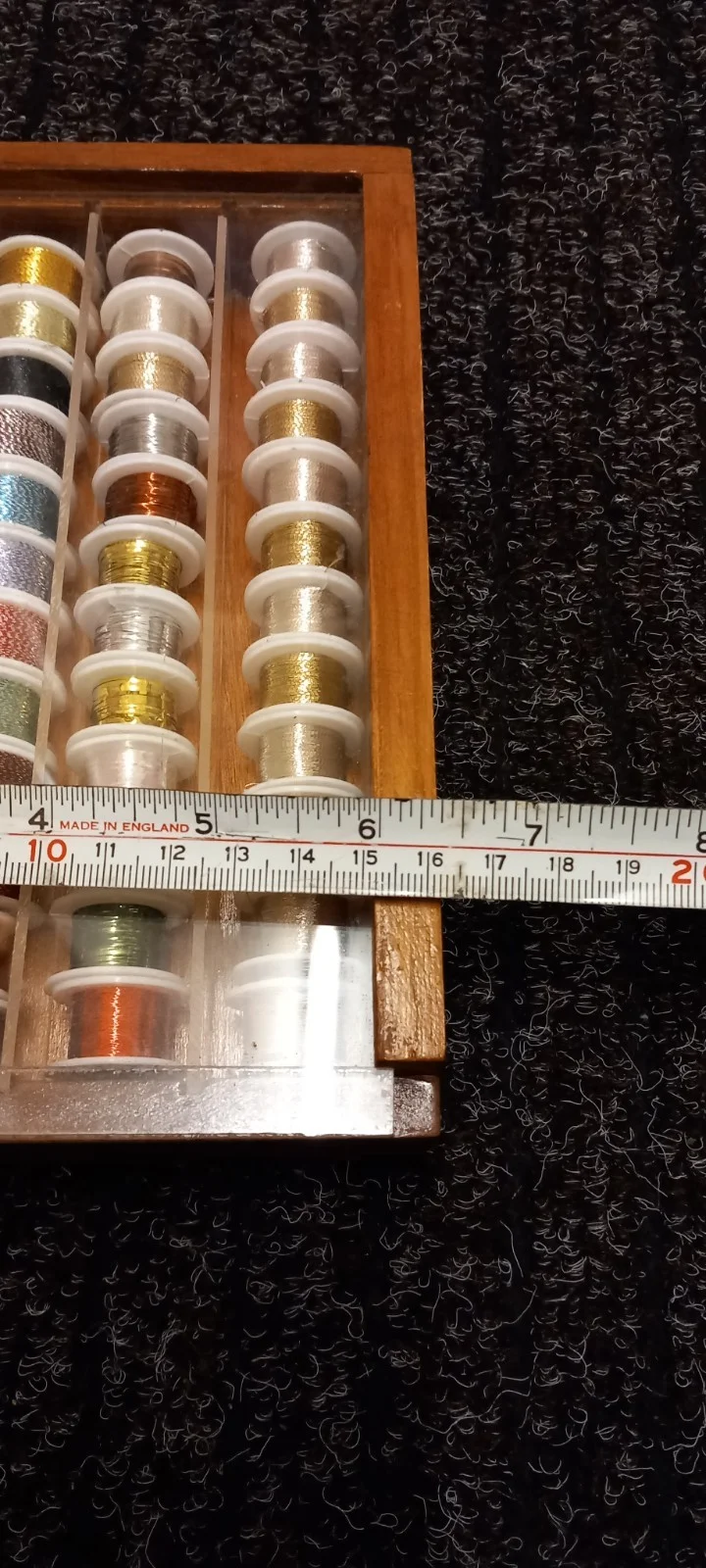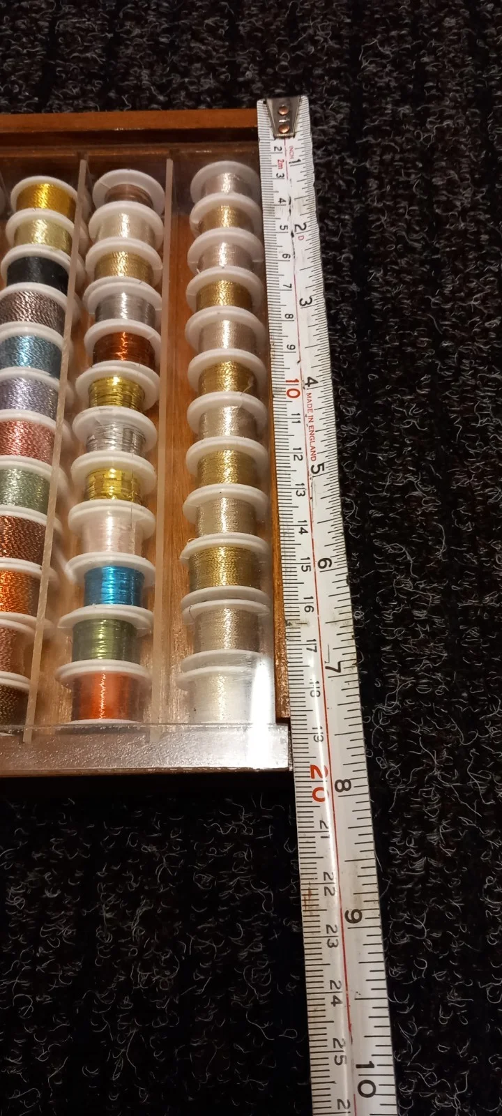60 Mixed Threads, Flosses, Tinsels Wires With Storage Box. Fly Tying Materials. A couple may have been used slightly but most look unused.