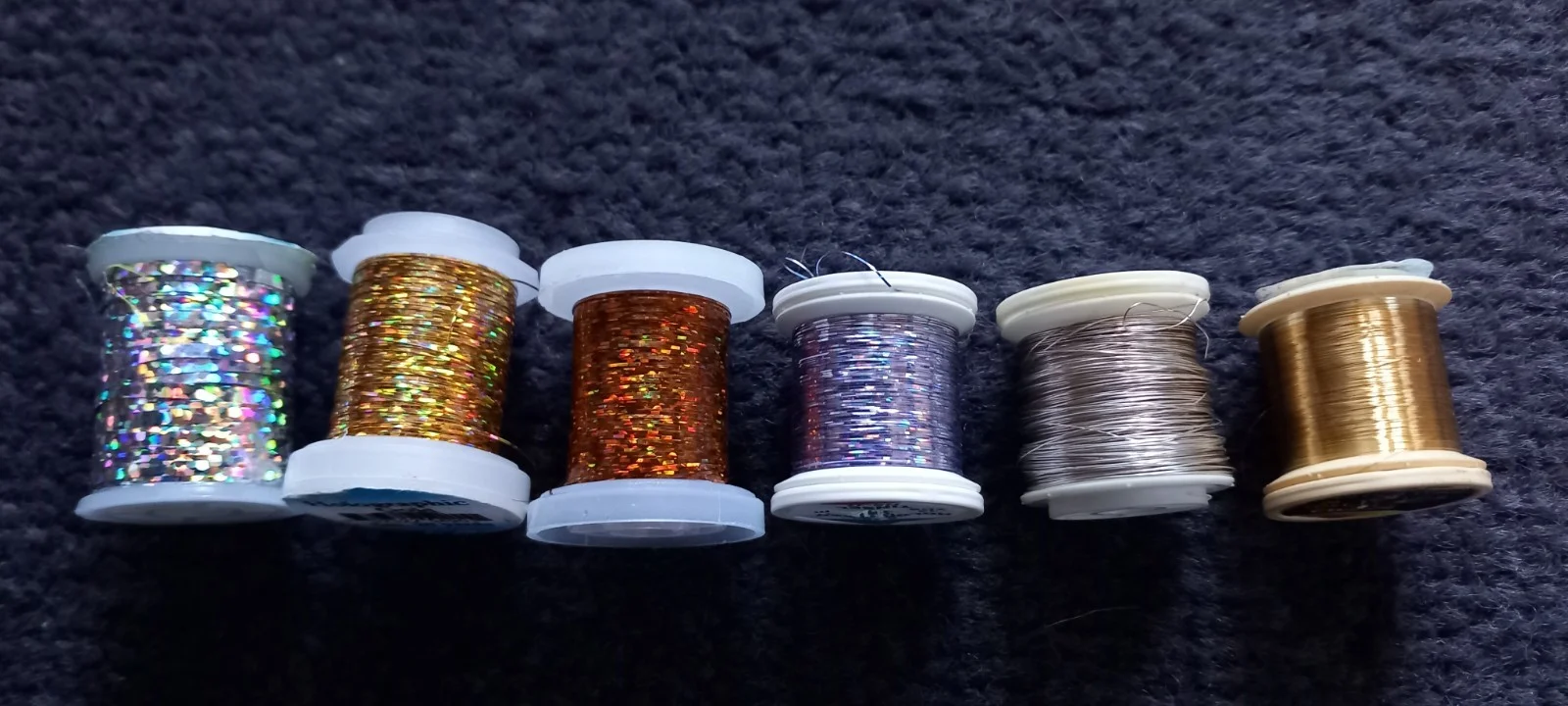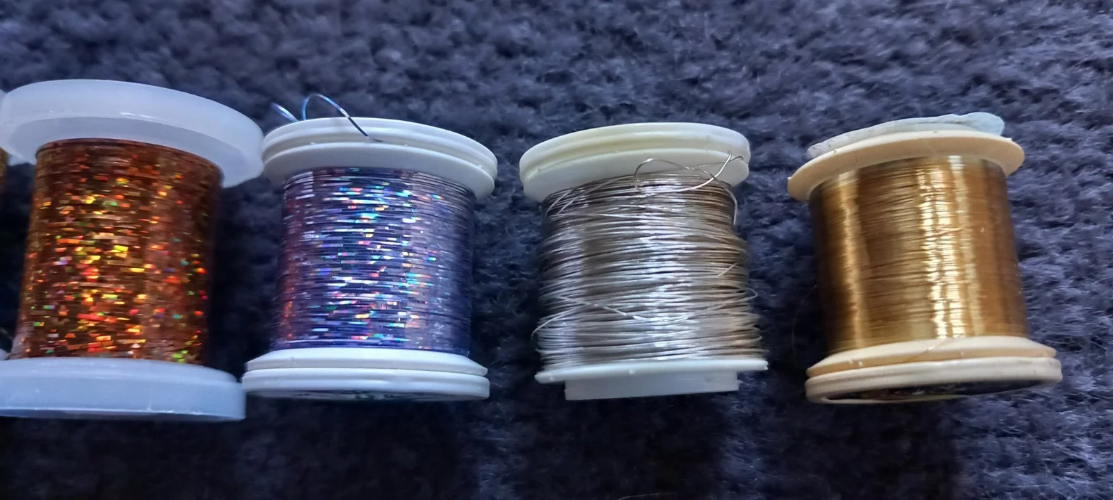 Lot 102. Fly Tying Materials. Holographic Tinsel x 4 and Wire x 2.