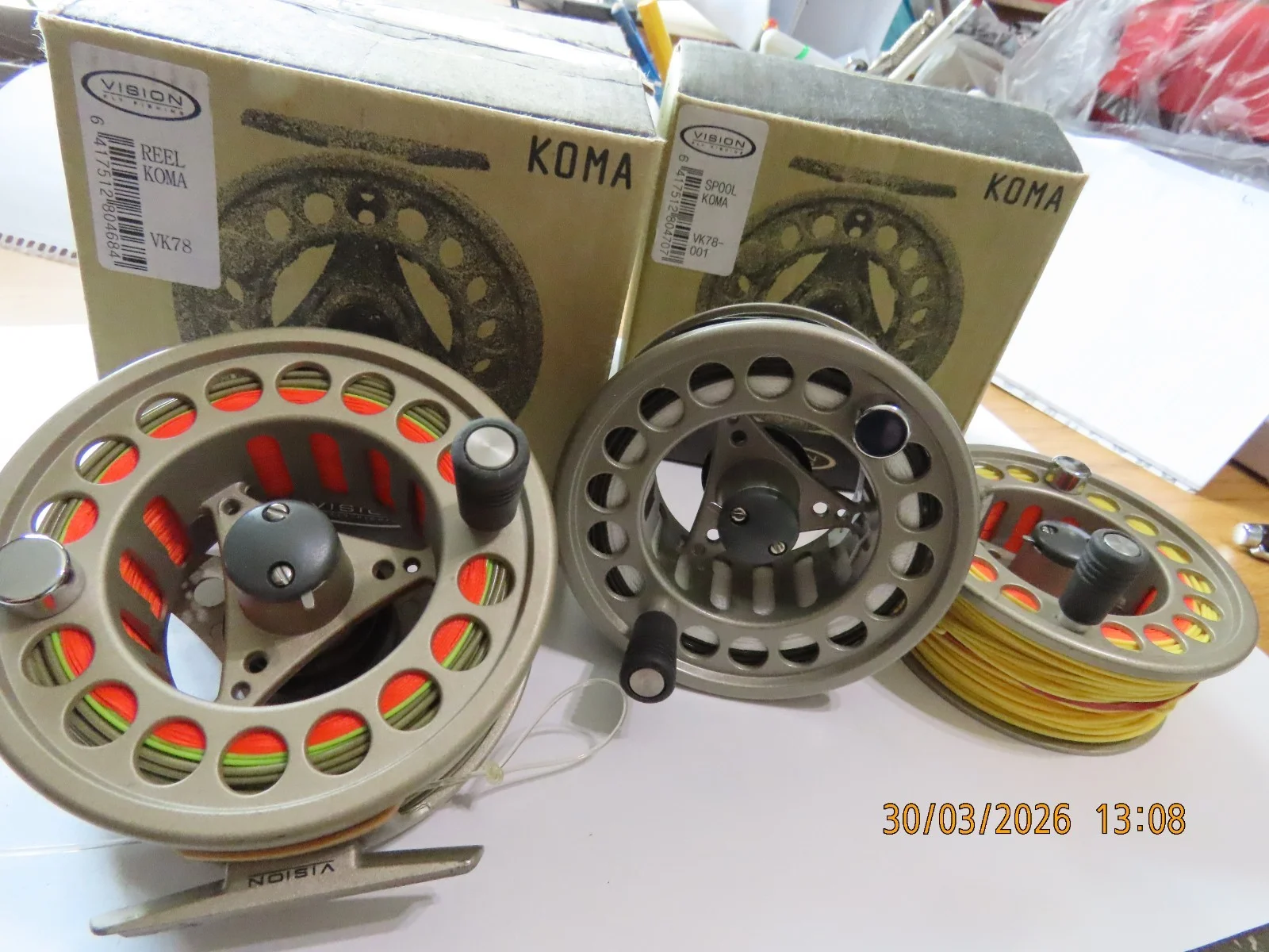 In good condition, unused since my cardiac arrest in 2012.The set consists of:_ On the reel, a Hardy long sink tip, WF7. One spool is loaded with a Shakespeare medium sink WF8. The 3rd spool has a Rio midge tip WF7.The lines and backinf are in very good condition.Currently right handed, it is easy to change to left handed winding.