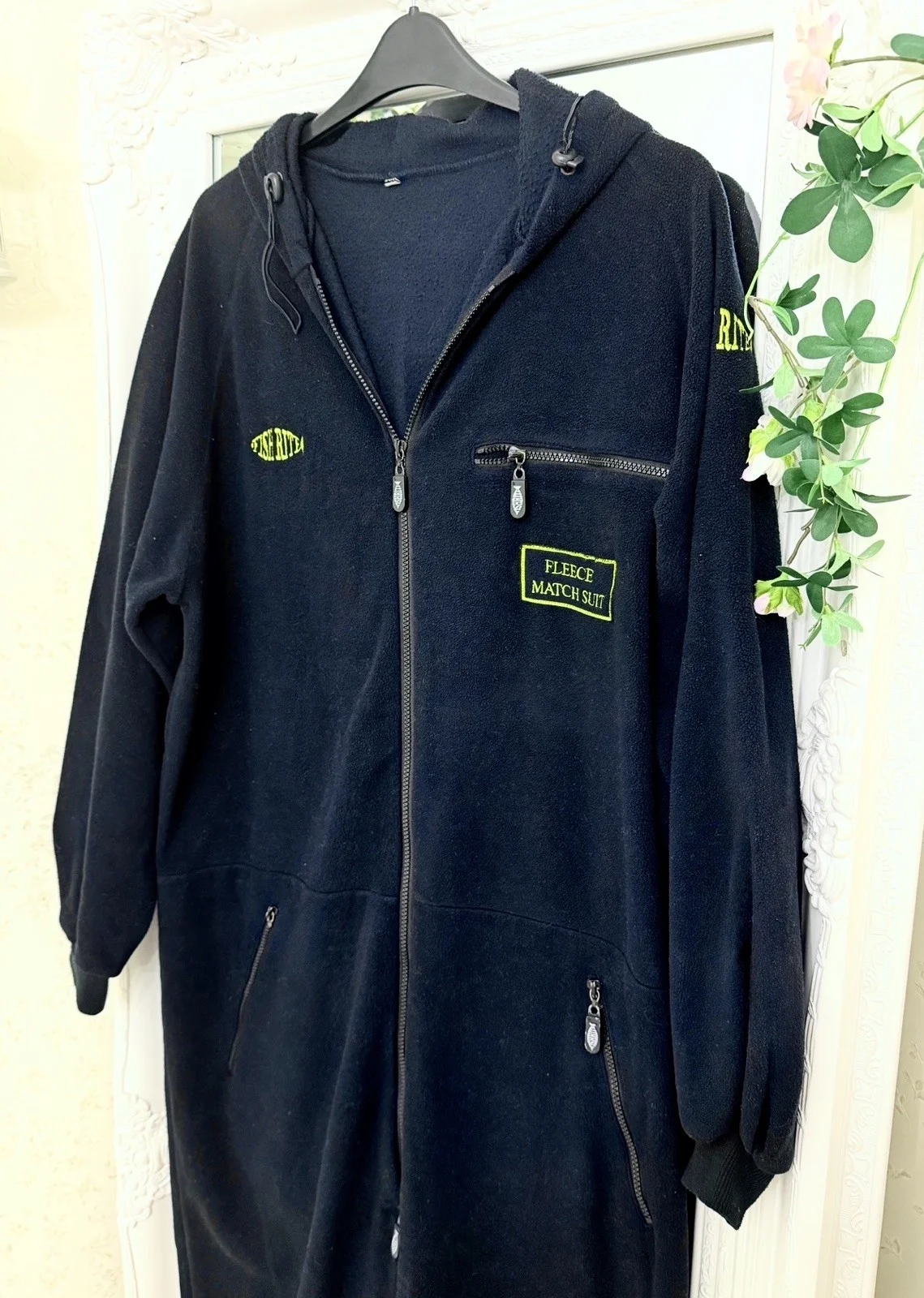 All in one thermal fleece match suit.Navy, full zip with zip up pockets and hood with drawstring.Elasticated cuffs on arms and legs.Size XL.Good condition apart from one zip pull missing on one of the pockets.From a very clean non smokers home.Any questions please ask.