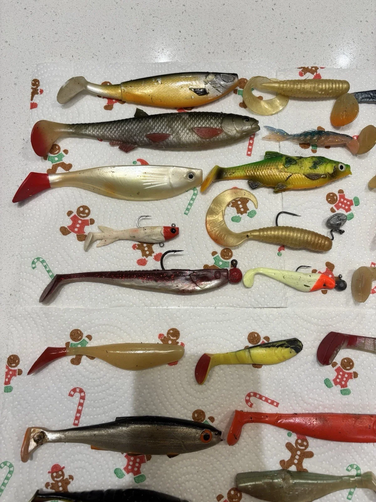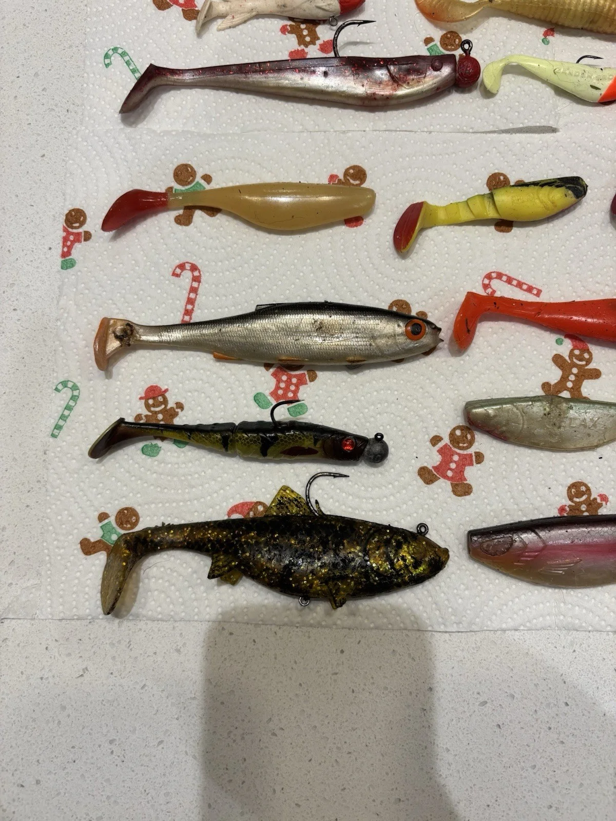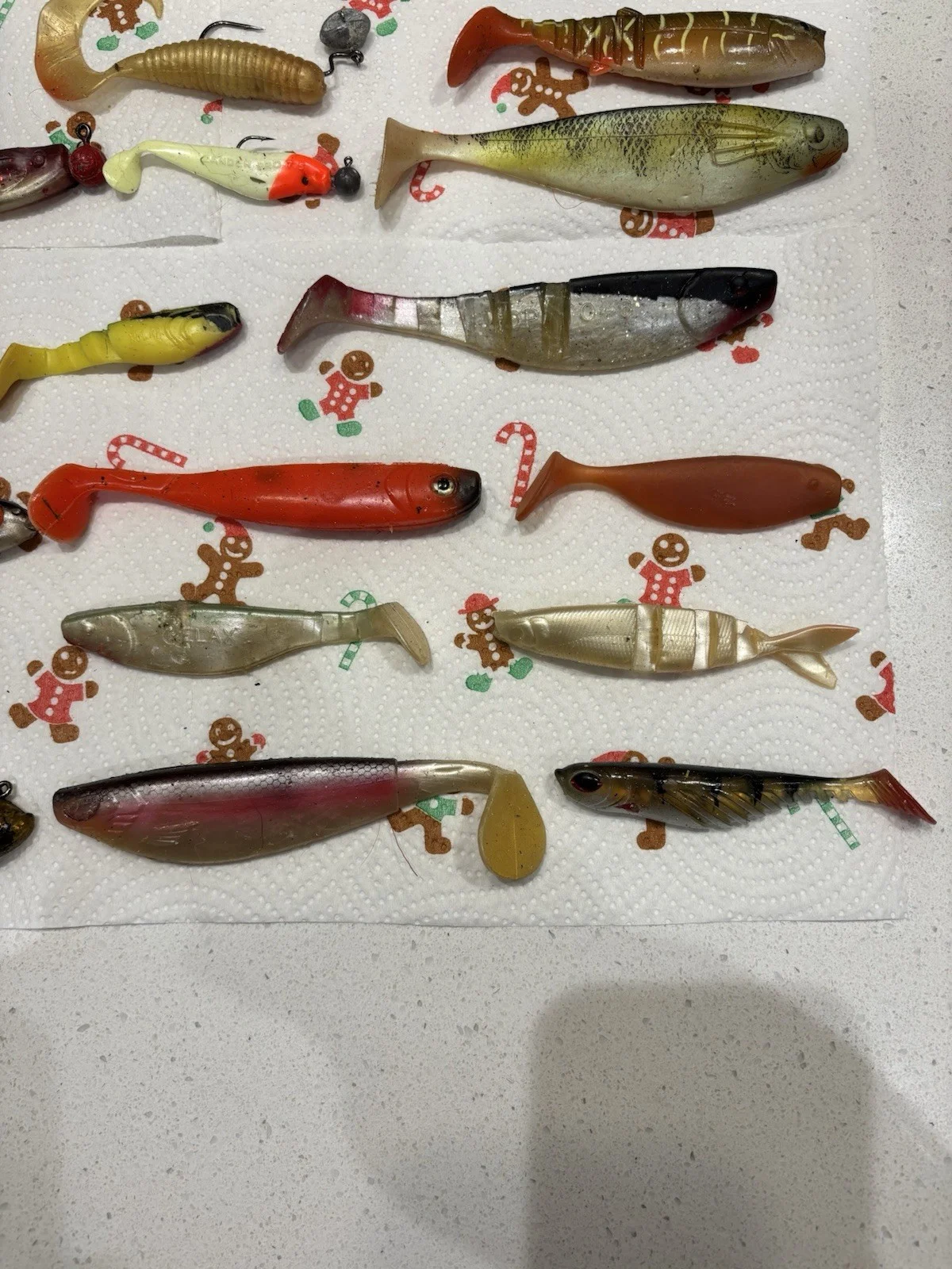 Various USED soft lures for sale (28 pieces)Some well known brands such as Savage Gear, Berkley, Westin,Fox Rage, Relax, Gunki etc etc These lures are in mixed condition. Most are heavily used with puncture marks from Jigs and hooks and pike teeth! However some are near brand new. Do not buy if you are not happy with the condition.Selling cheap to someone who can hopefully get some more life out of them.