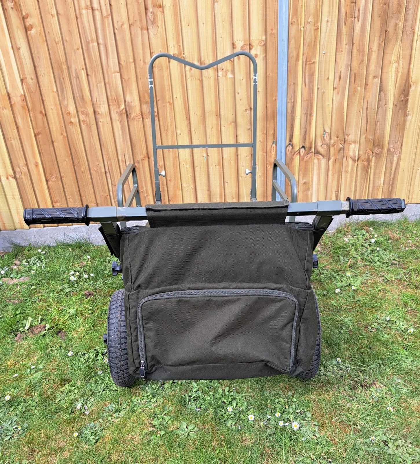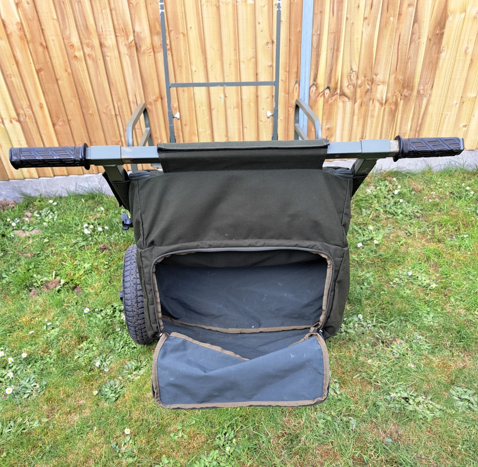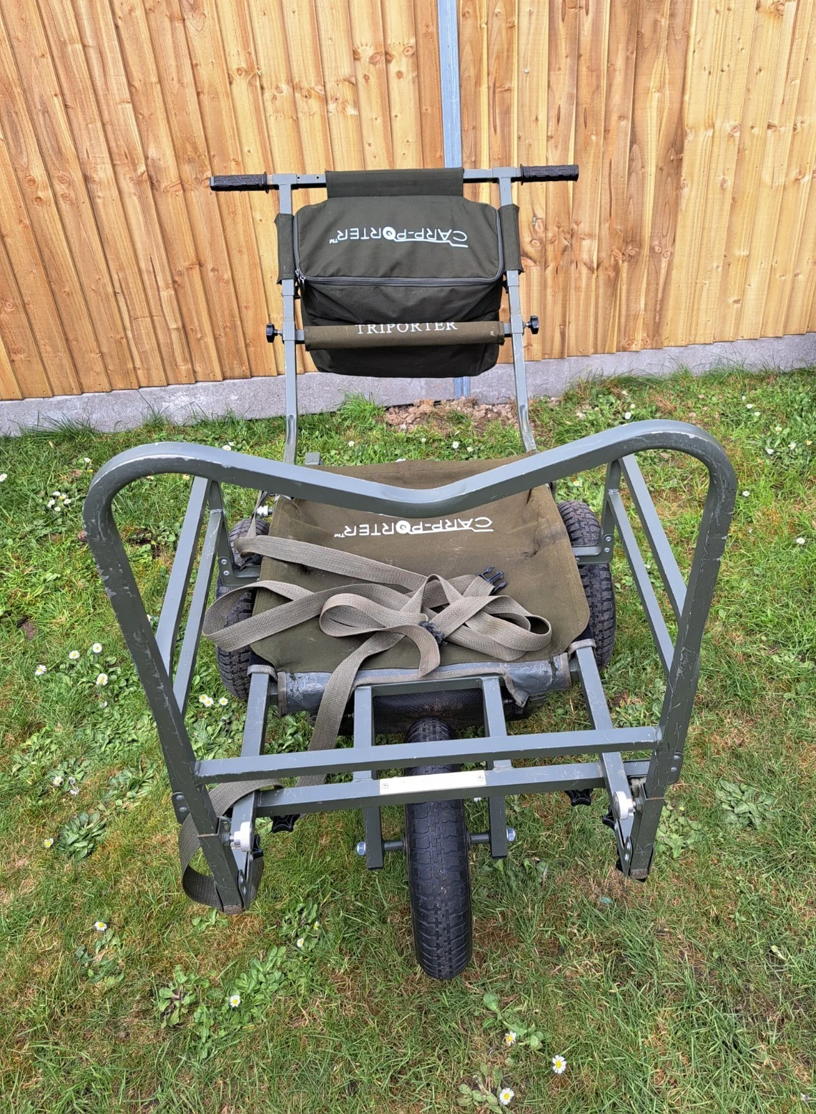 here we have an original carpporter triporter in good used condition , it does have marks and scratches from use as expected and some discolouration. It comes with under barrow bag and handles bar bag that has a built in barrow cover and a compartment at the back all zips are in perfect order ( this bag is a later addition ) . I put on new tyres and inner tubes last year plus one new rear axle , two heavy duty long webbing straps included . one handle grip is damaged but I added two handle bars from another carpporter so the grip can be replaced ( I didn't get round to it ) also included is the original double handle and brake which I removed as I didn't use them . also one clip on the barrow bag is broken see photothis doesn't effect the bag and can be replaced .I have owned this barrow from new .also included is a large heavy duty wheel bag ( not carpporter ).uk only , collection only ,cash on collection.