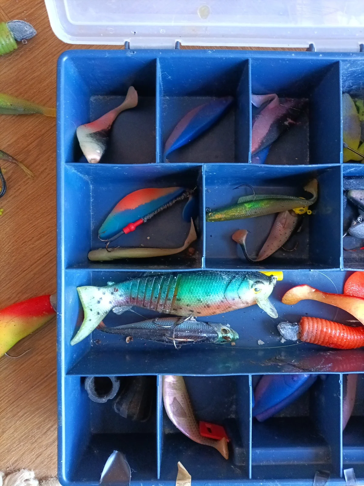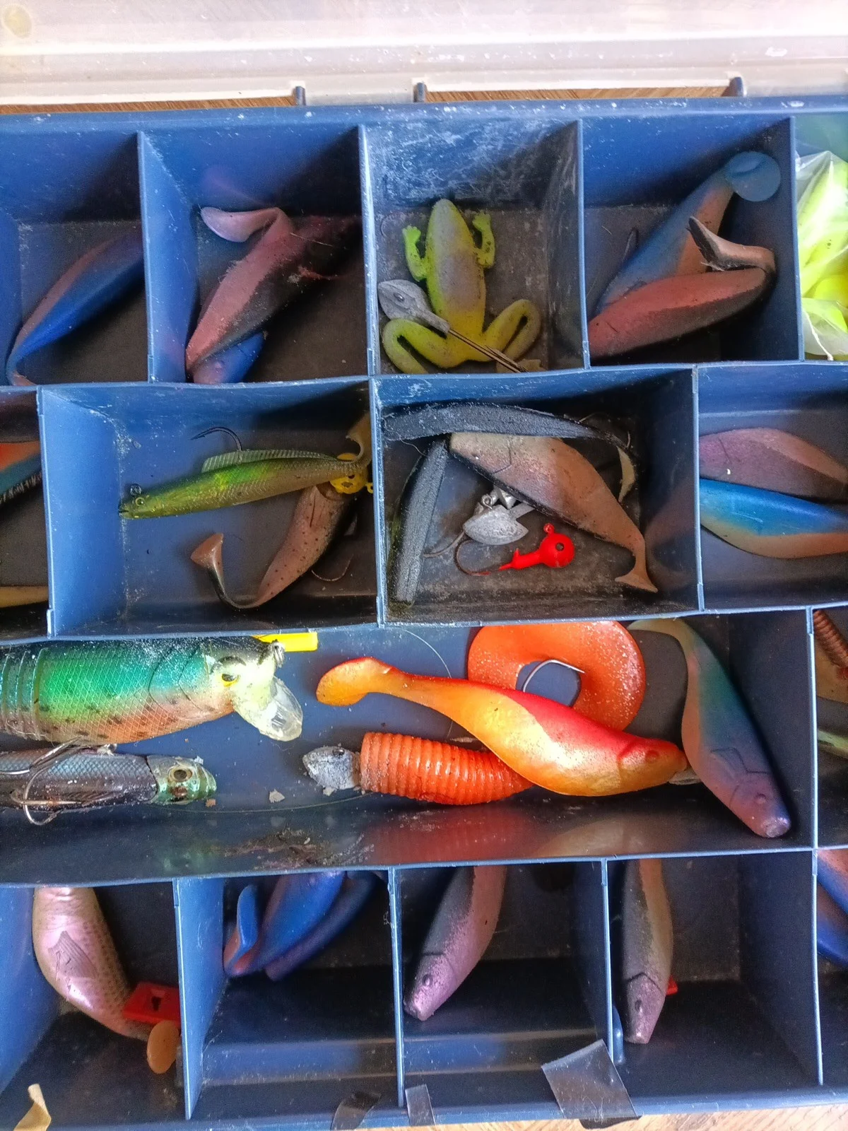 Large Job Lot Of Fishing Lures Jogging Spinning In Plastic Organiser As Photos