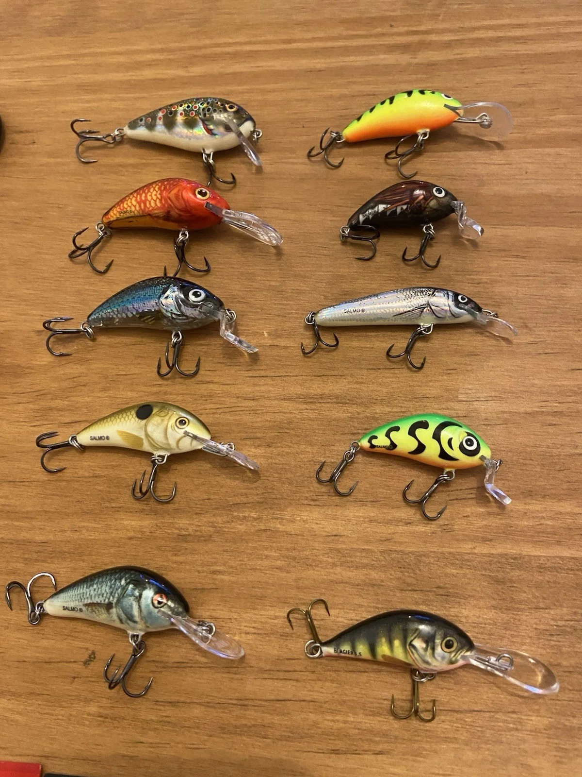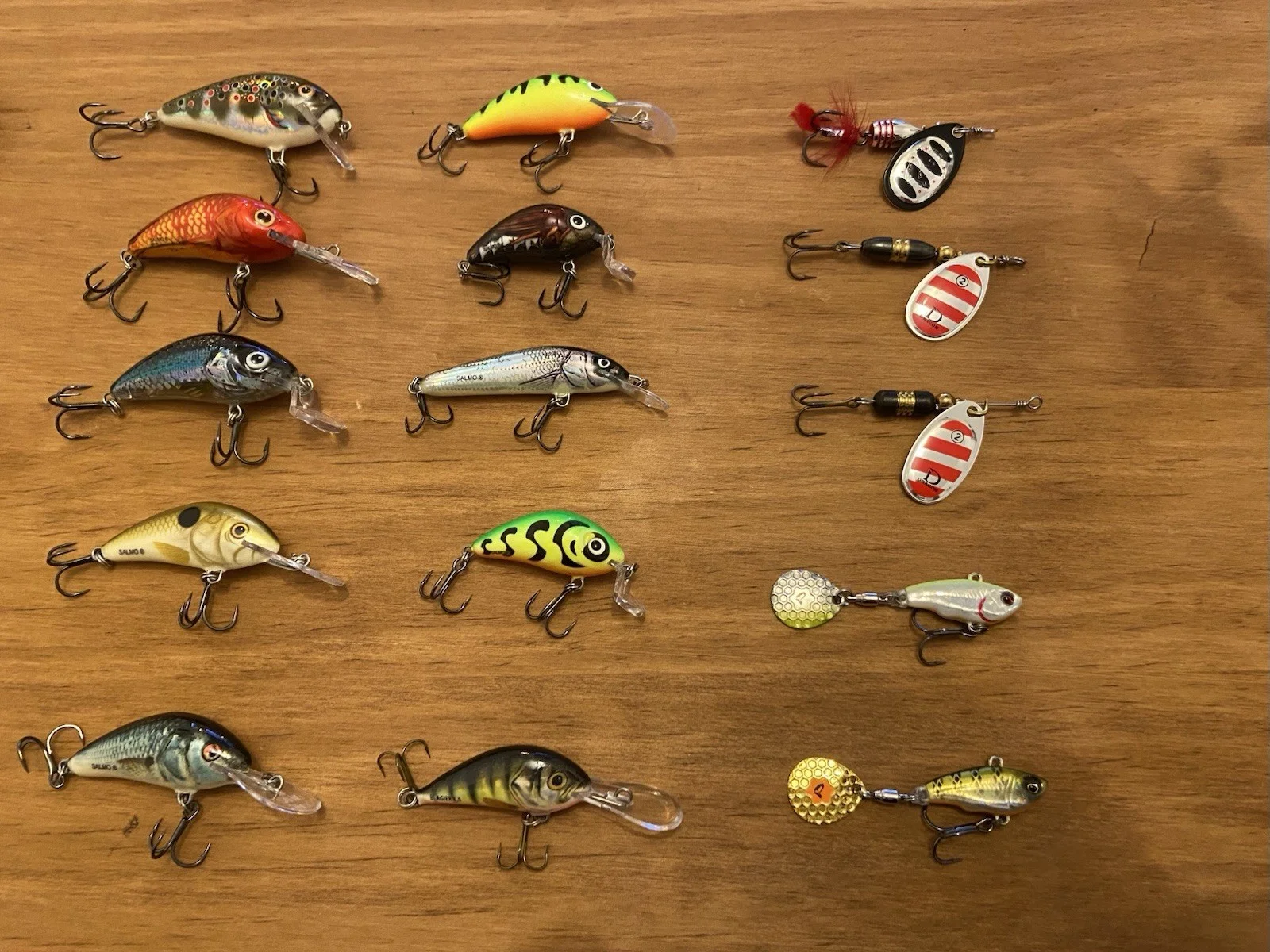 Set of Salmo and Savage gear lures and other baits. Set also includes:-unhooking tools Daiwa and Rapala, -scissors, -Measure tape, -lure box SG size A2, -6 steel leaders gurza and dragon up to 7 kg 25 cm in 3 packages (only one used) . Lures specifications Salmo butcher 5 cm sinking 8gSalmo Rattlin Hornet 4,5 cmSalmo rattlin Hornet shallow 4,5 cm 6g2 x salmo hornet 4 cm sinkingSalmo hornet 4 cm floating Salmo minnow 5 cm floating 2x salmo rattlin hornet 3,5 cm shallowDorado blagier 3,5 cm sinkingDragon AG spinner 5 gDragon Comet 4g Savage gear rotex 5,5 g2x savage gear spin tail 9 gAll 15 lures are in good or excellent condition, some of them have visible signs of use, some of them never been used before only unpacked. Other details on photos.