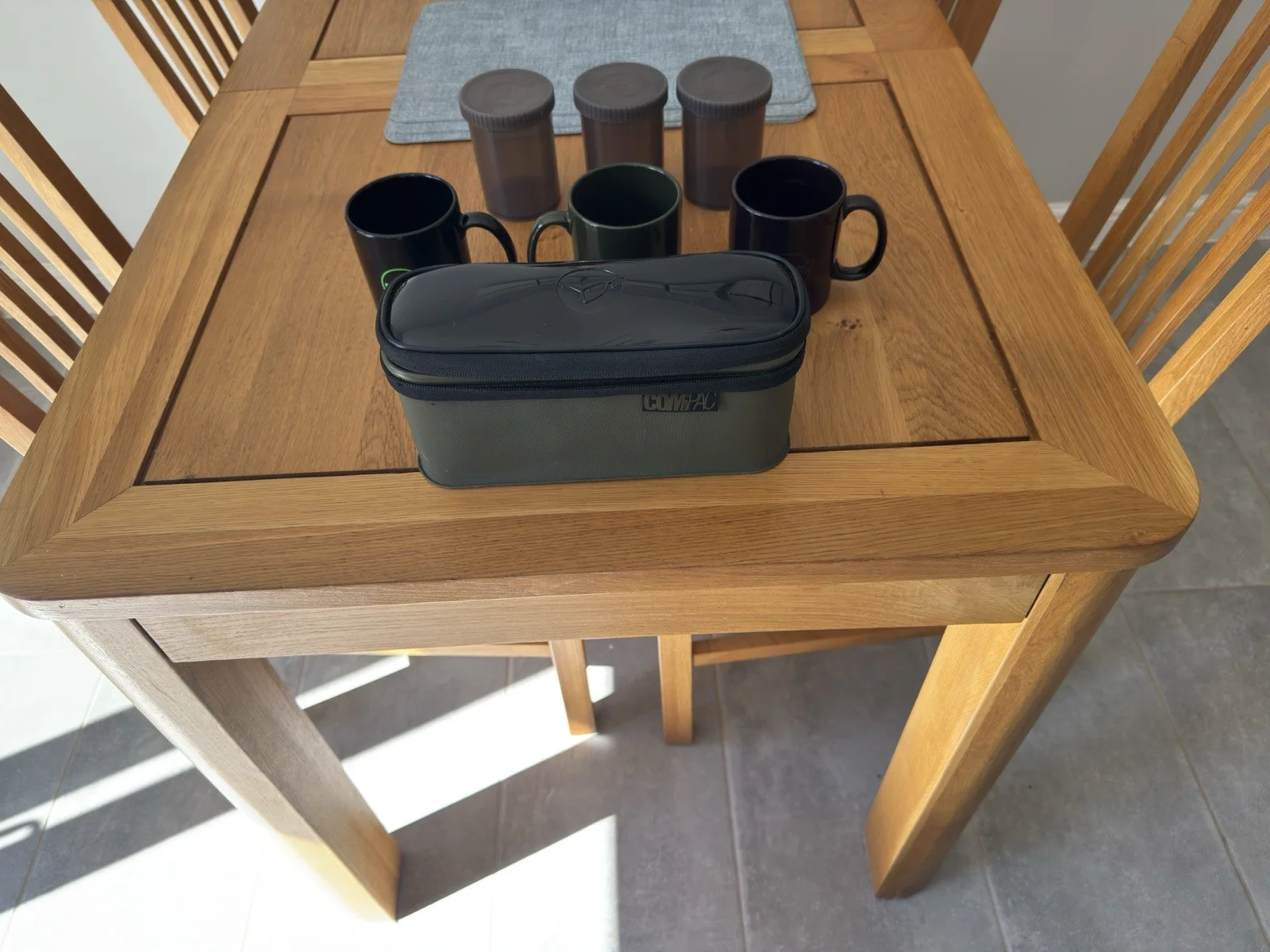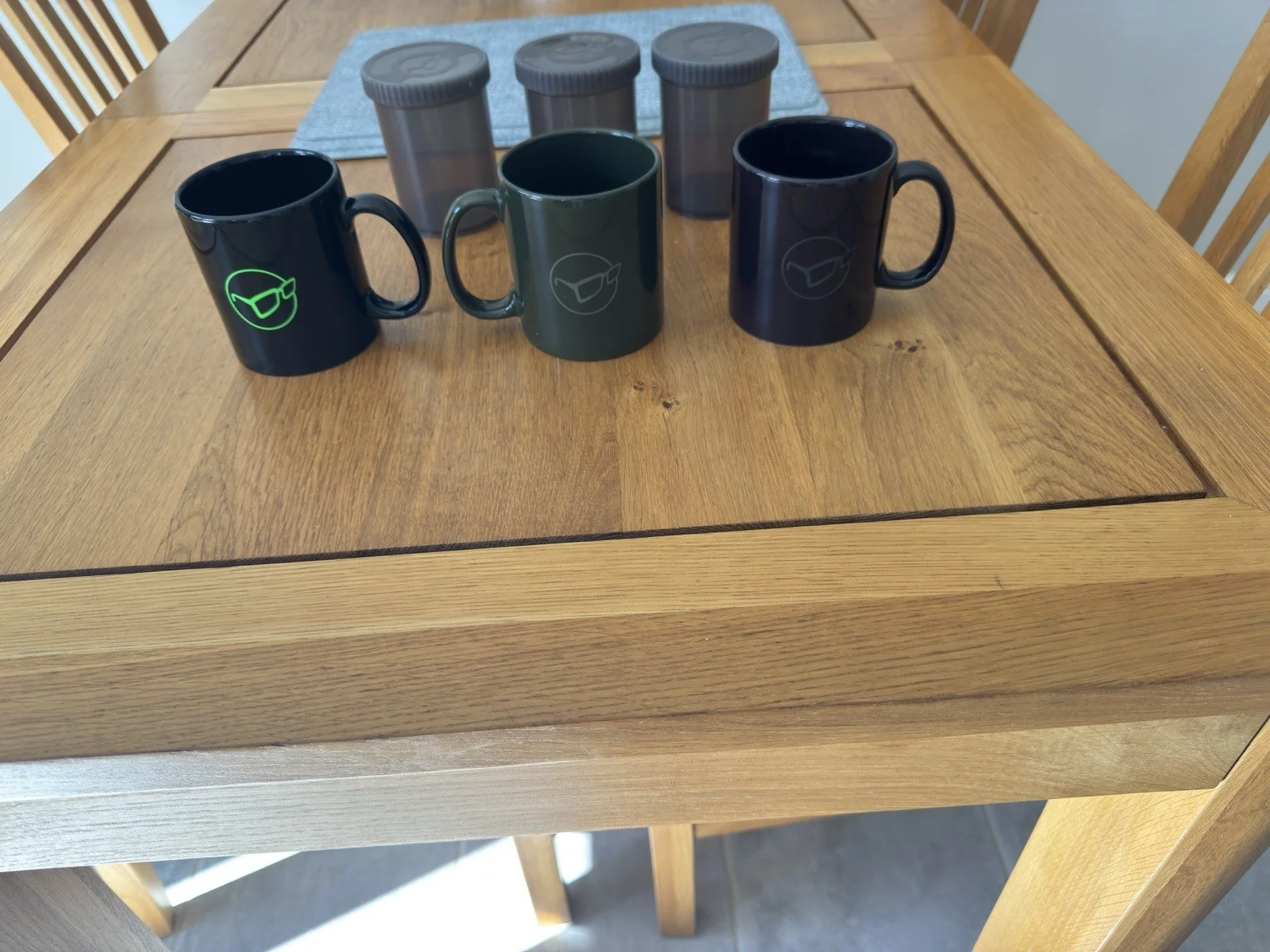 Korda Compaq 3 cup brew kit comes with 3 containers for coffee sugar and teabags,also spoon with Korda logo.In very good used condition cups have no chips and are as new.