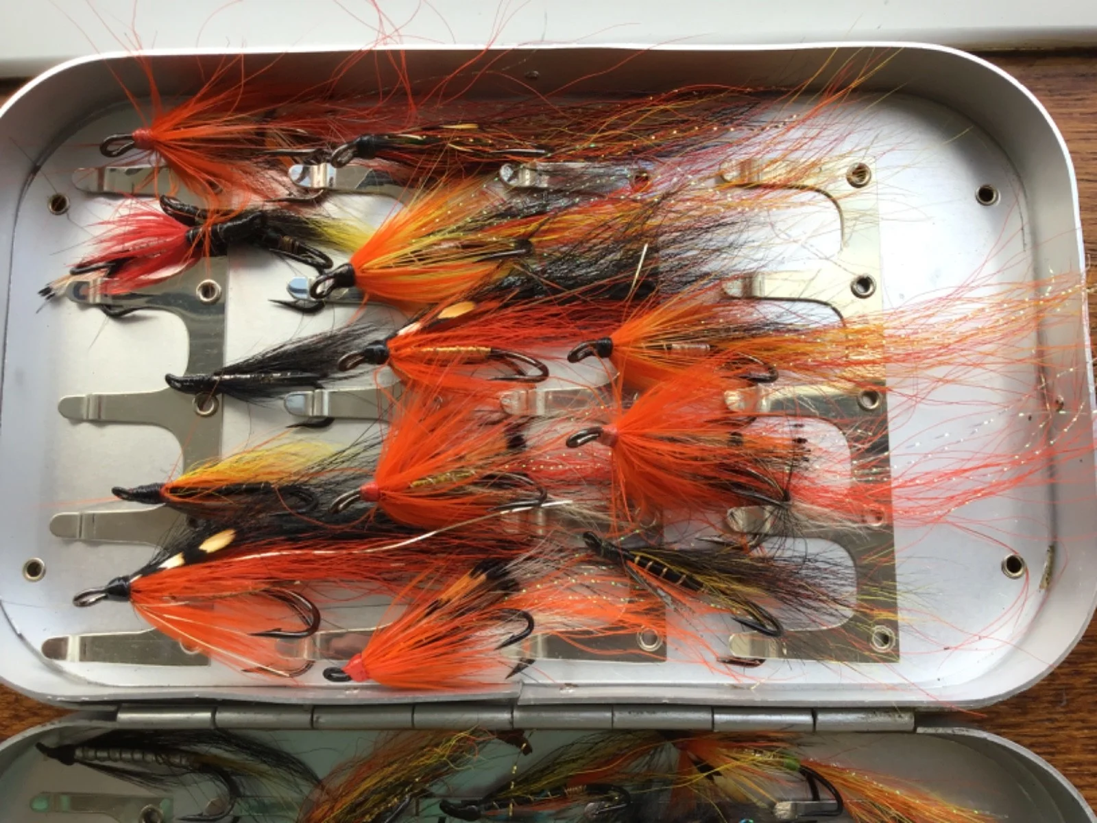 Richard Wheatley fly box with clips. Comes with around 40 salmon/sea trout doubles I various sizes.Used but in good condition.Any questions, please ask Regards Kev