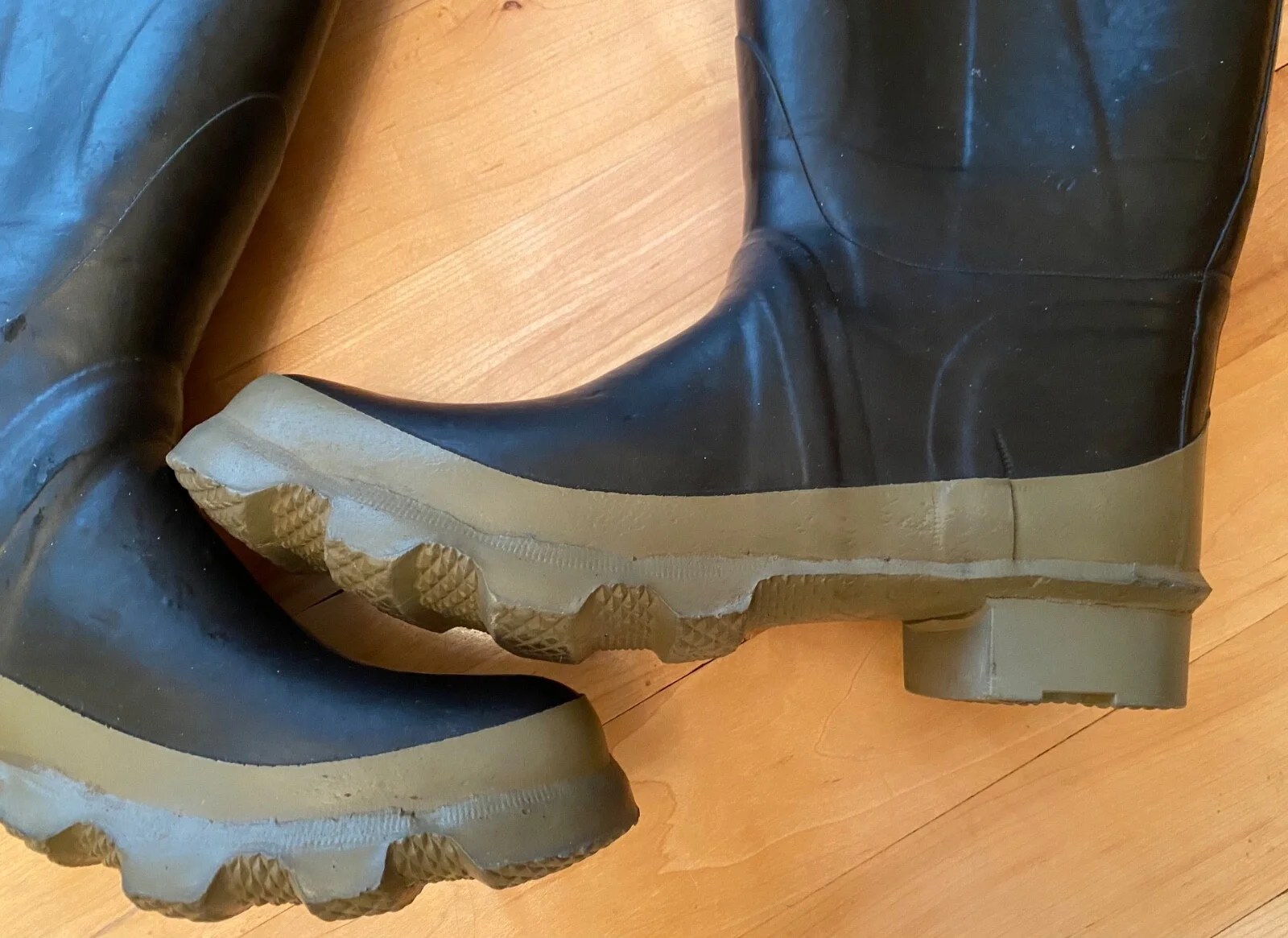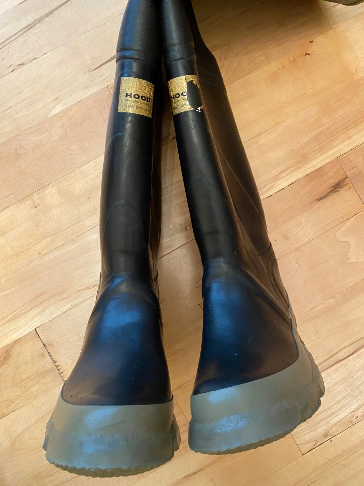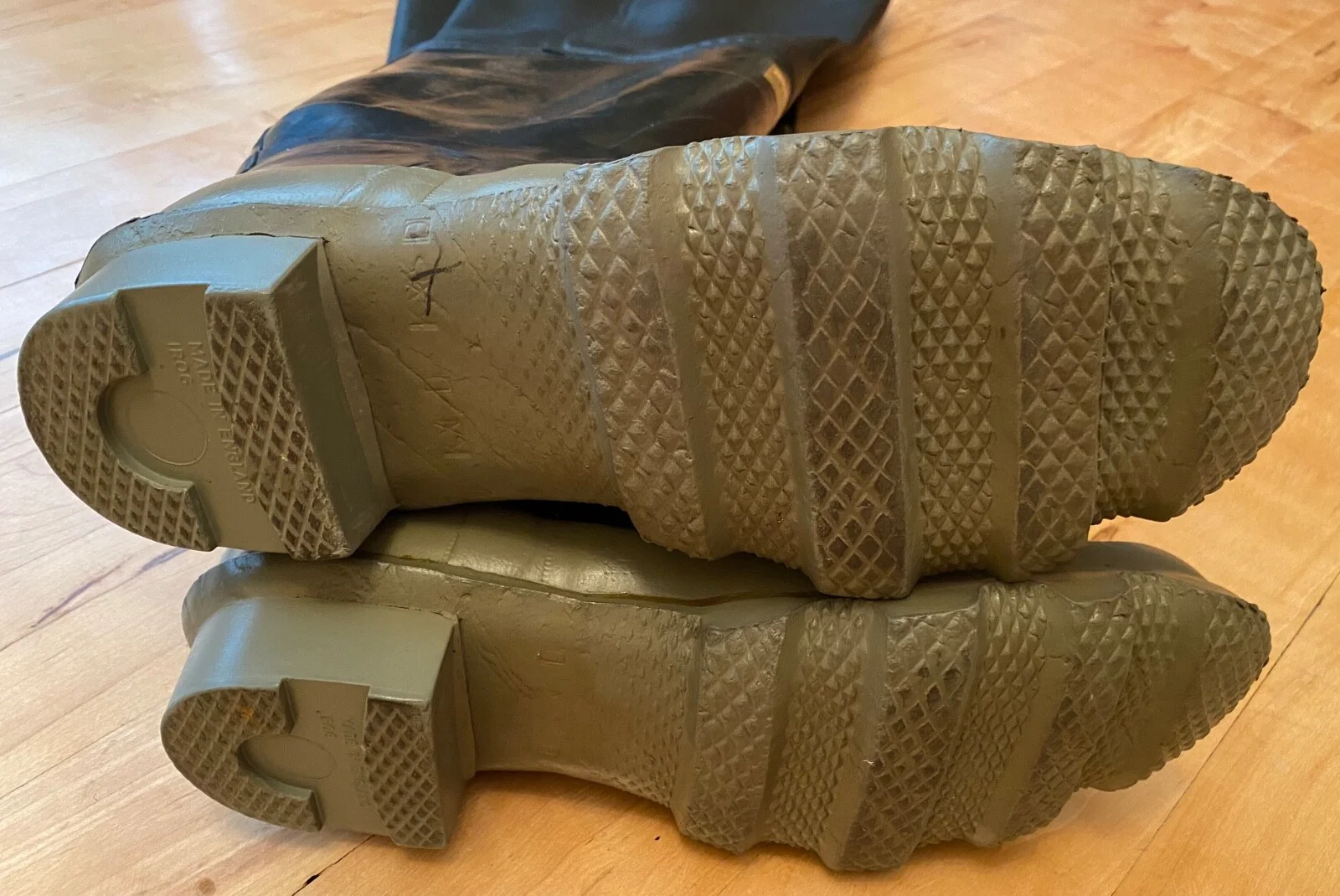 Here we have a very rare pair of Hood Bullseye Silvertown black/grey waders. Originals and not modern copy. With name tag.Very good, clean condition, with no splits, tears or perishing. These are like new.Nice heavy duty, but subtle shafts with heavy cleated studded soles. Ubiquitos grey soles, trim and heel cap.Size 7UK, 40/41Eu. 8mUSA. These run big and would certainly fit a size up and even up to an 9. These measure 10 1/2 inches -270mm toe to heal inside. These polish up well and look great with your black rubber gear to stand out playing at MRM, Alert, LaBoratory, Rubbrd etc., or in your playroom.Ideal for showing your preference into when you're up in the sling.Sold as is but can be customised.Listed on the global shipping programme, but insurance will also be added at 5% of sale price and need to be paid separately.