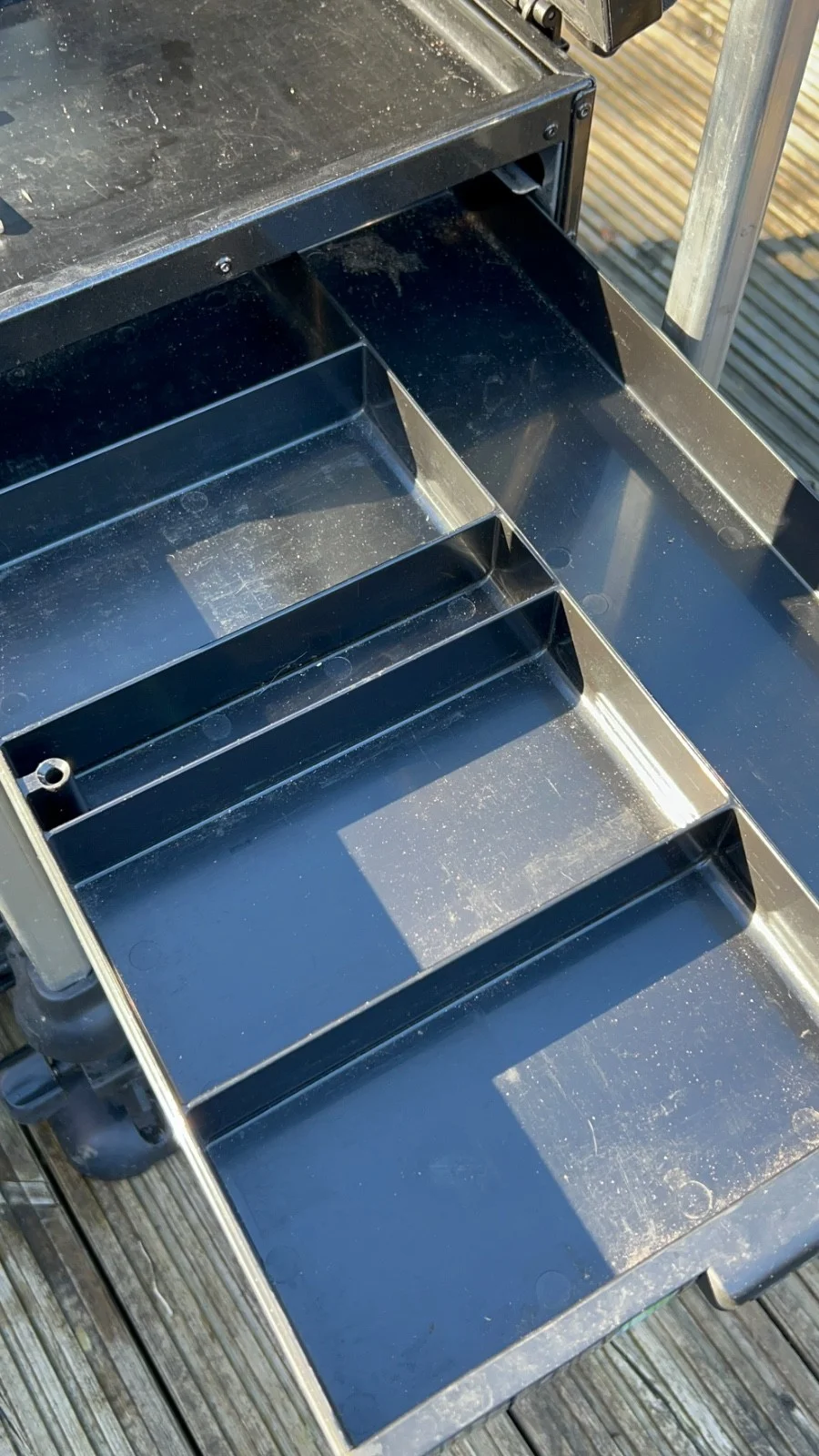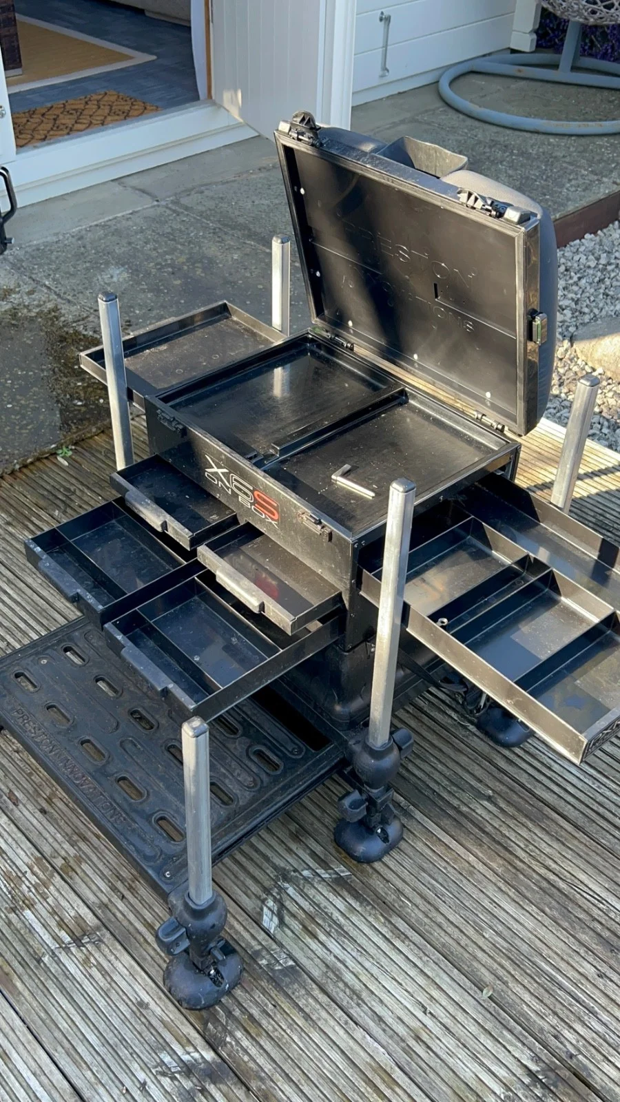 Preston seat box with middle and rear extra long extendable legs which were purchased separately. Padded strap.22mm legs.Trolley included