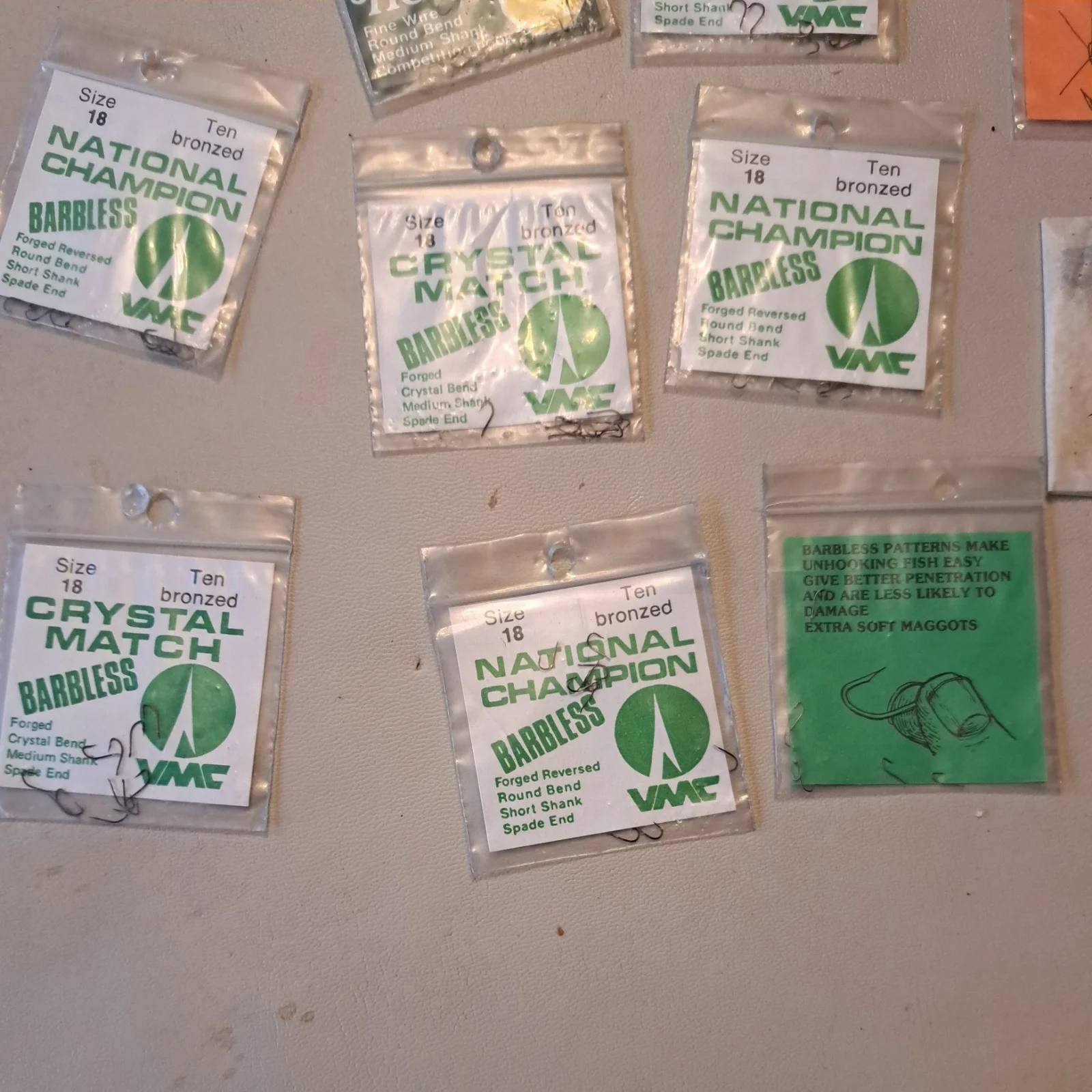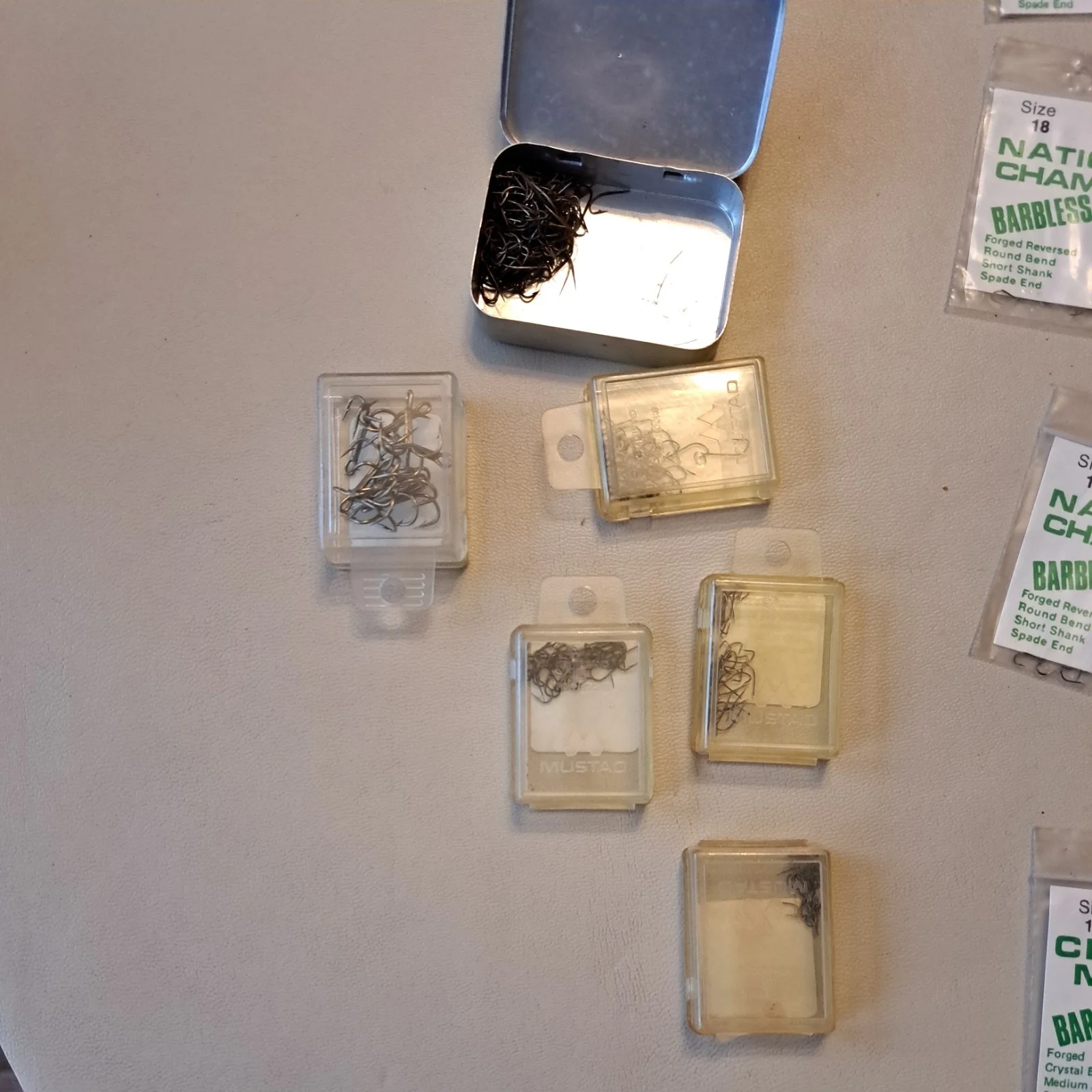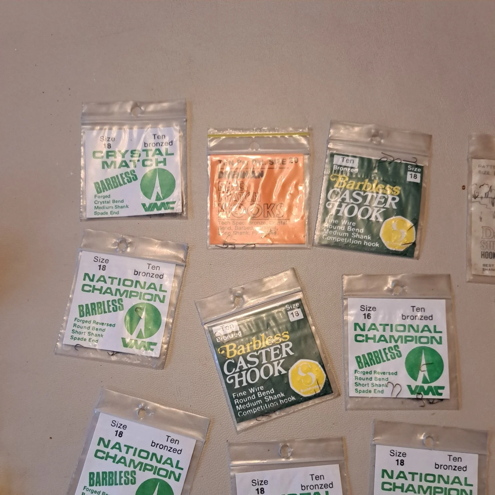Hundreds of packaged fishing hooks in a variety of styles and sizes