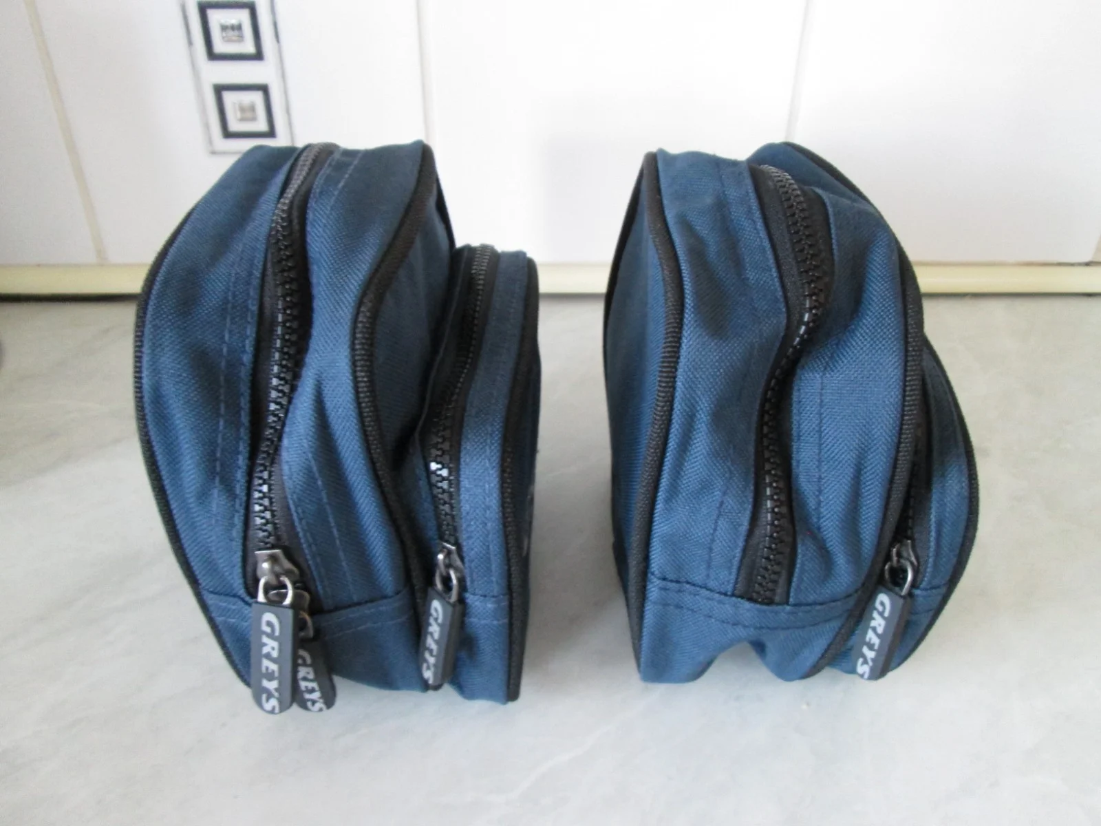 HI, HERE I HAVE FOR AUCTION IS 2 BLUE GREYS REEL CASES WITH 2 COMPARTMENTS IN GREAT CONDITION, THE CASES CAN BE USED FOR FLY, MULTIPLIER OR A SMALL COURSE FISHING REEL. ALL ZIPS ARE ALL GOOD AND WORK HOW THEY SHOULD,THANKS FOR LOOKING PLEASE TAKE A LOOK AT MY OTHER GREAT ITEMS THAT I HAVE FOR SALE.GOOD LUCK WITH YOUR BIDDING.