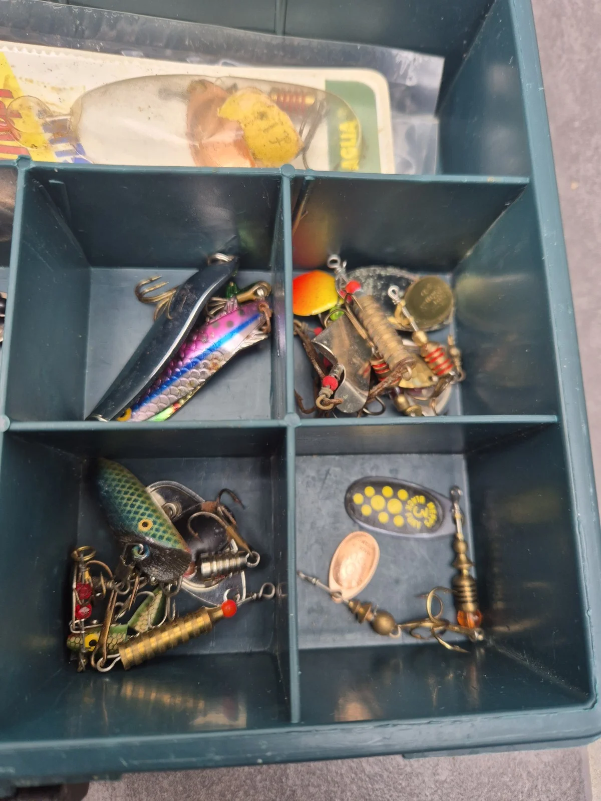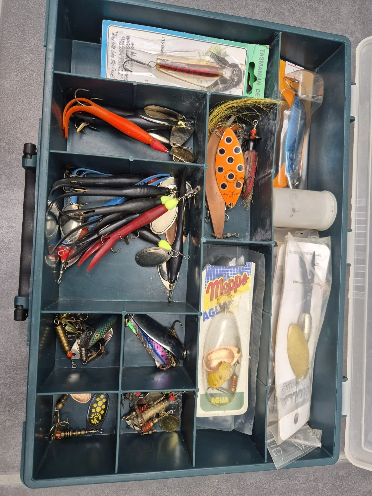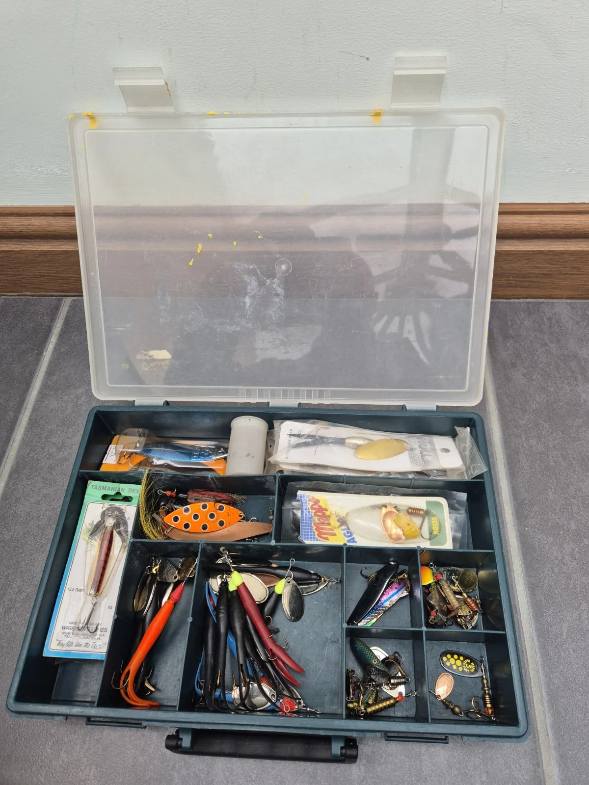 Tackle Box Loaded With 45 Fishing Lures, Mainly Spinners & Flying C Lures.