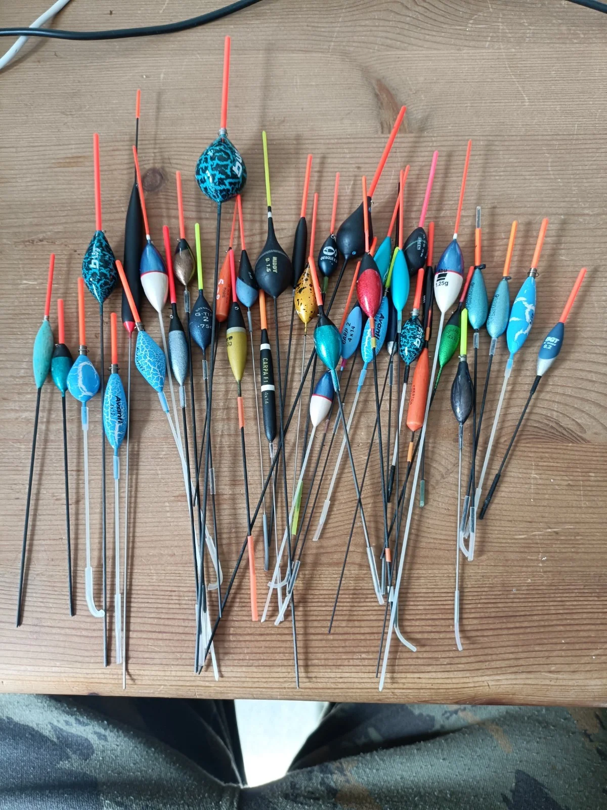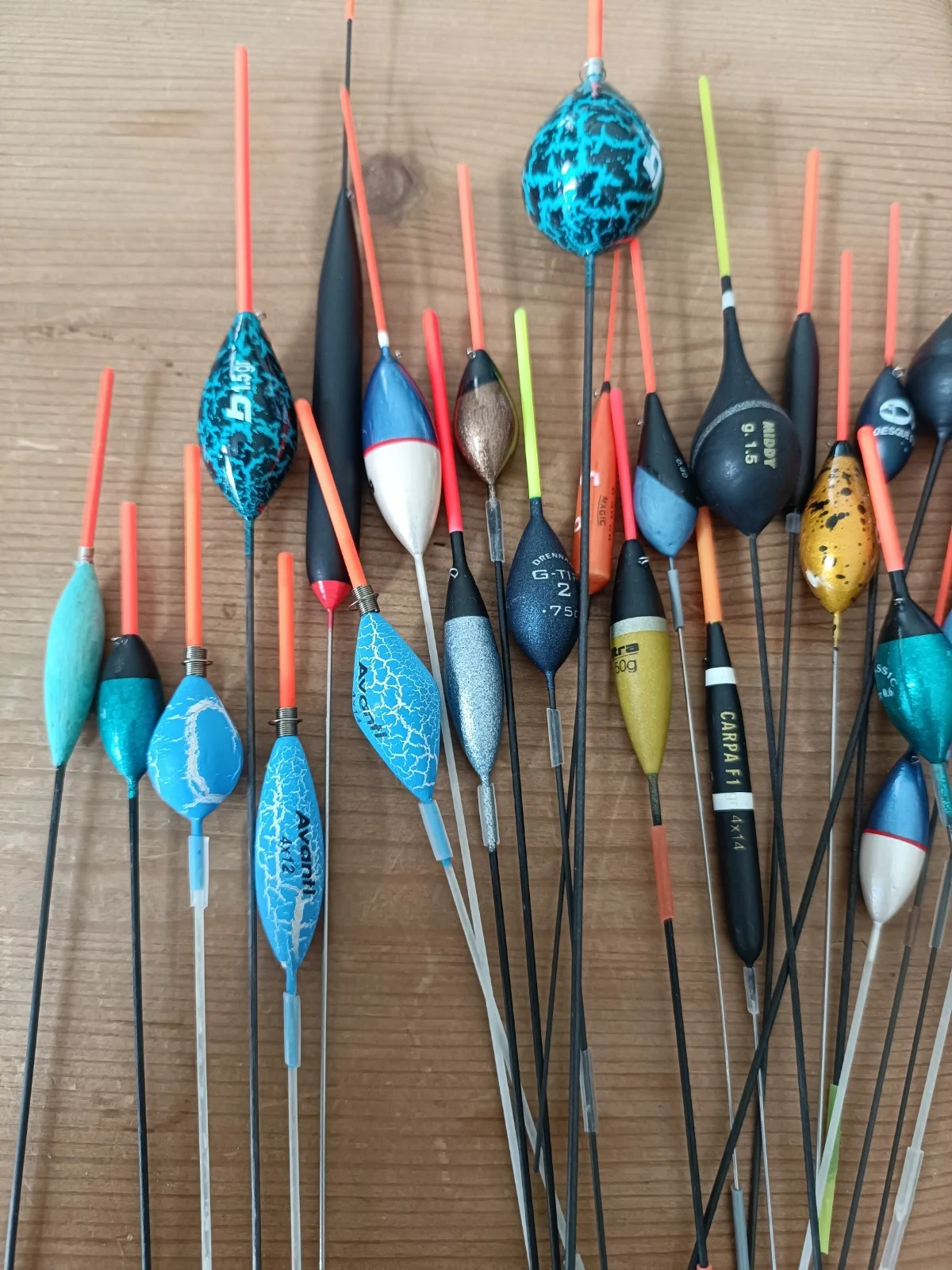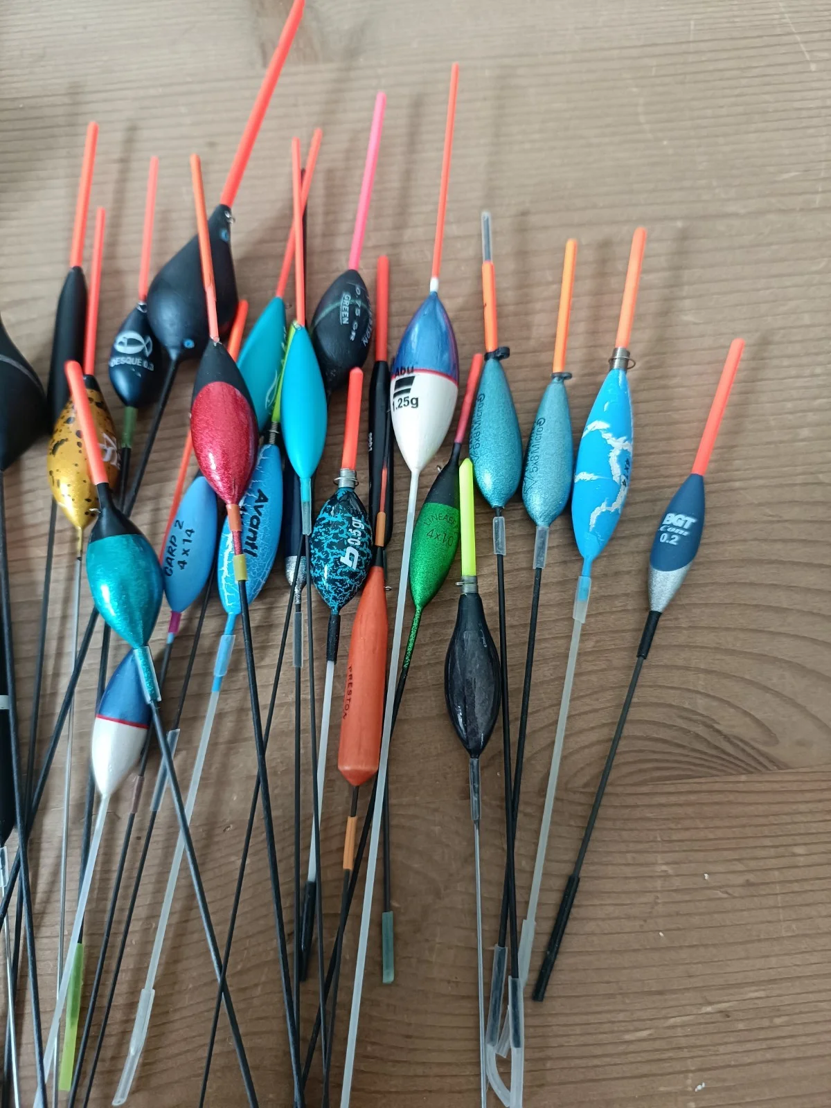 a collect of 40 used but still in useable condition pole floats in various sizes. variety of manufacturers. some with silicone sleeves some without. UK delivery only please.