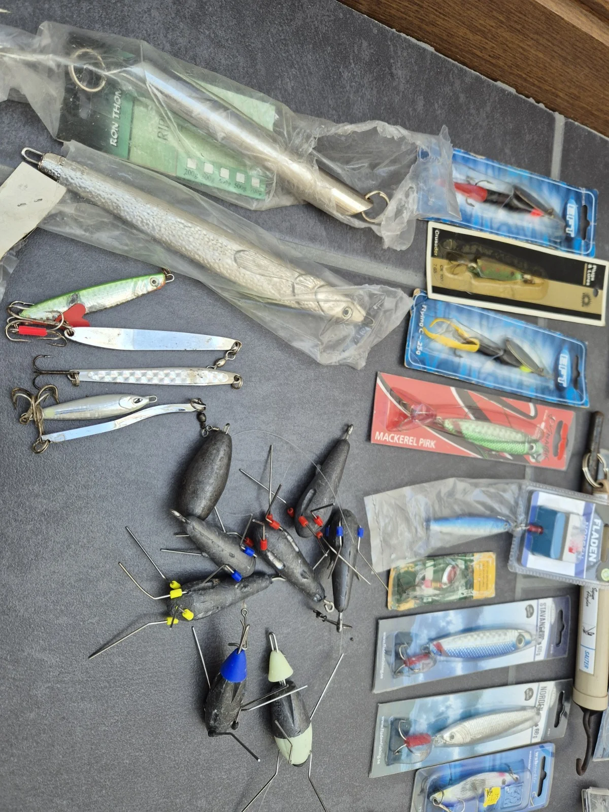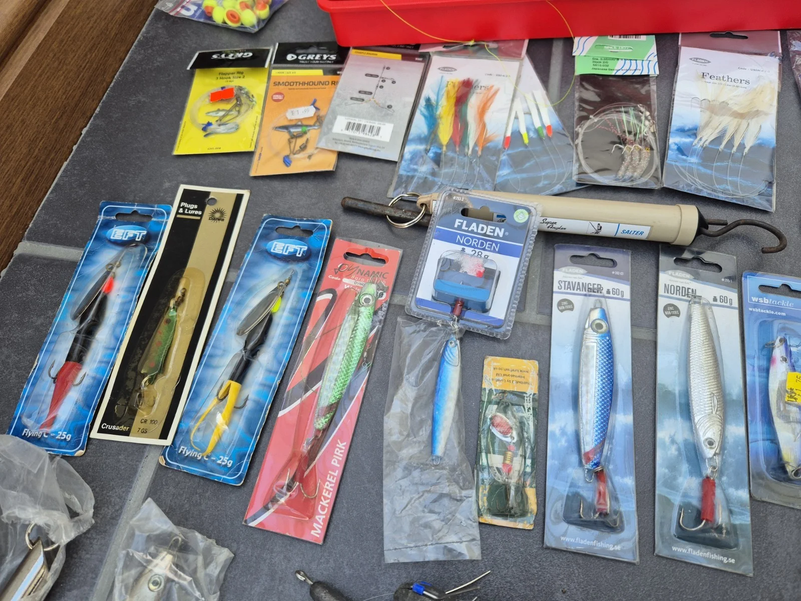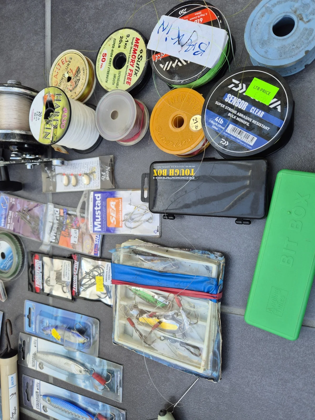 Large fishing tackle box loaded with sea fishing rigs, hooks, lures, weights, line, shock leader, Daiwa Sea Fishing Reel, ABU Ambassadeur & Penn Multiplier Reels, Good Condition.