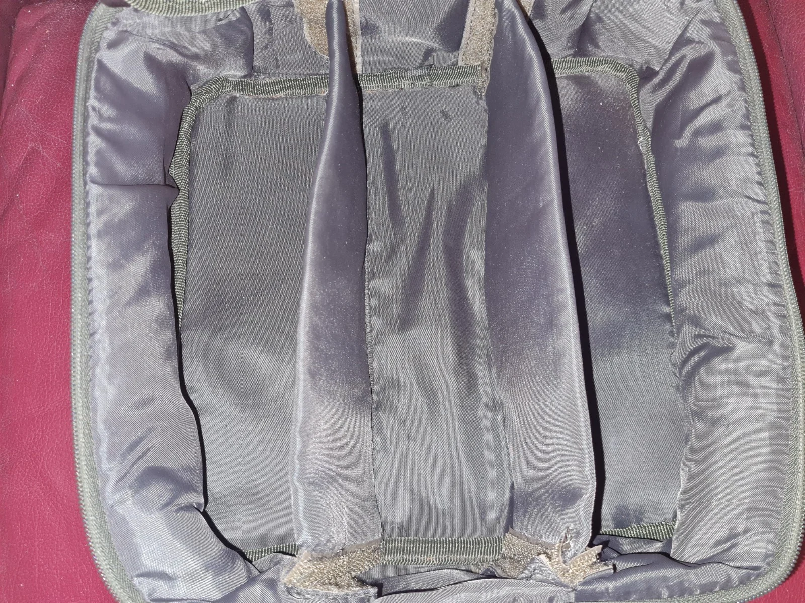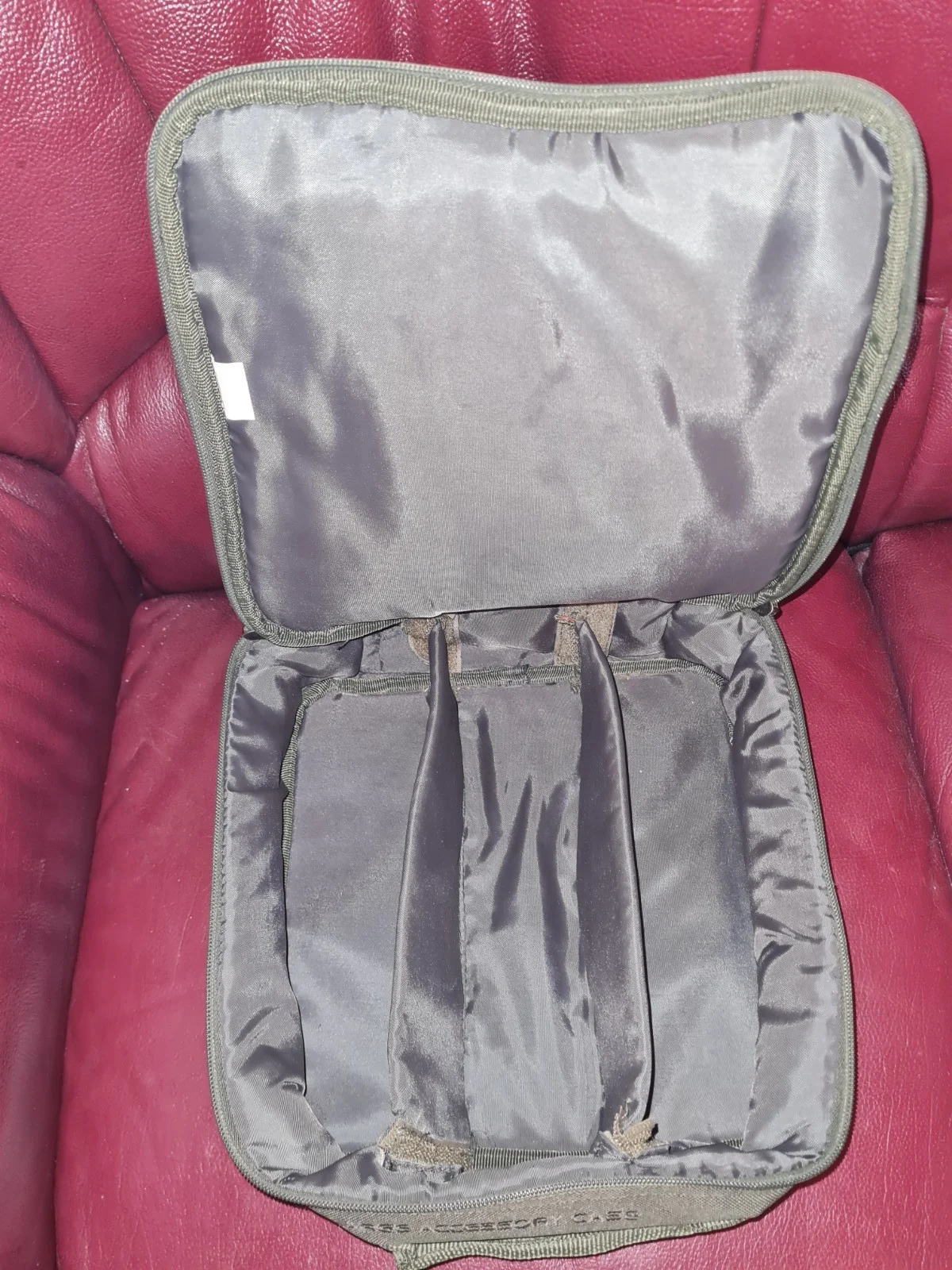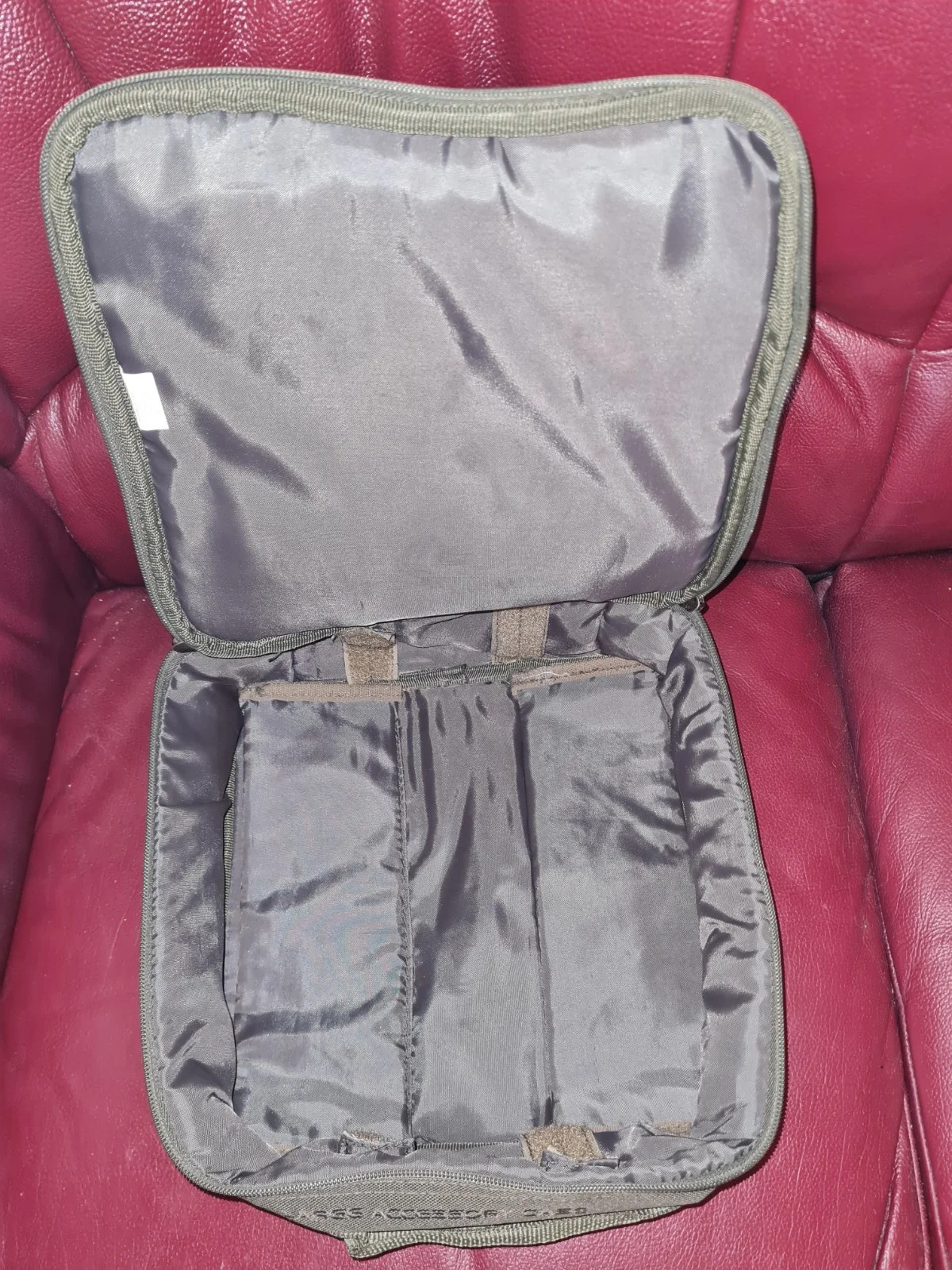 in good used conditionthere is three compartments inside with velcroed in place partitions. I folded down these partitions and used the case for my plates, cutlery, cup etcthe size of the interior is approx 28cm by 28cm and is approx 9cm deep