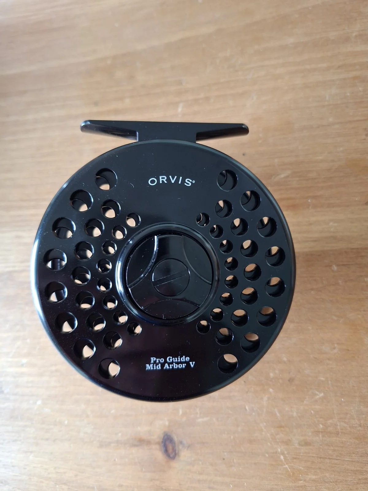 Orvis pro guide mid arbor v fly reel. Ideal reservoir, sea trout size reel. Takes up to a wf9 plus 150m. Excellent condition, used once but has very small markings on the rim. See photos. Overall a lovely reel with many years use to be had.UK bidders only please.