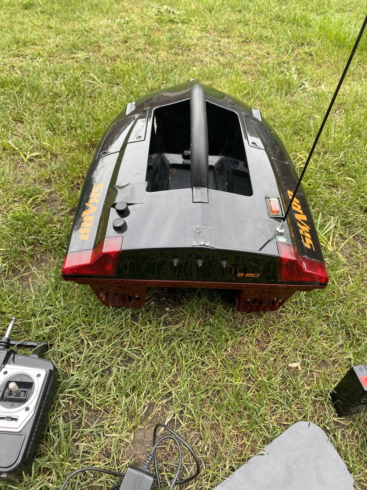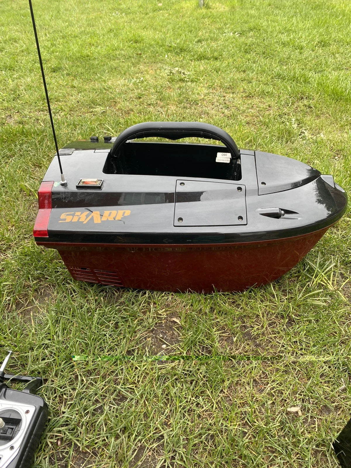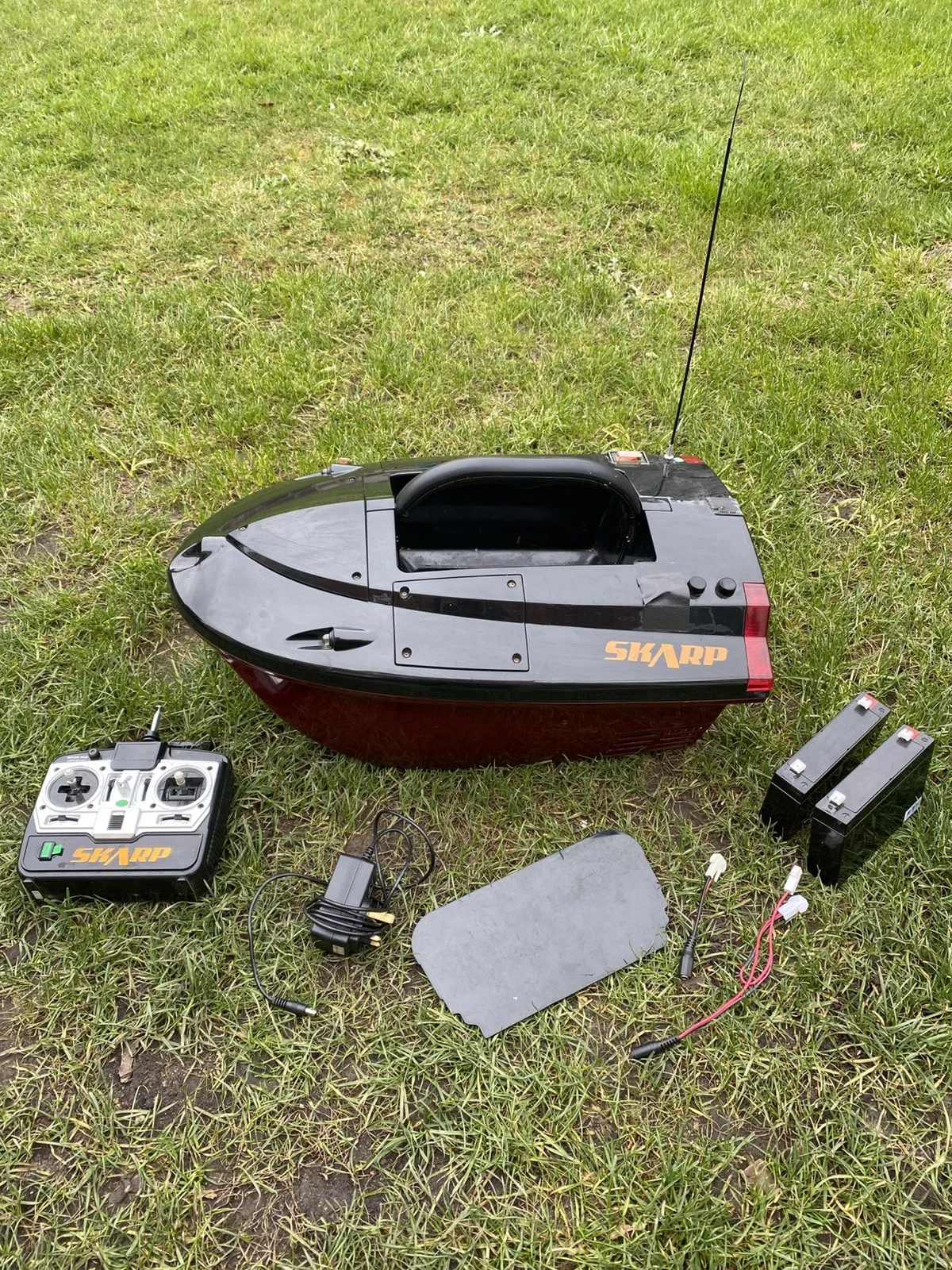 RC Fishing Bait Boat with 2 Motors and Wireless Single Hand ControlThis RC Fishing Bait Boat is designed for freshwater fishing, equipped with 2 motors and a wireless single hand control.The boat features LED lights, a rechargeable battery and charger and comes with a remote control and 2 sets of batteries included( second set not seen on photos as they are in the boat). Black on top and red sits in water colour. All Works as it should. Used for a a couple of trips to France comes with carry bag. Collection only Solihull or can meet in the Birmingham area