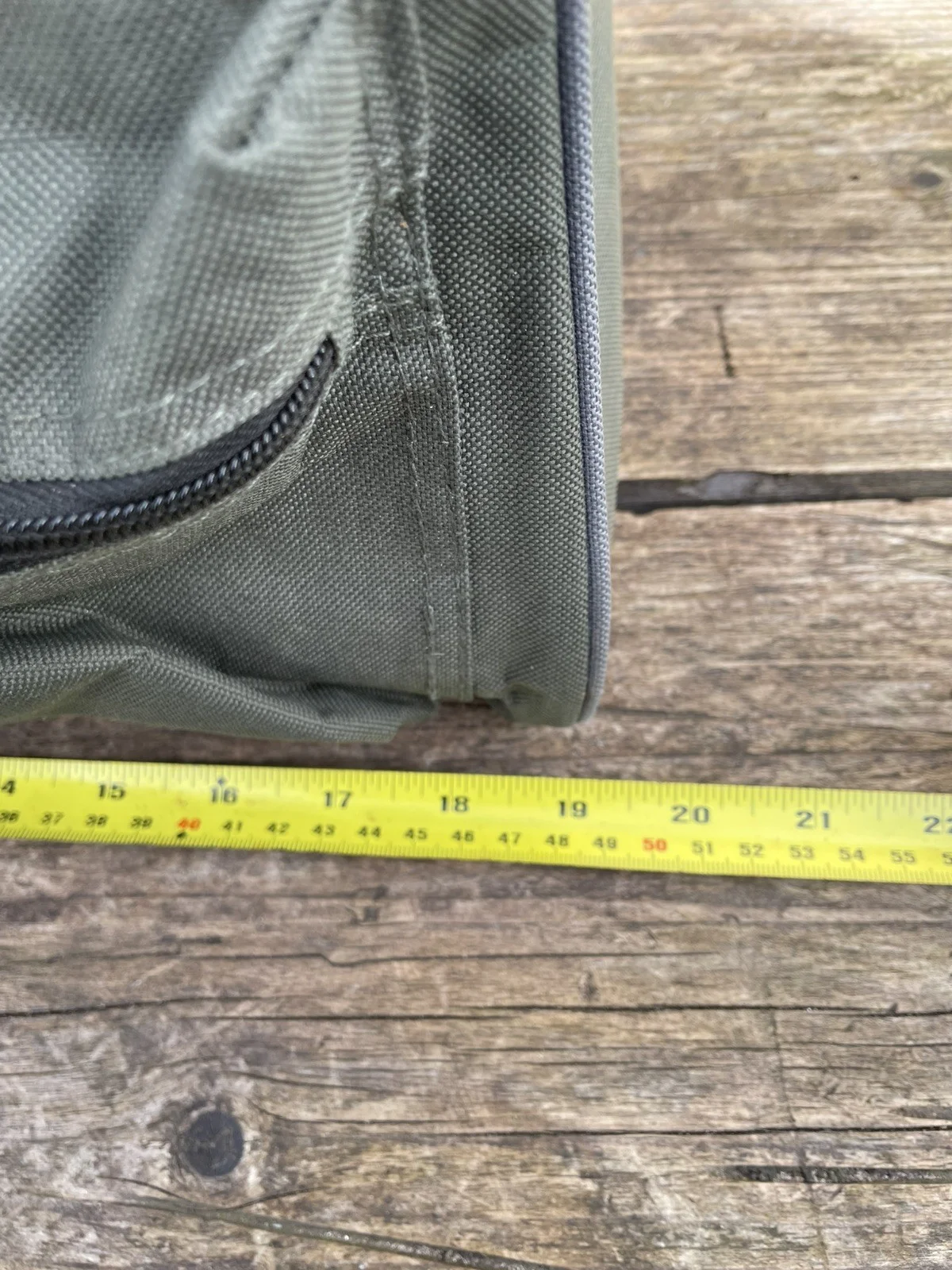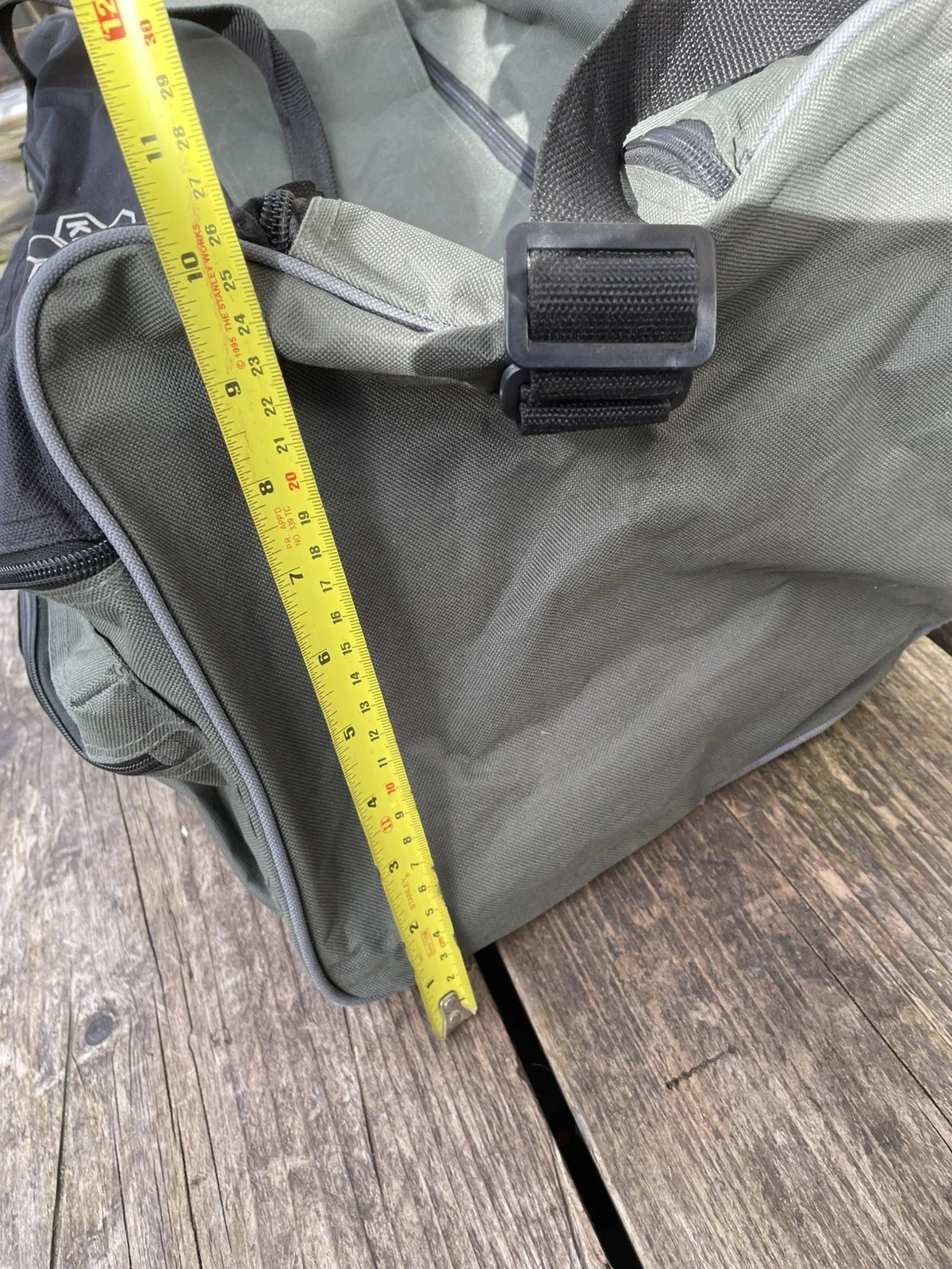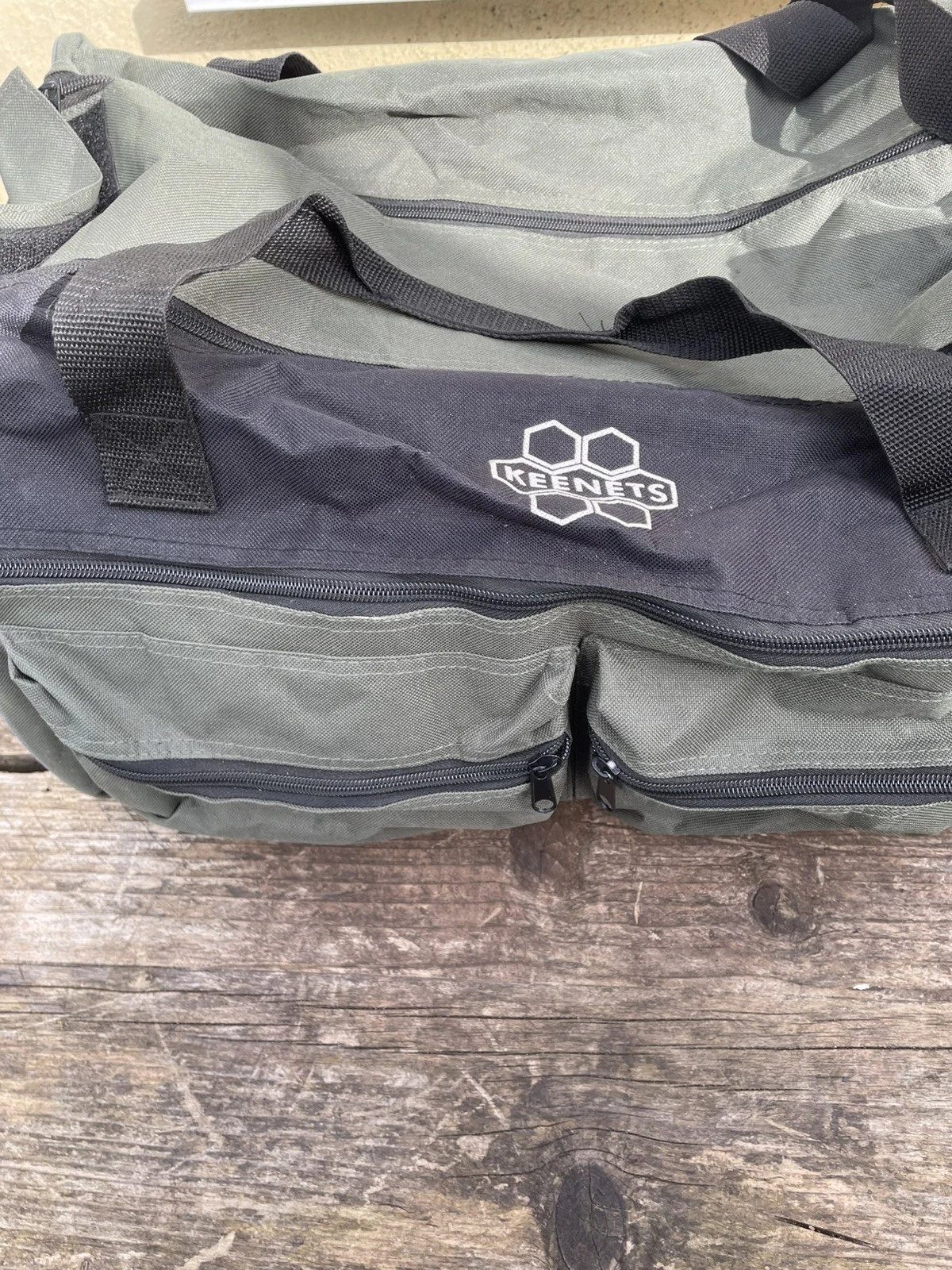 keennets fishing bag with shoulder strap ,missing one of the plastic feet/button on the base makes noe difference has been used , condition is good size as per photos