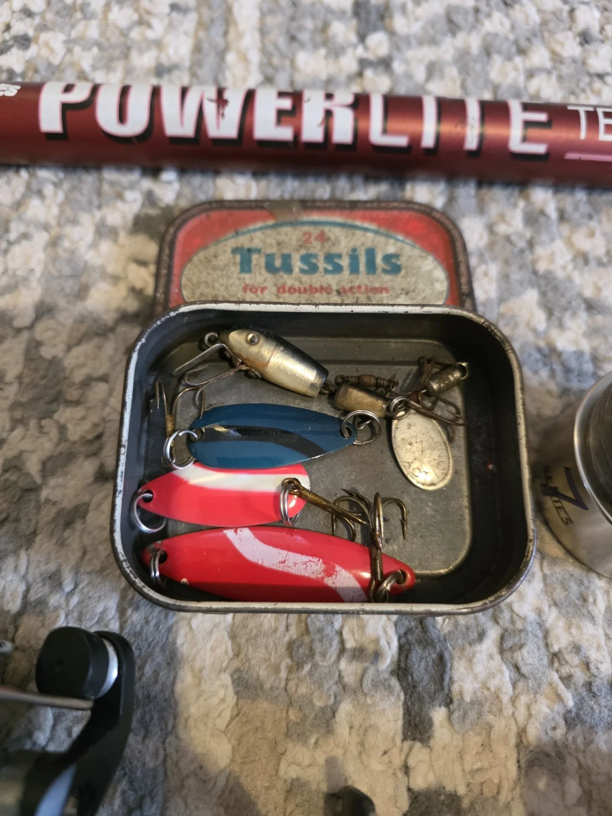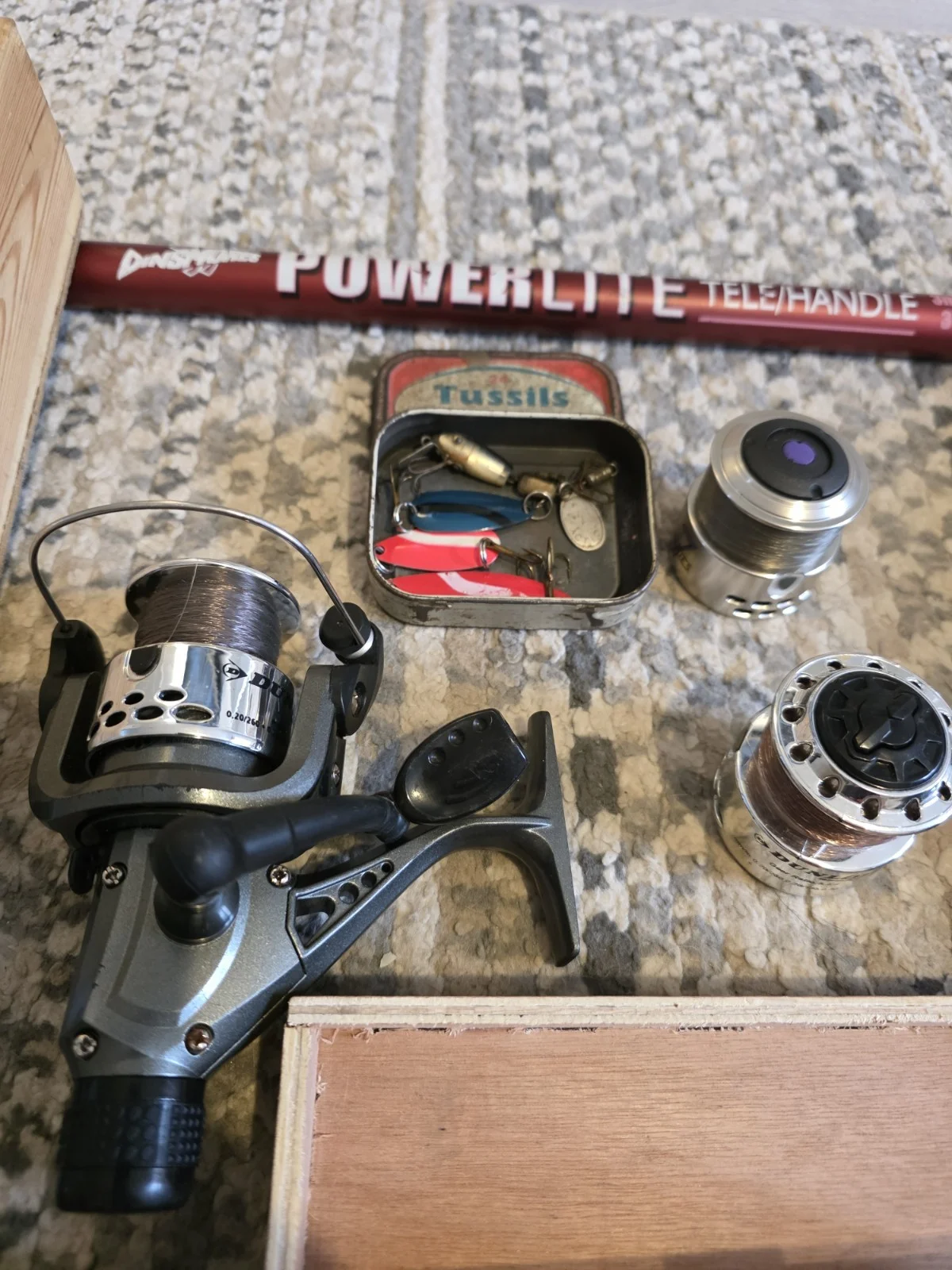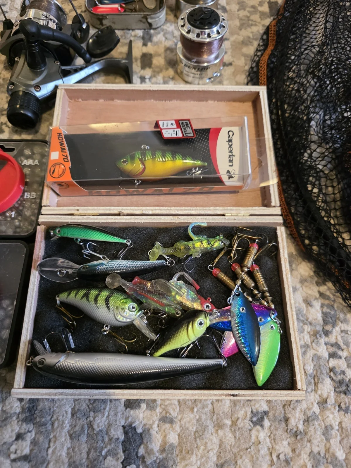 theres new used and vintage lures and spinner (barbed) I havnt used myself.3m landing net good condition hardly used no taresDunlop reel with 2 extra heads. havnt used myselfleaders tripple hooked new/ hookless leadersshot weights