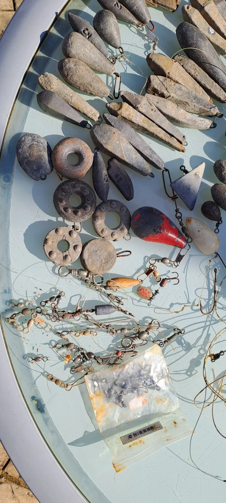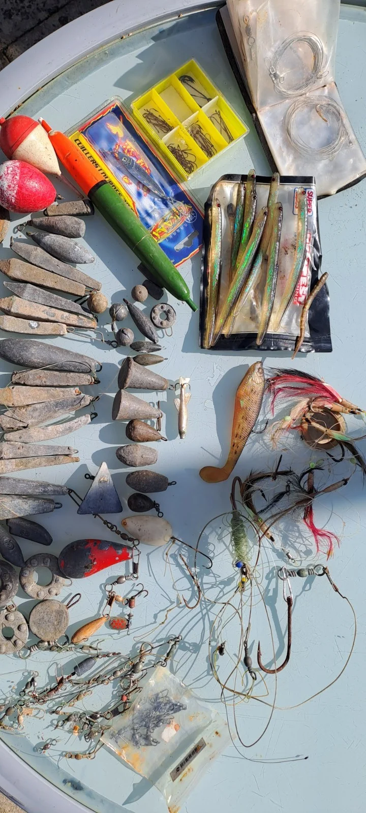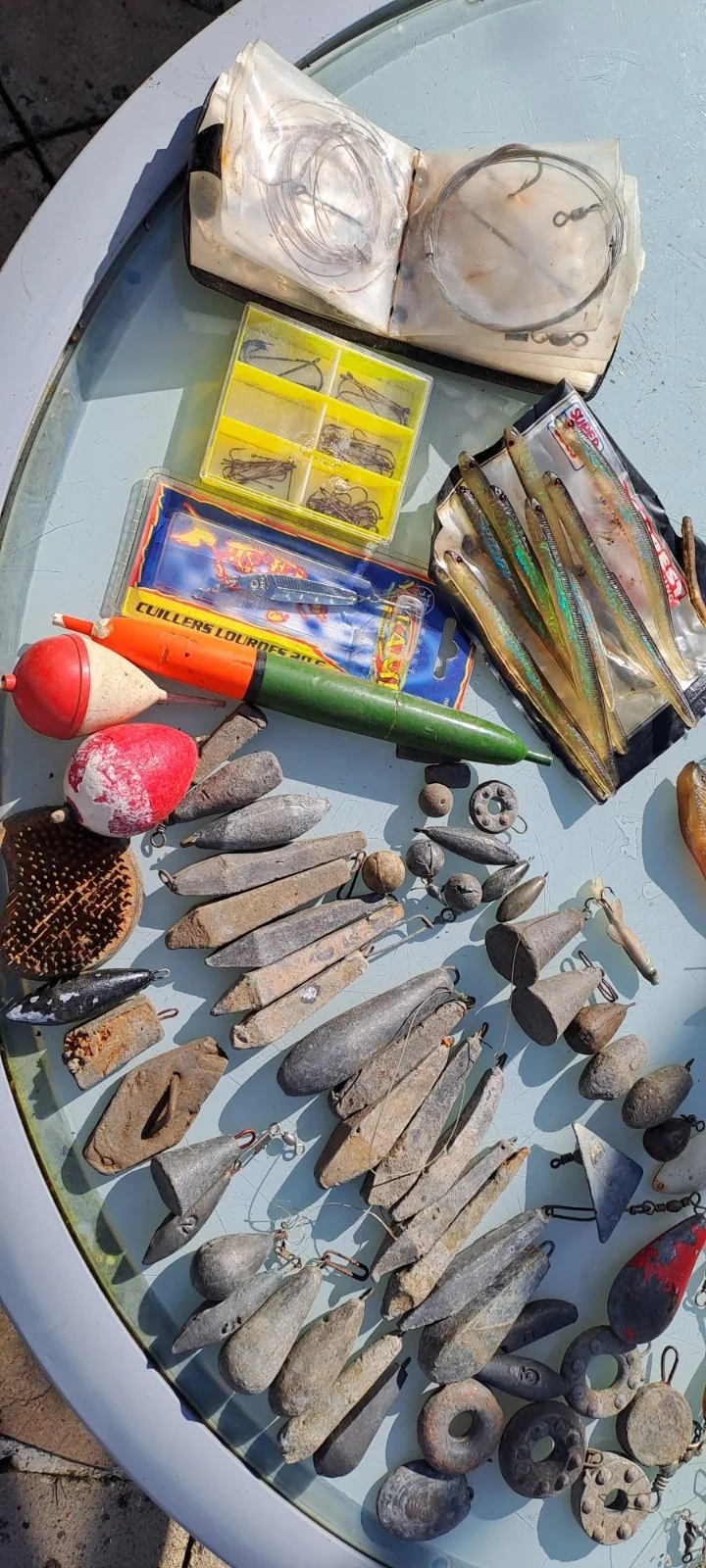 various assortment of fishing equipment, including 54 leisure weights.collection only as heavy. bidding is for gear only, not table.