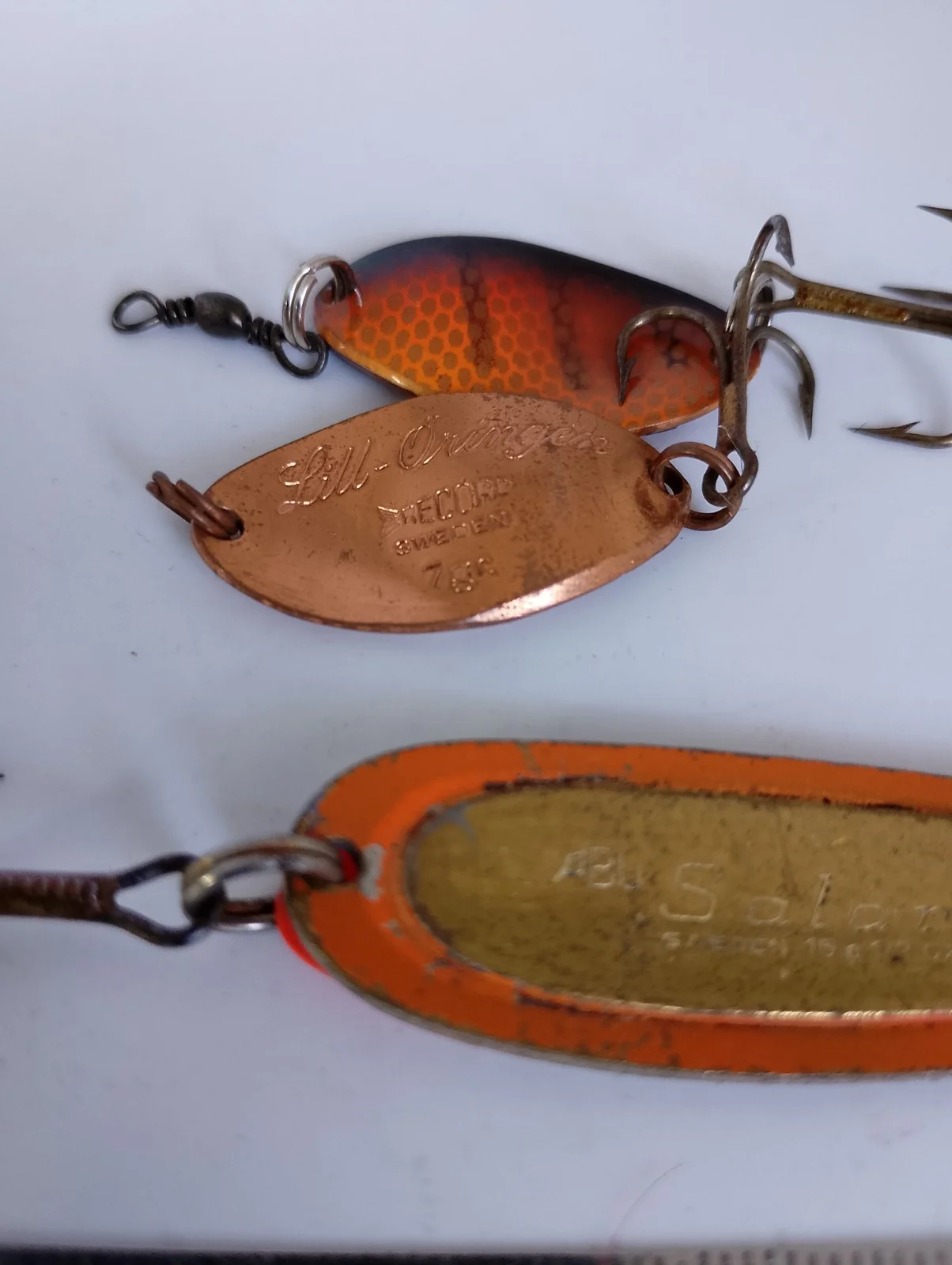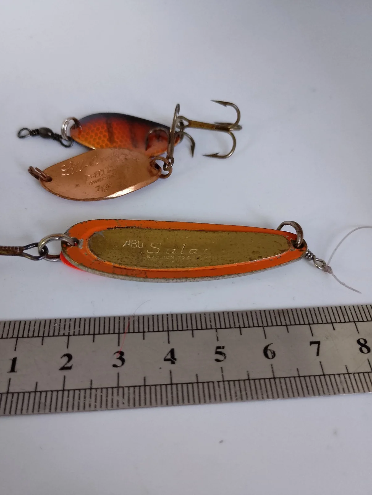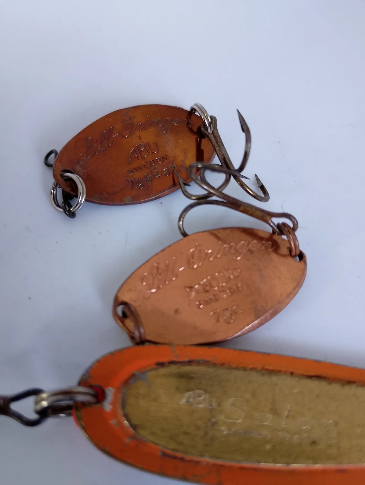 3 vintage Abu lures. 1 is an Abu 15g solar, 1 is a painted 7g Lille orangery and the other is a Lille orangery which is unpainted.