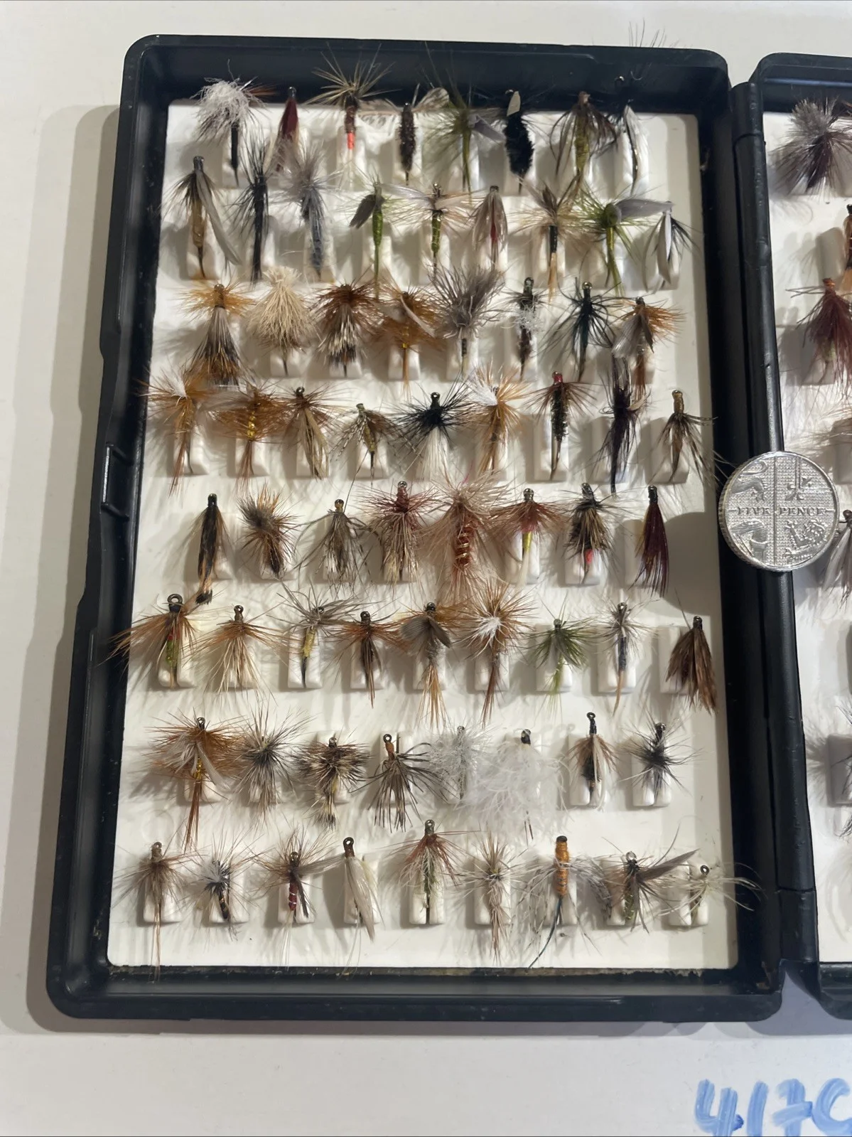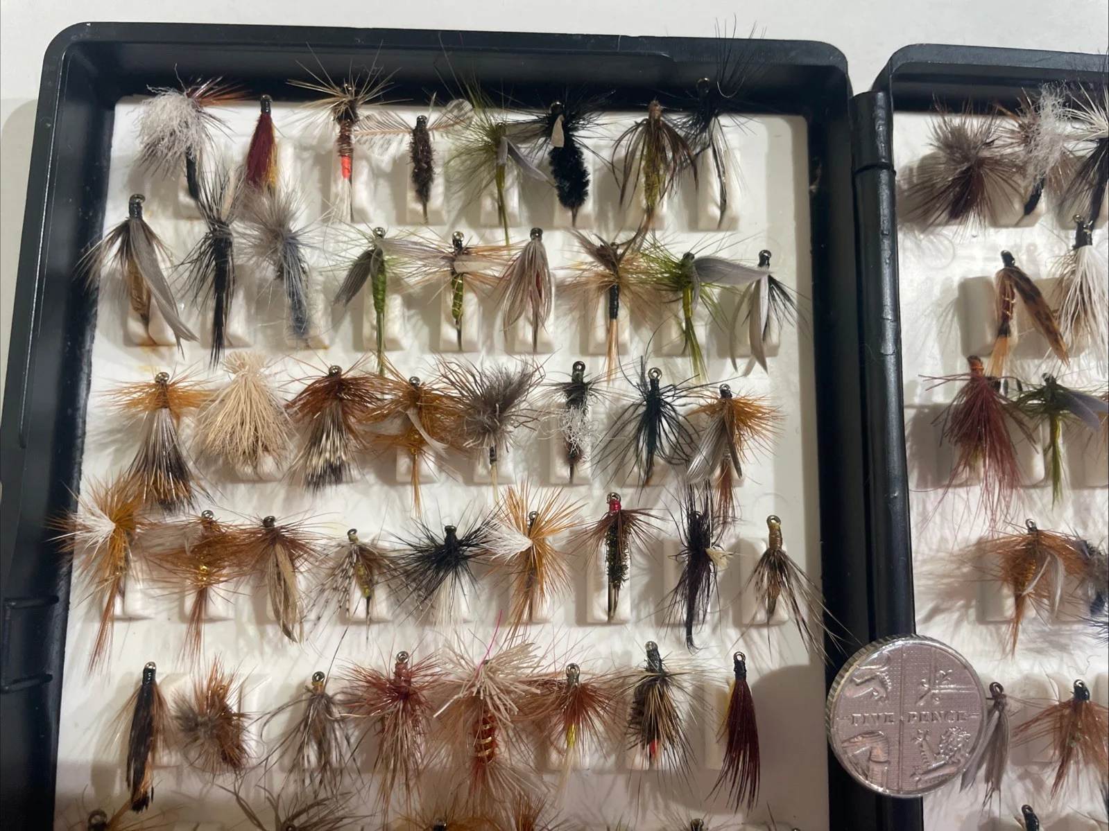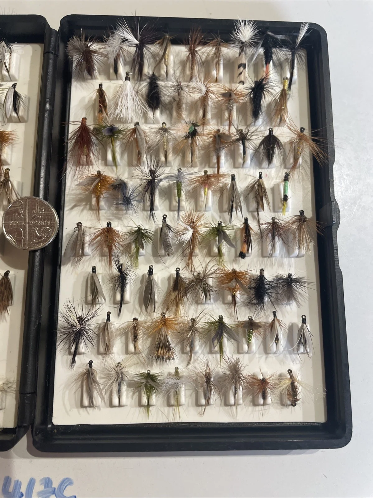 Fox Box Fly Box Black Dry & Top Water Flies 136 Flies Total Trout Fly FishingUsed box, in excellent clean condition, new and used flies, all in good condition - different sizes & colours with a good variation Box measures:15.3cm x 10.2cm x 2.4cm(approx.)For international postage, please contact us direct for a shipping quote, for outside of the UK - Thank youPlease also look at our other items as lots to be listed Any questions please feel free to askTight Lines & Happy Bidding