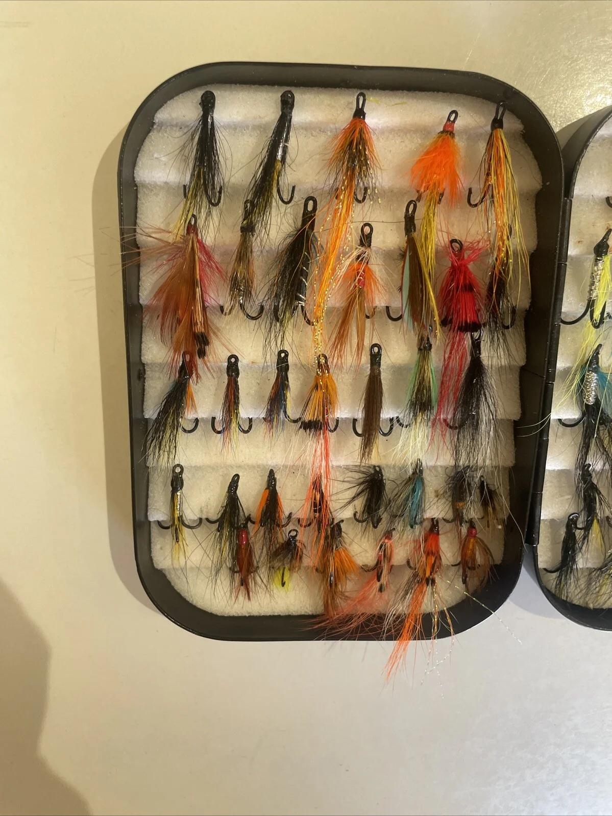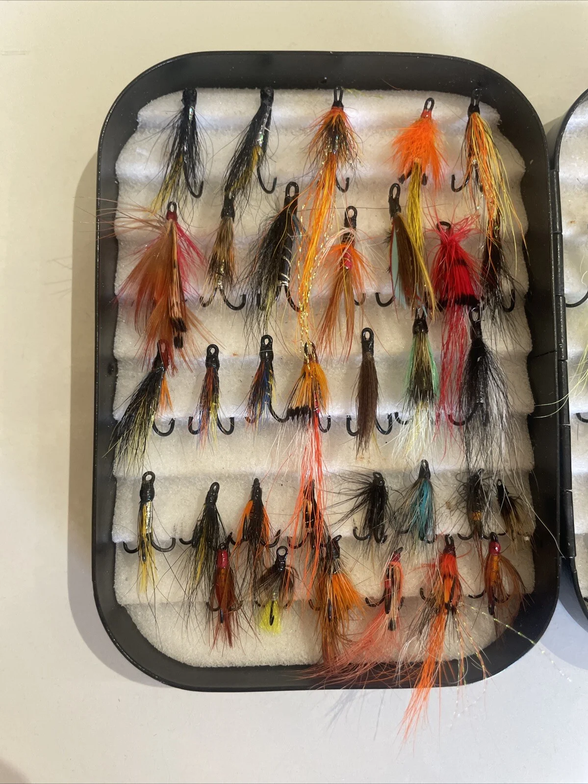 Richard Wheatley Fly Box Black With 75 Double & Treble Salmon & Sea Trout FliesBox is used but in good condition - new and used flies all in good conditionMeasurements of box: Length: 12.5 cmWidth: 9 cmHeight: 3 cm(approx.)For international postage, please contact us direct for a shipping quote, for outside of the UK - Thank youPlease also look at our other items as lots to be listed Any questions please feel free to askTight Lines & Happy Bidding
